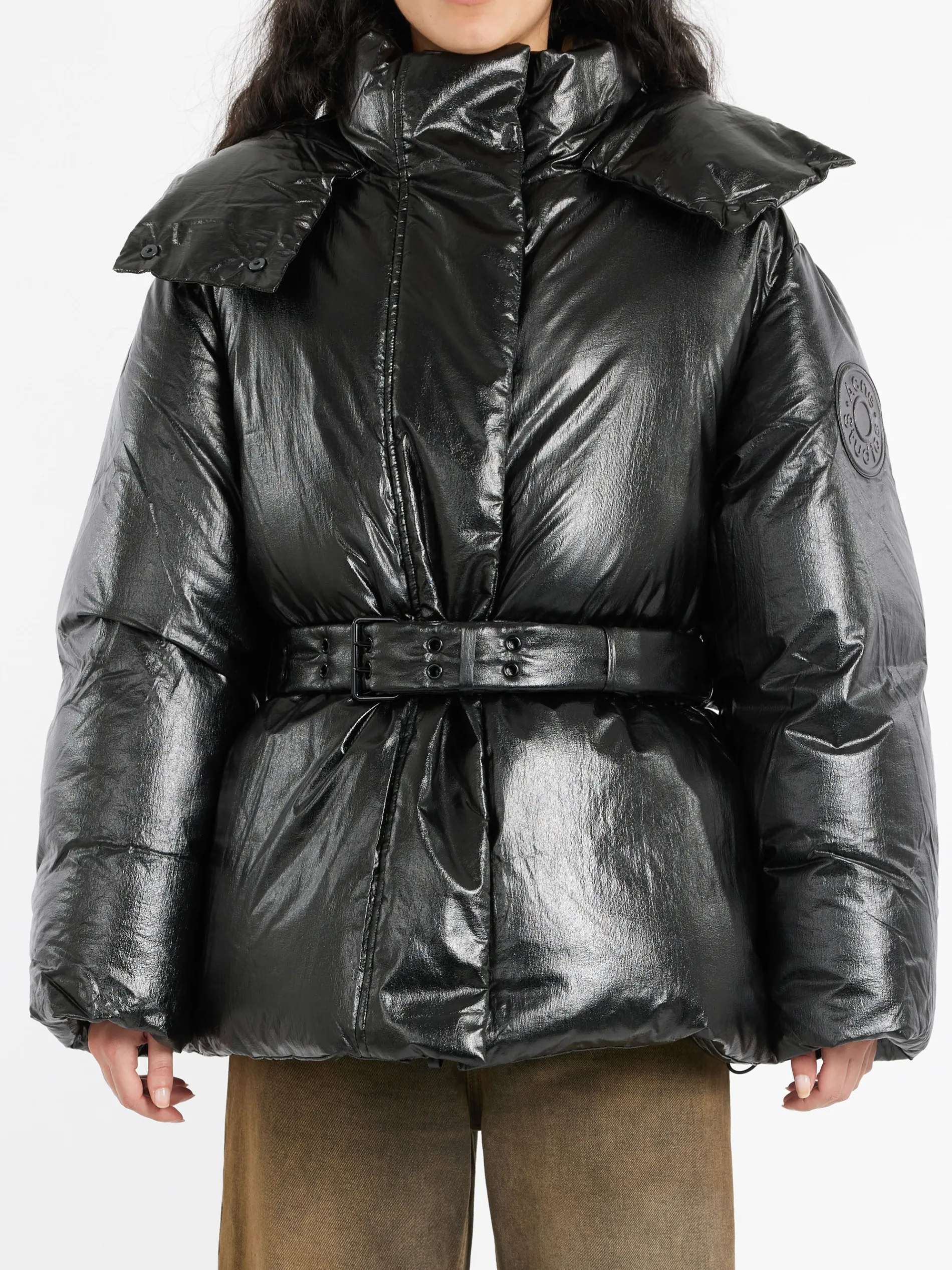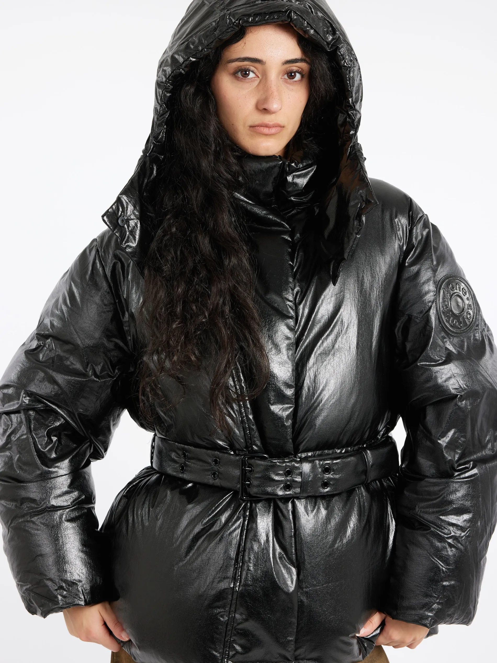 Puffer jacket is crafted from water-repellant nylon with a shiny coated finish, detailed with an Acne Studios logo patch at the sleeve. Cut to a relaxed fit and below hip length.
