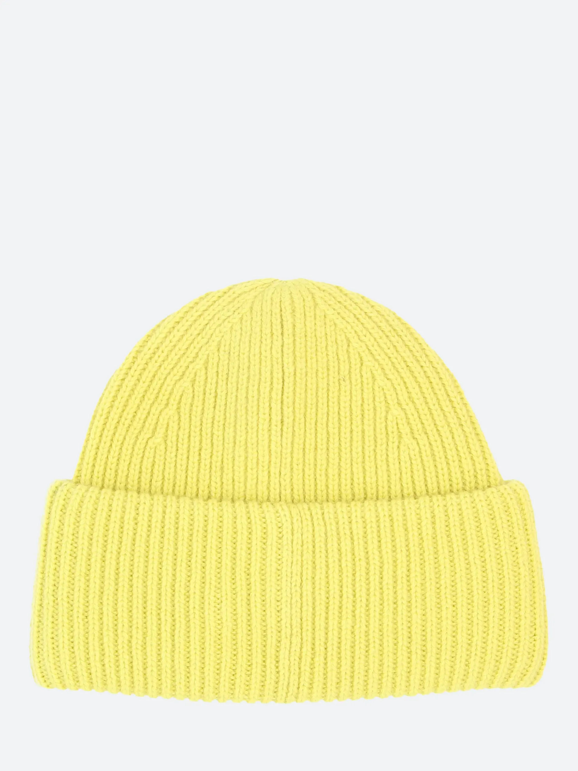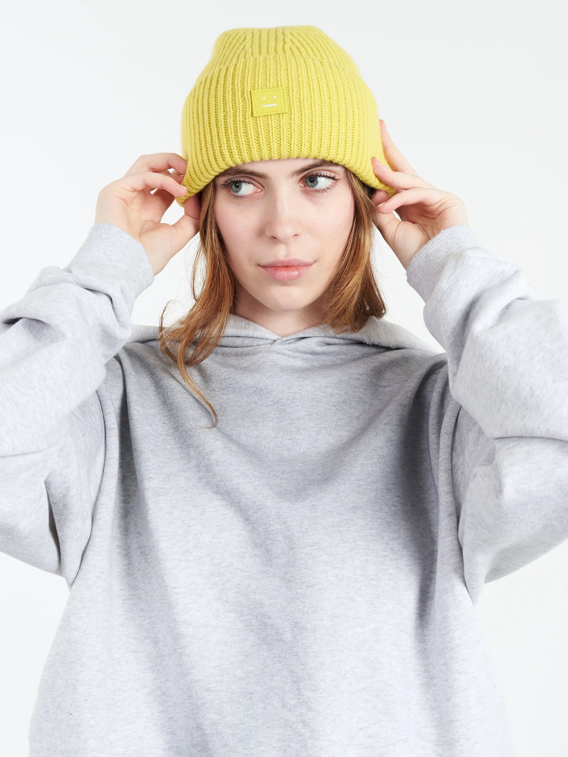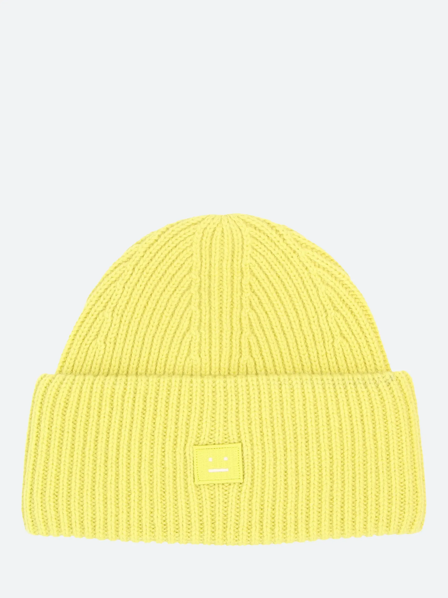Knit beanie features a small embroidered face logo patch and ribbed detailing, crafted from chunky wool.