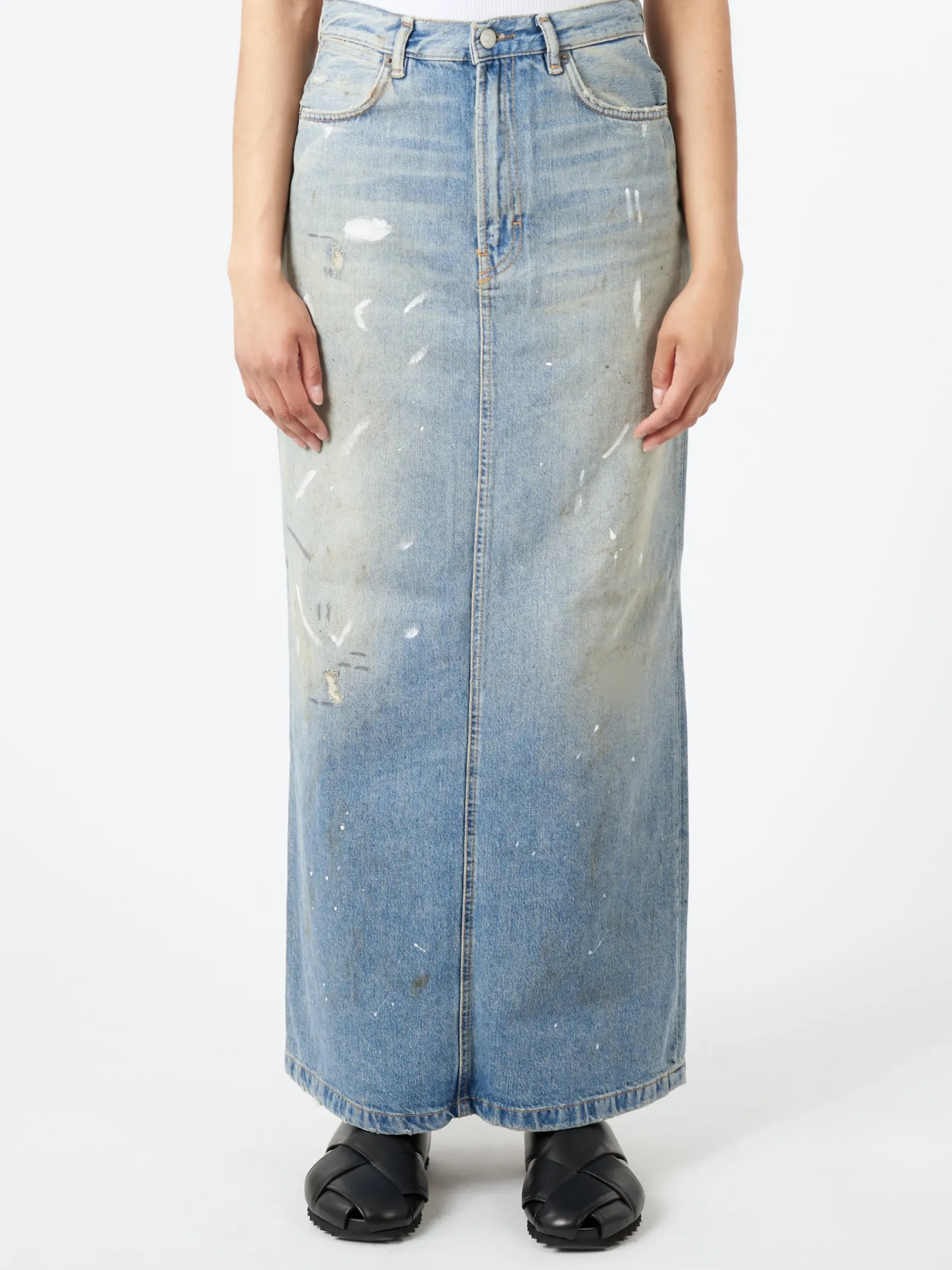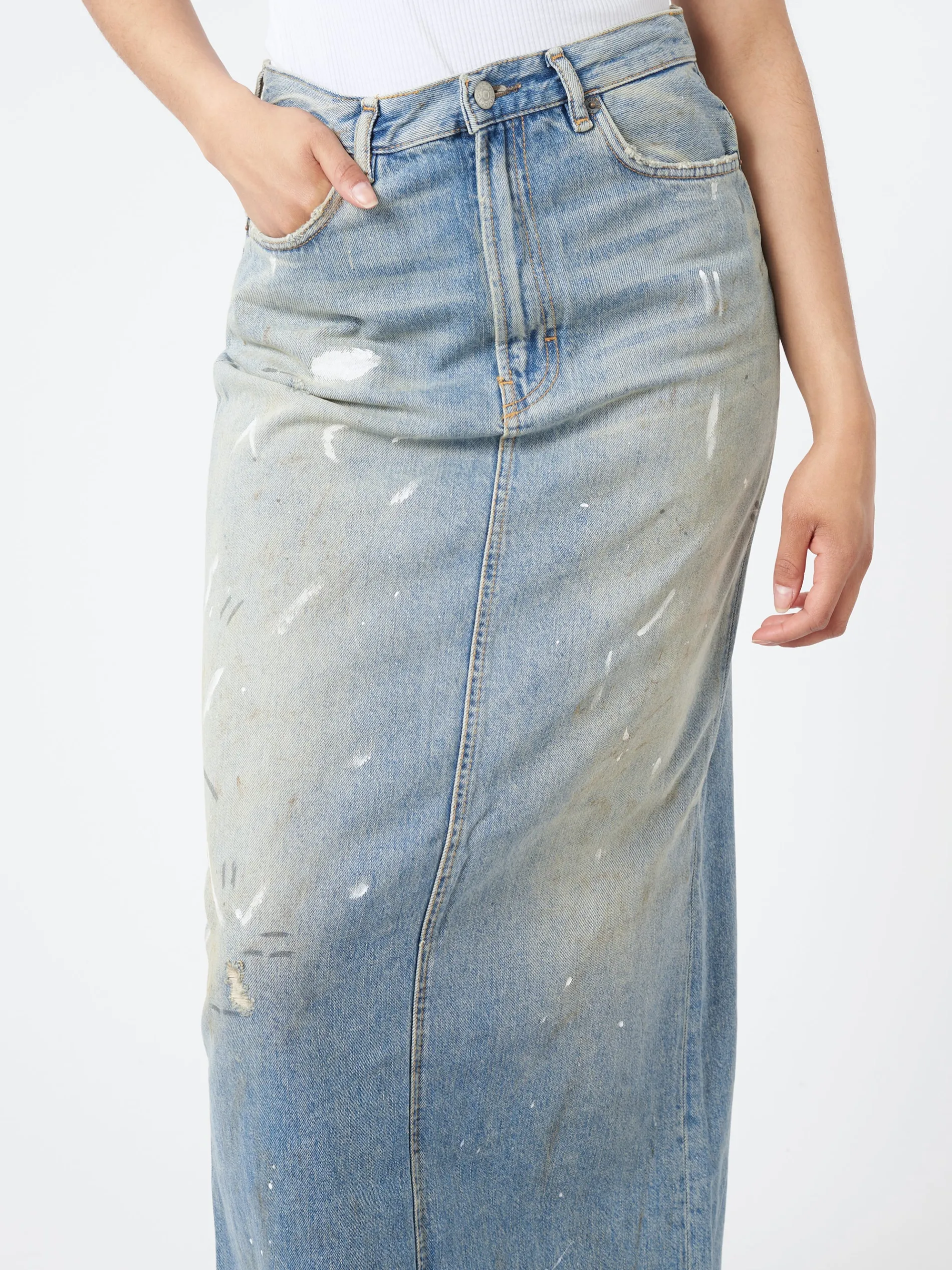Skirt is cut to a regular fit with a straight shape. Crafted from non stretch denim in a light blue wash.