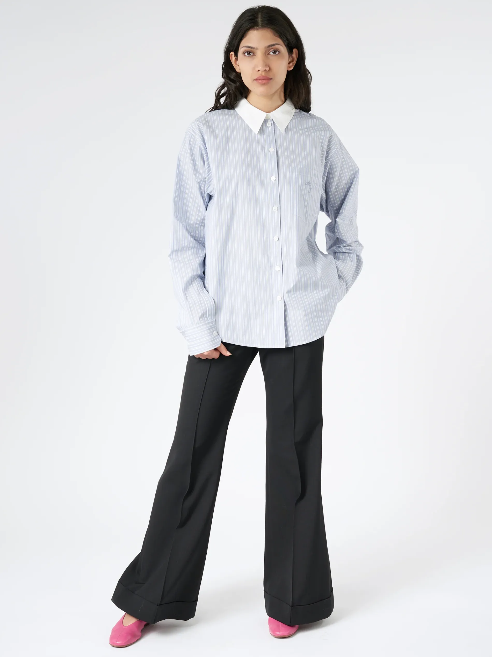 Acne Studios tailored trousers are crafted from a wool blend, detailed with front topstitched leg pleats and fold-up hem. Cut to a regular fit with a mid-waist, flared leg and long length.