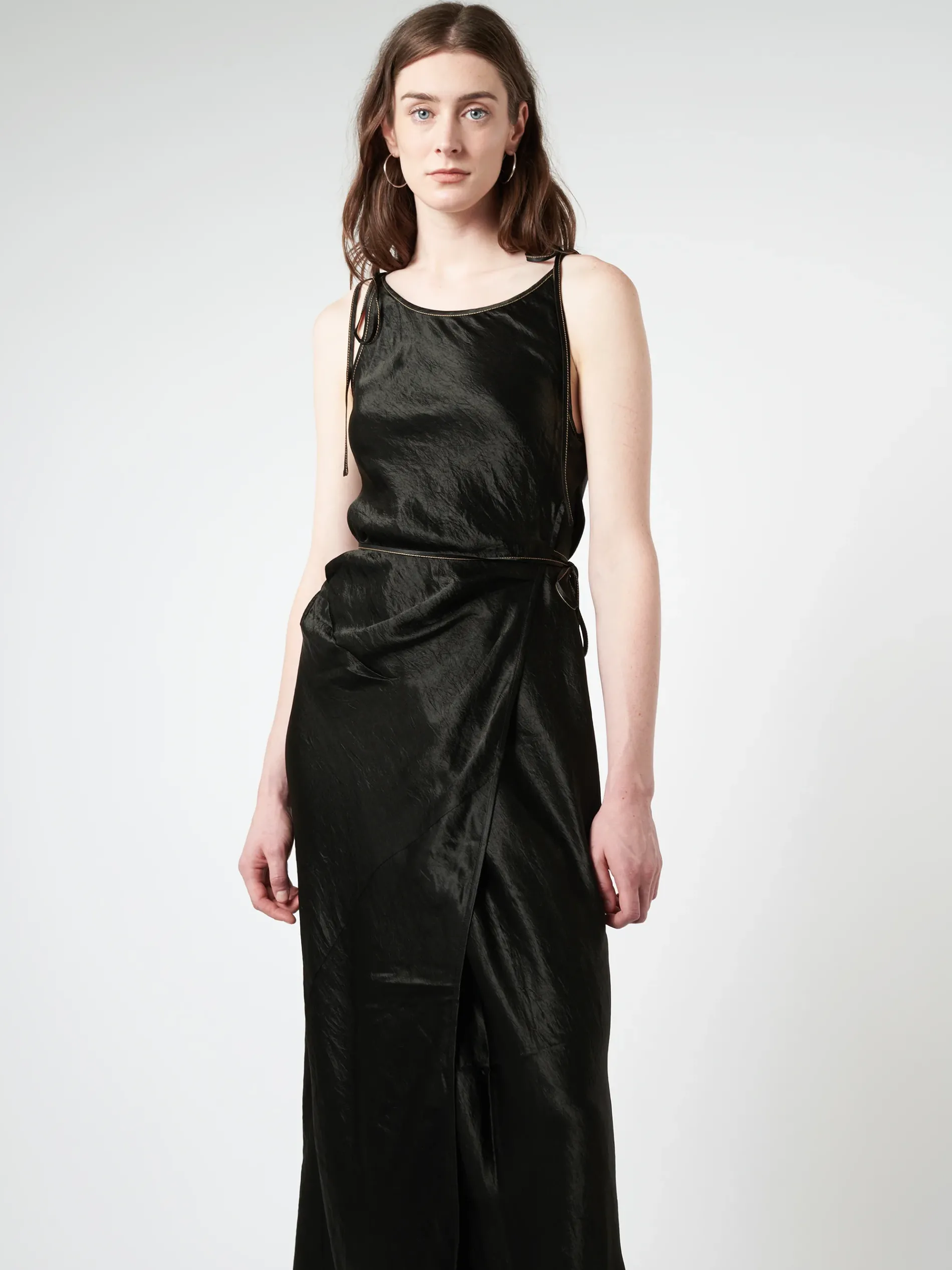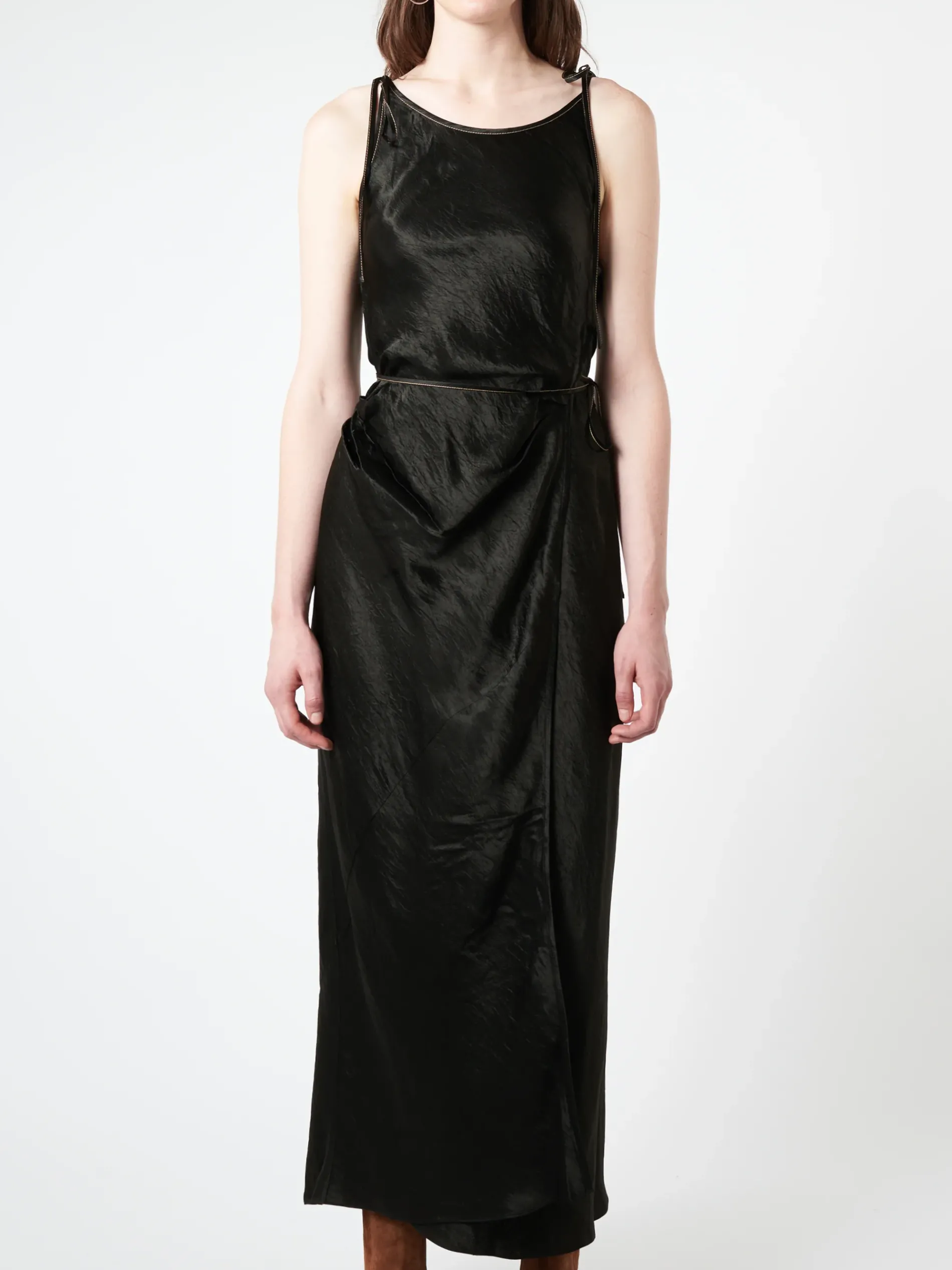 Acne Studios strap dress is crafted from a fluid satin fabric with a tie-up wrap construction and pleated waist detailing.