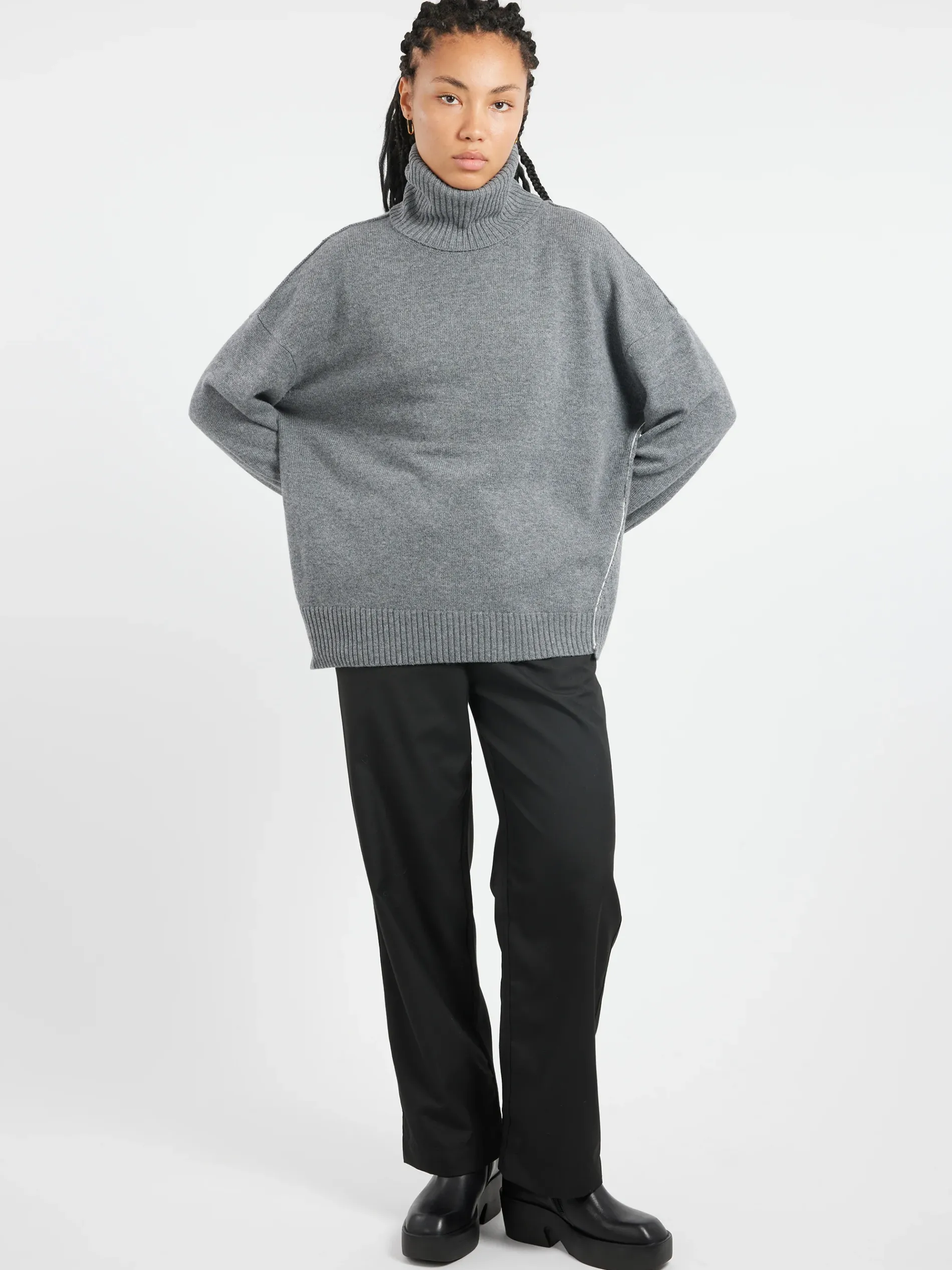 Labi knit with asymmetric bottom, long ribbed sleeve cuff and long roller neck featuring link thread in contrast color.