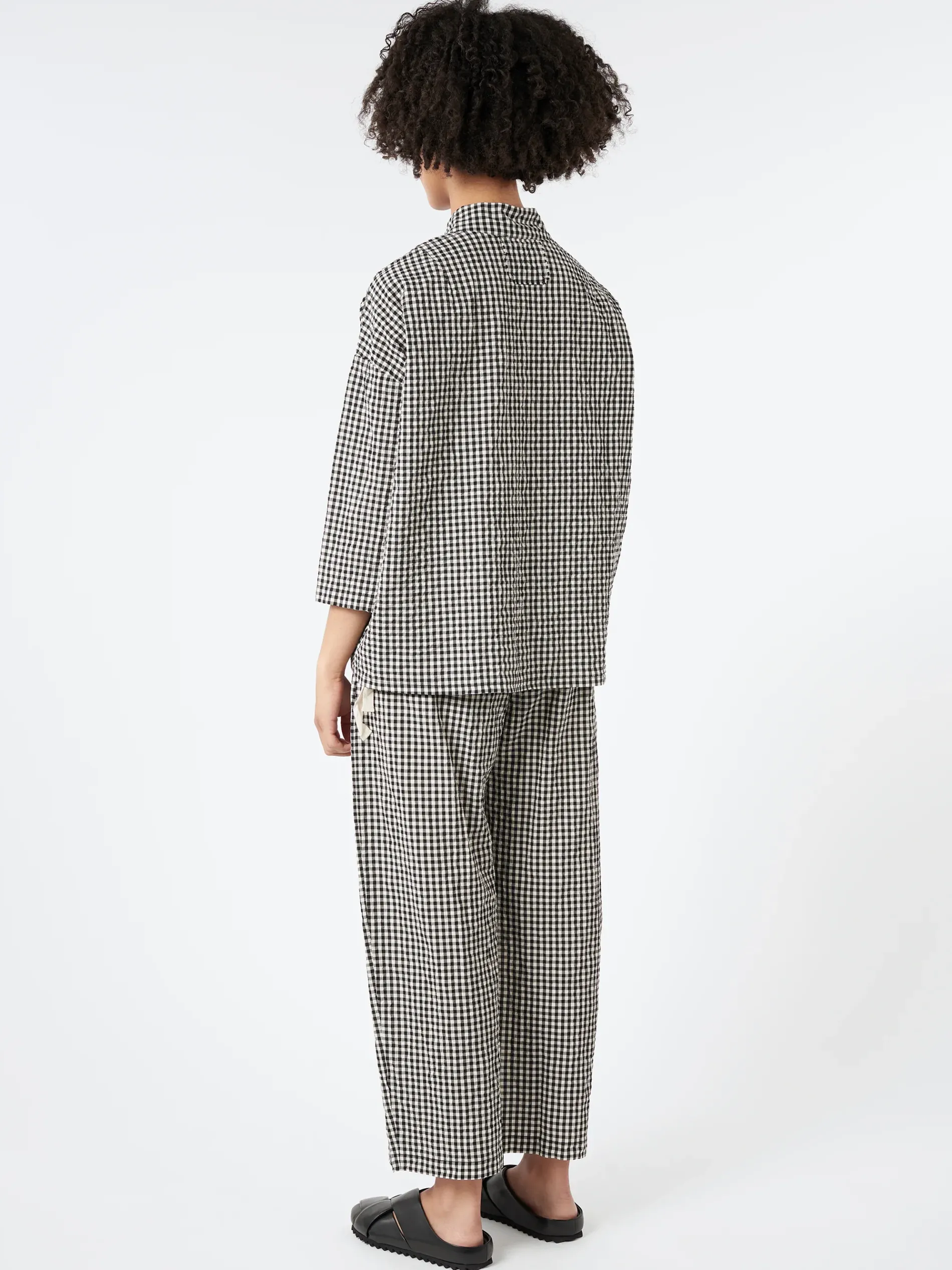 Wide hip-length shirt in checkered seersucker made of washed cotton and elastane.