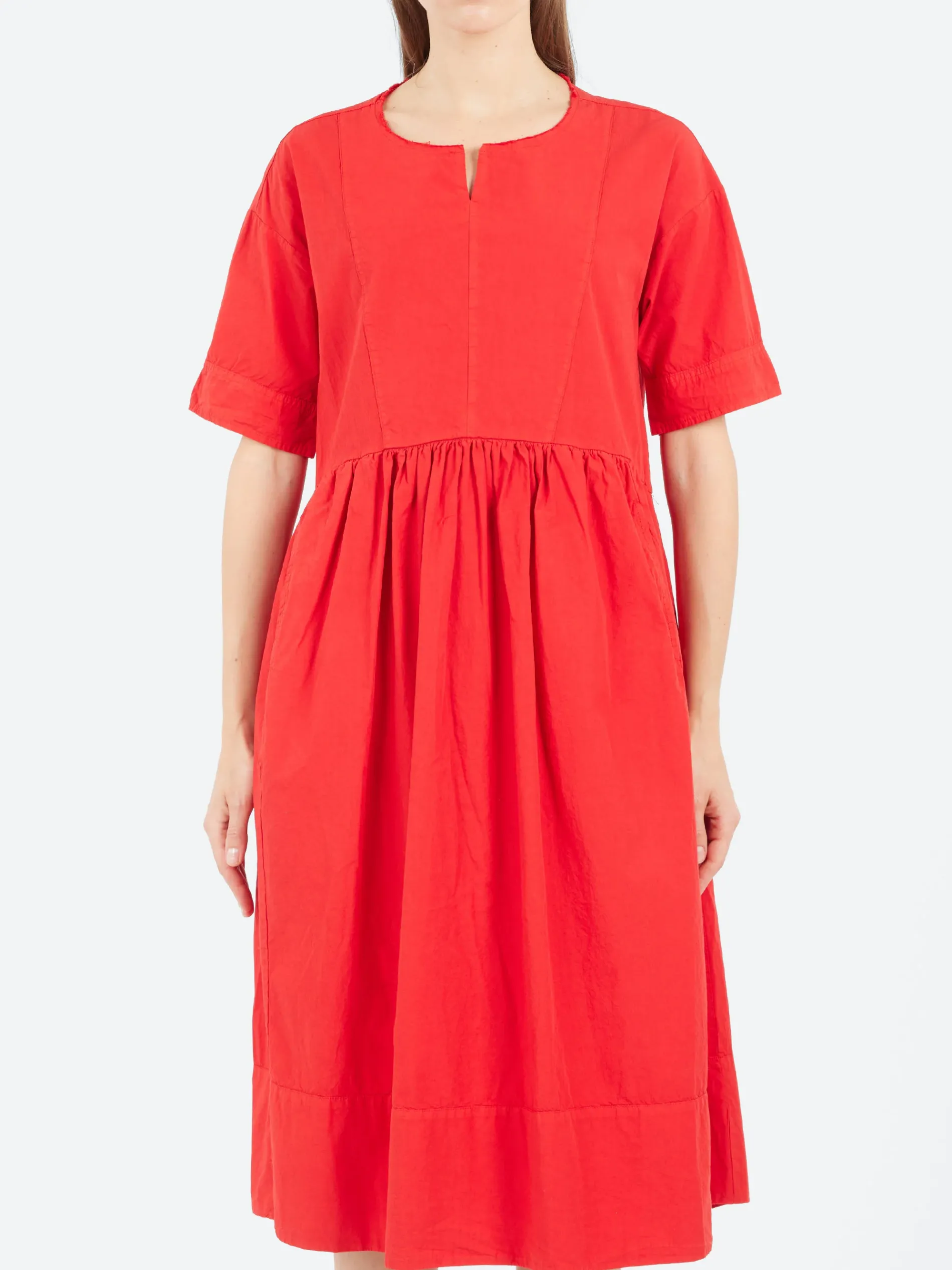 This Aequamente Dress is expertly crafted from high-quality crisp cotton, combining elegance and comfort. The fitted upper and gathered skirt create a flattering silhouette, while side seam pockets add a practical touch. With its timeless round neckline, this dress is perfect for any occasion, offering both style and ease.