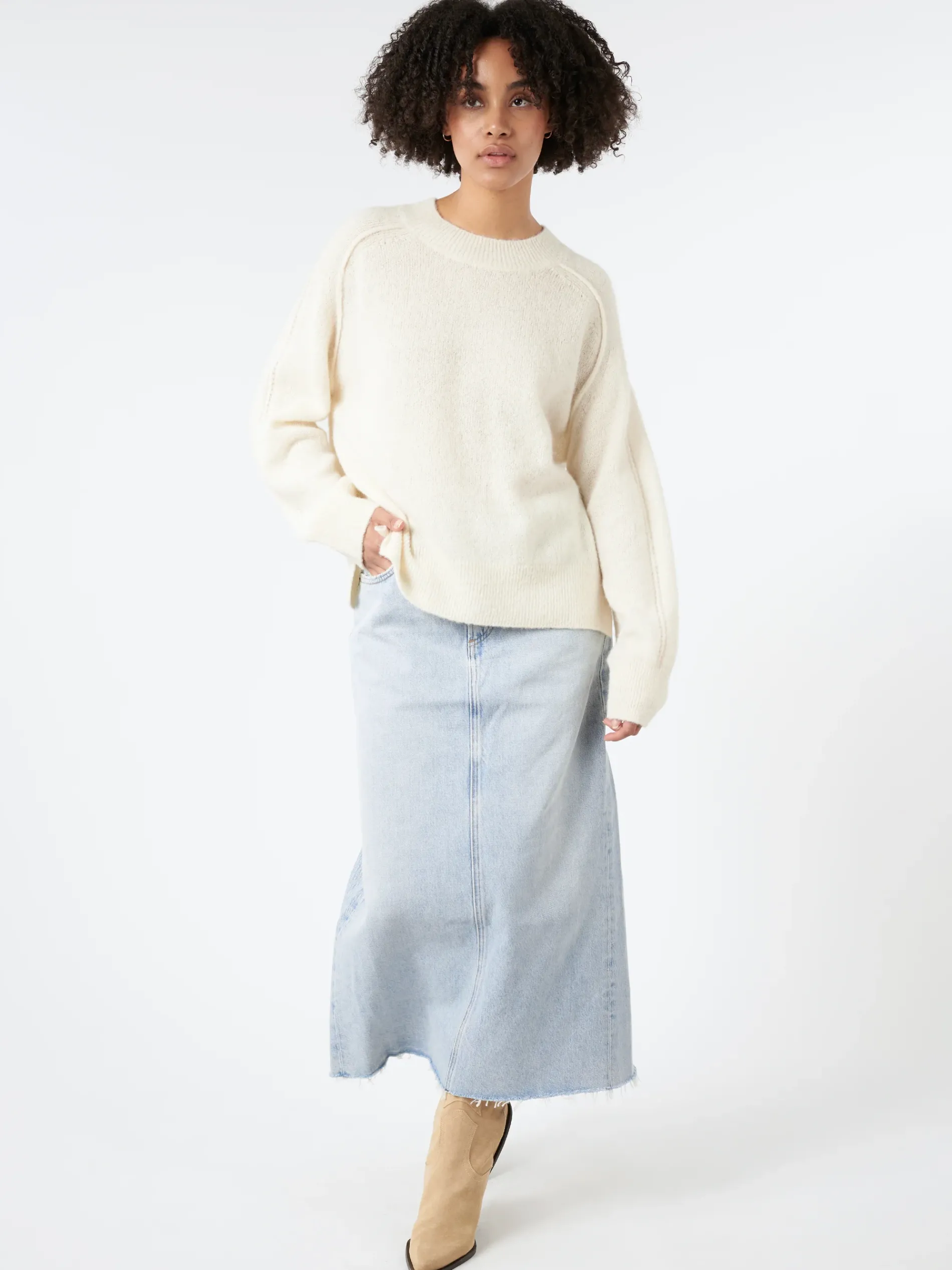 The Della skirt sits square on the hip with a modern ankle grazing length.