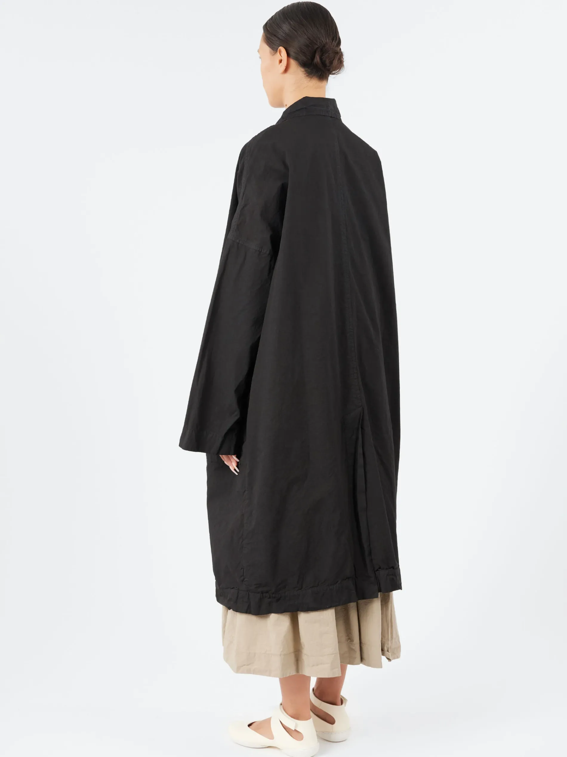 The Album di Famiglia oversized A-line coat is crafted from compact cotton canvas, offering both warmth and texture. It features a small notch collar and large patch pockets, blending practicality with contemporary style. The relaxed, oversized fit adds a chic, effortless laid-back feel. Unlined for breathability, this coat is an ideal choice for layering in warmer weather, providing a lightweight, breathable option without sacrificing style.