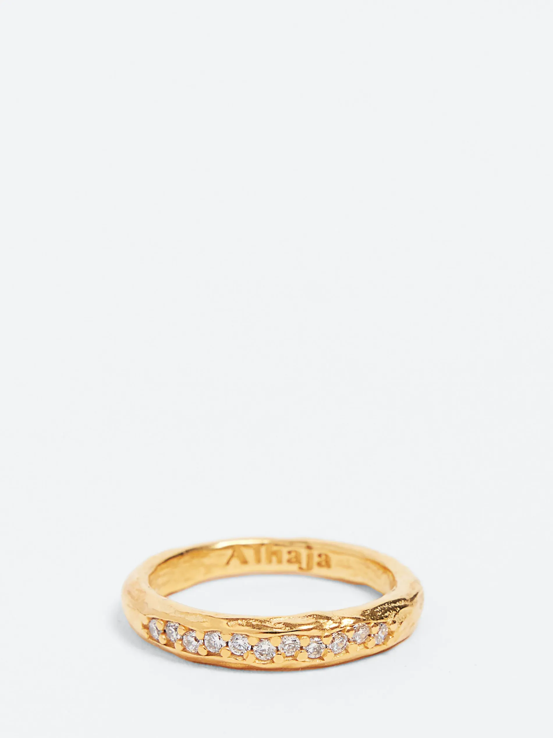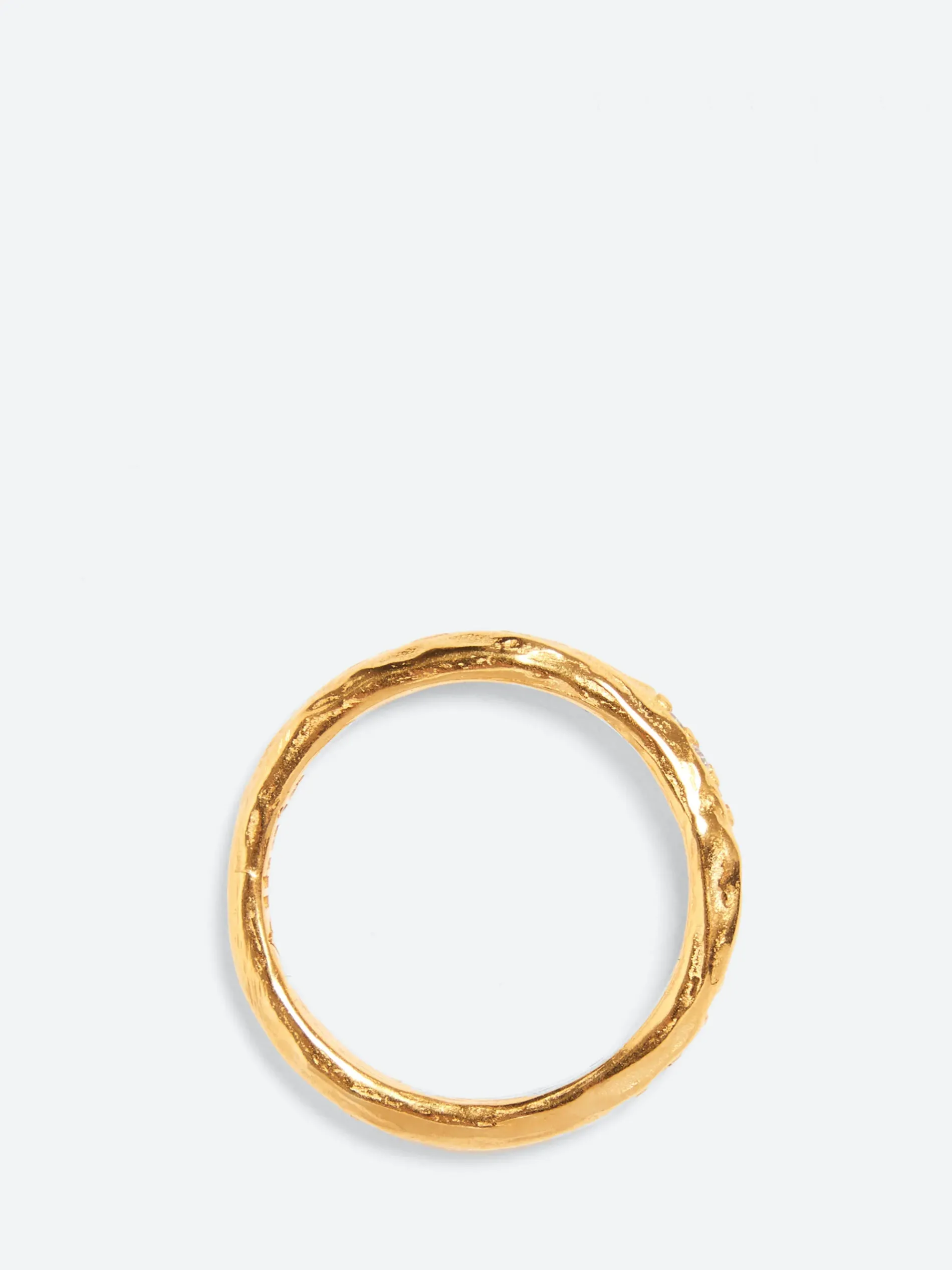 The Casilda Gold Ring from Alhaja is an elegant eternity band that combines timeless design with a touch of ancient inspiration. Crafted with a textured finish reminiscent of ancient relics, this ring features a row of carved zircons, adding a subtle sparkle to its rugged aesthetic.