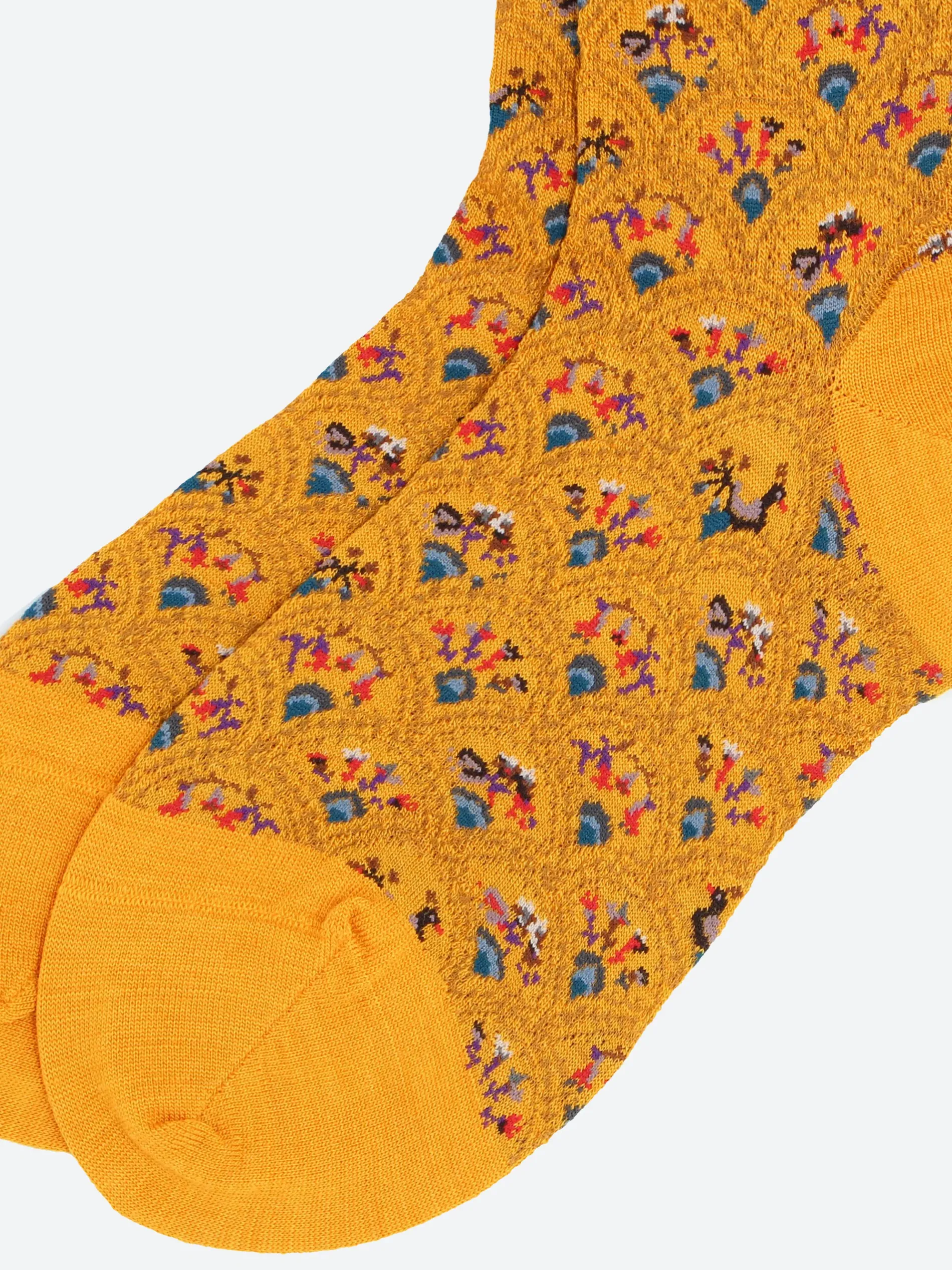 Antipast crew length socks with overlapping floral printed fans. Finished with a striped ruffle at the cuff.