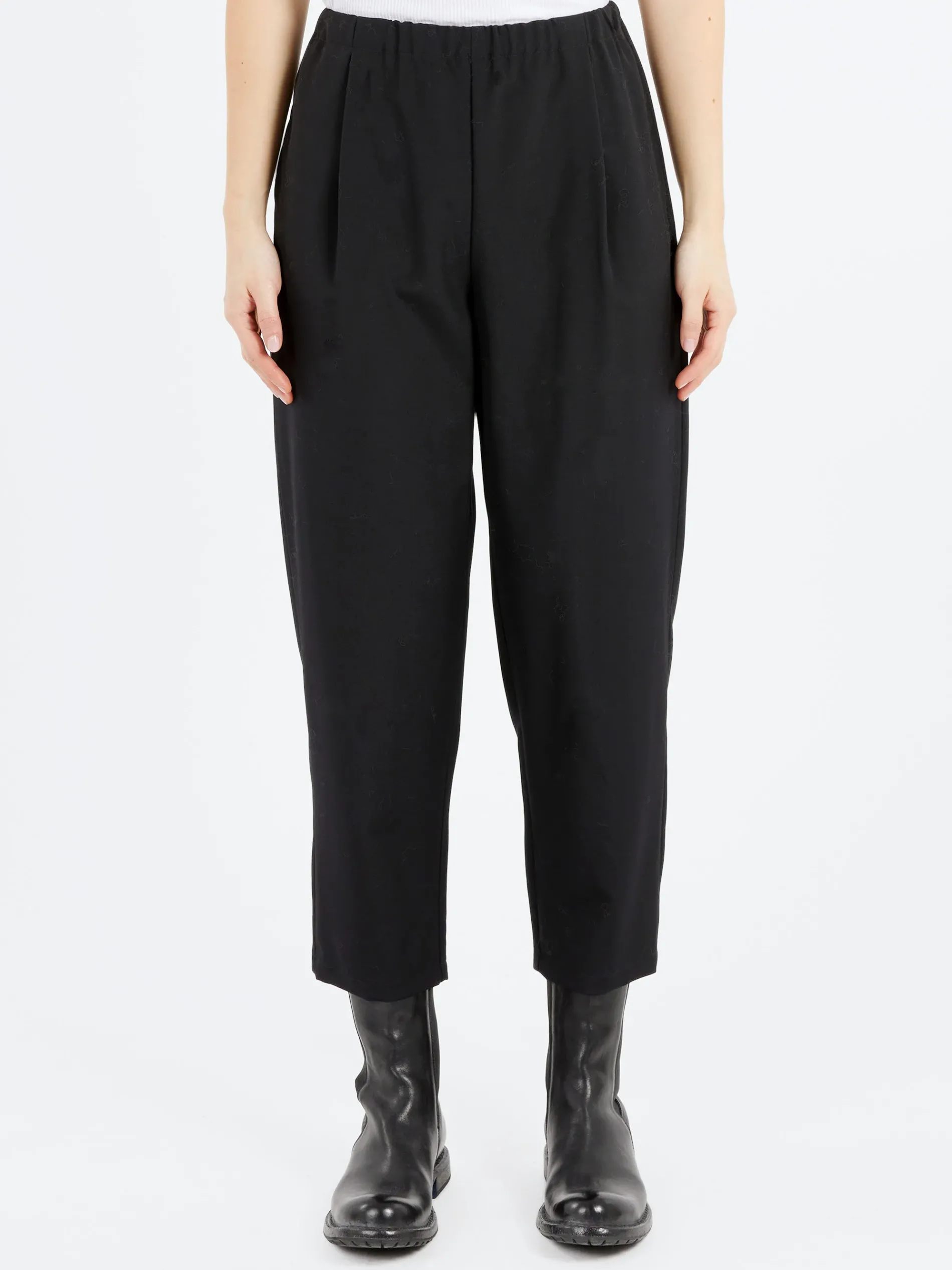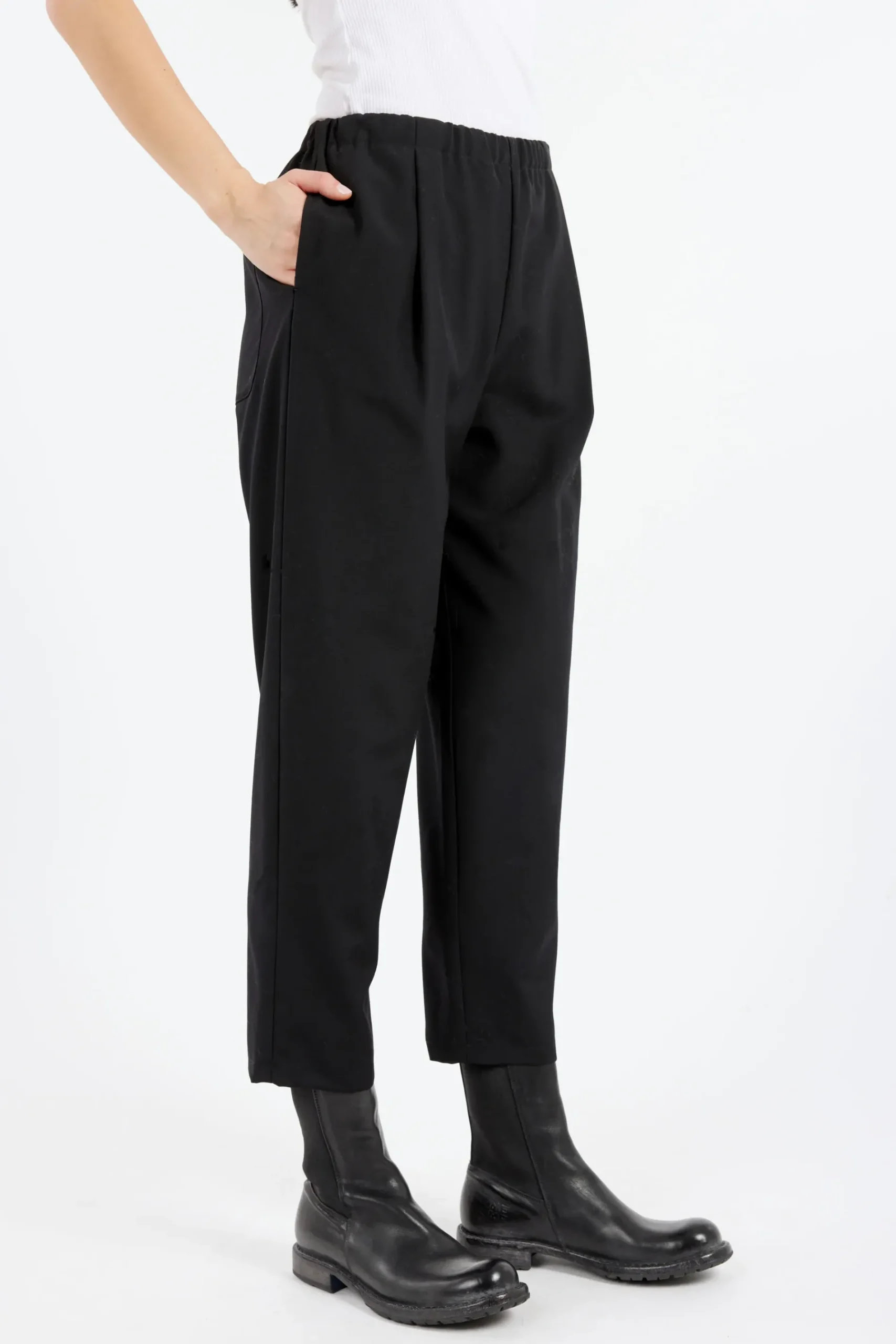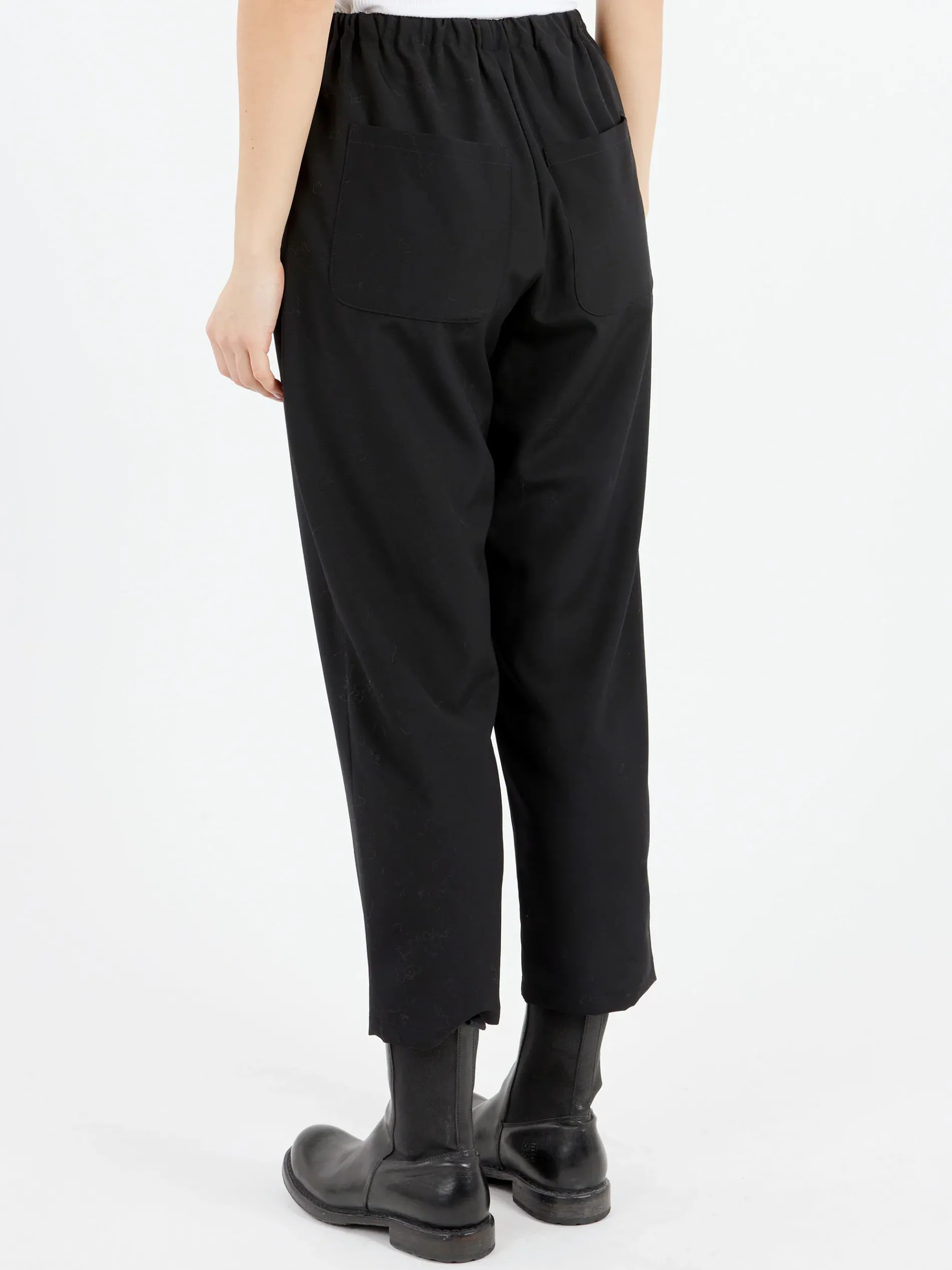 A simple trouser cut with a loose fit at the leg that gently tapers towards the hem. Constructed from a soft virgin wool.