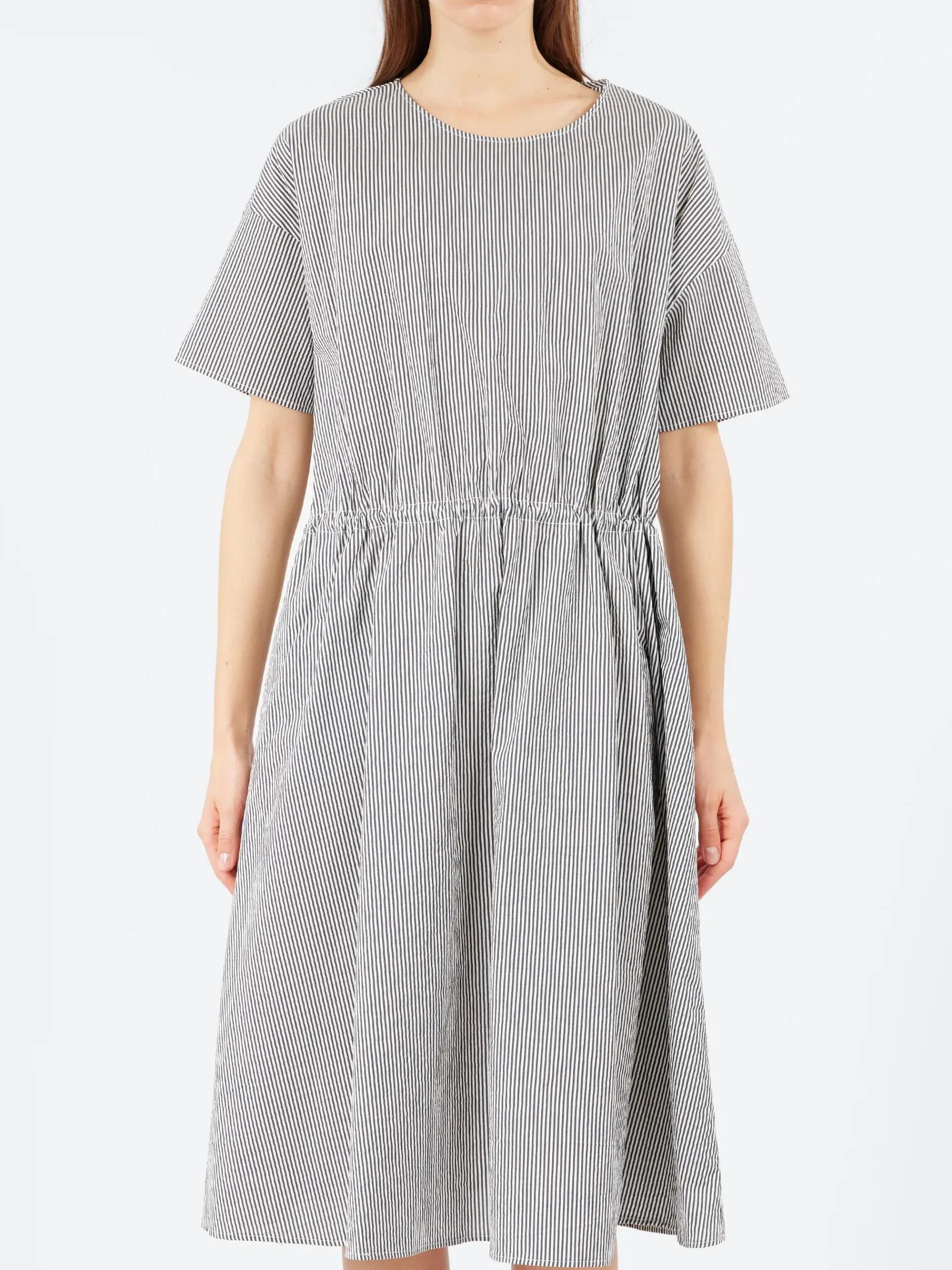 This Italian-made dress from ApuntoB features a clean, minimalist design in a versatile tone. Crafted from cotton and silk, it includes a round collar, short sleeves, and an elastic waistband for a subtly cinched silhouette. The relaxed A-line shape and thoughtful detailing make it an easy, elegant choice for everyday wear.
