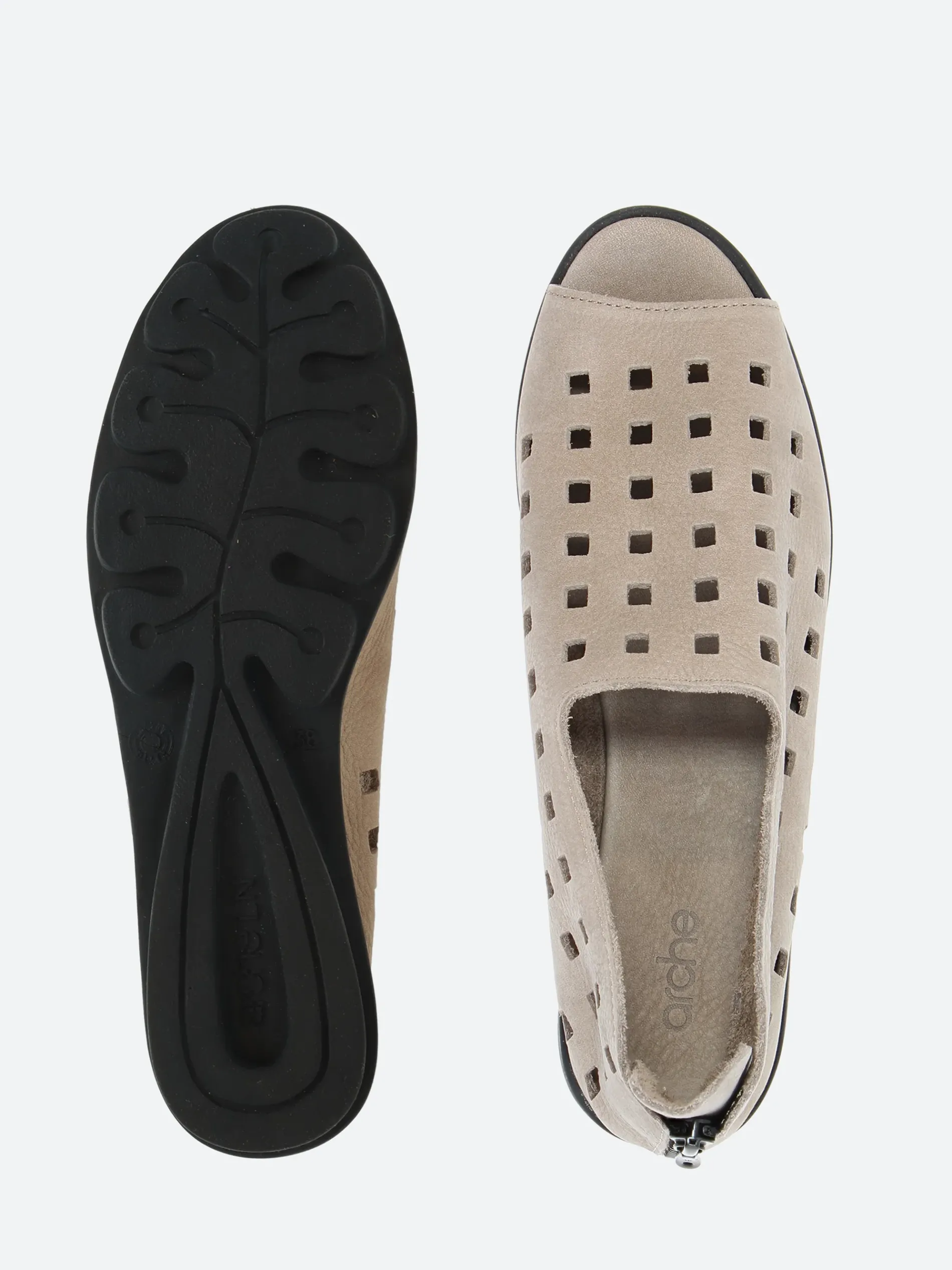 Arche open-toe slip-ons with square perforations and closed zipped back.