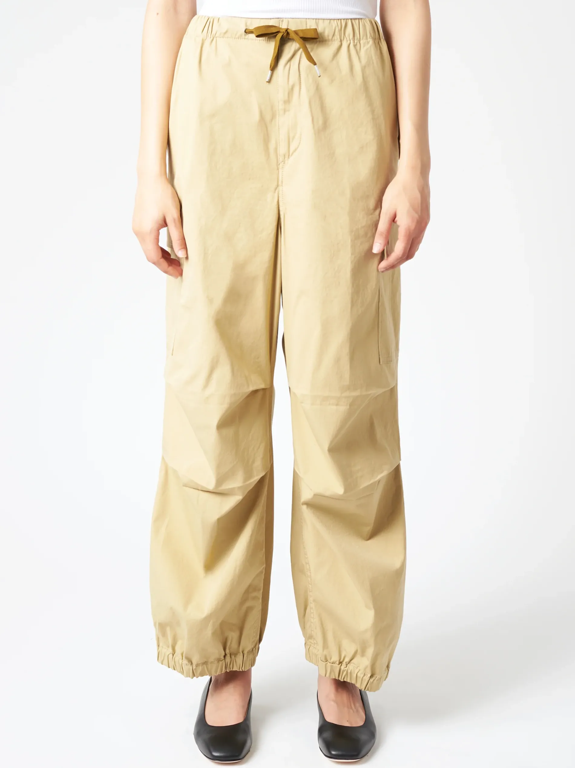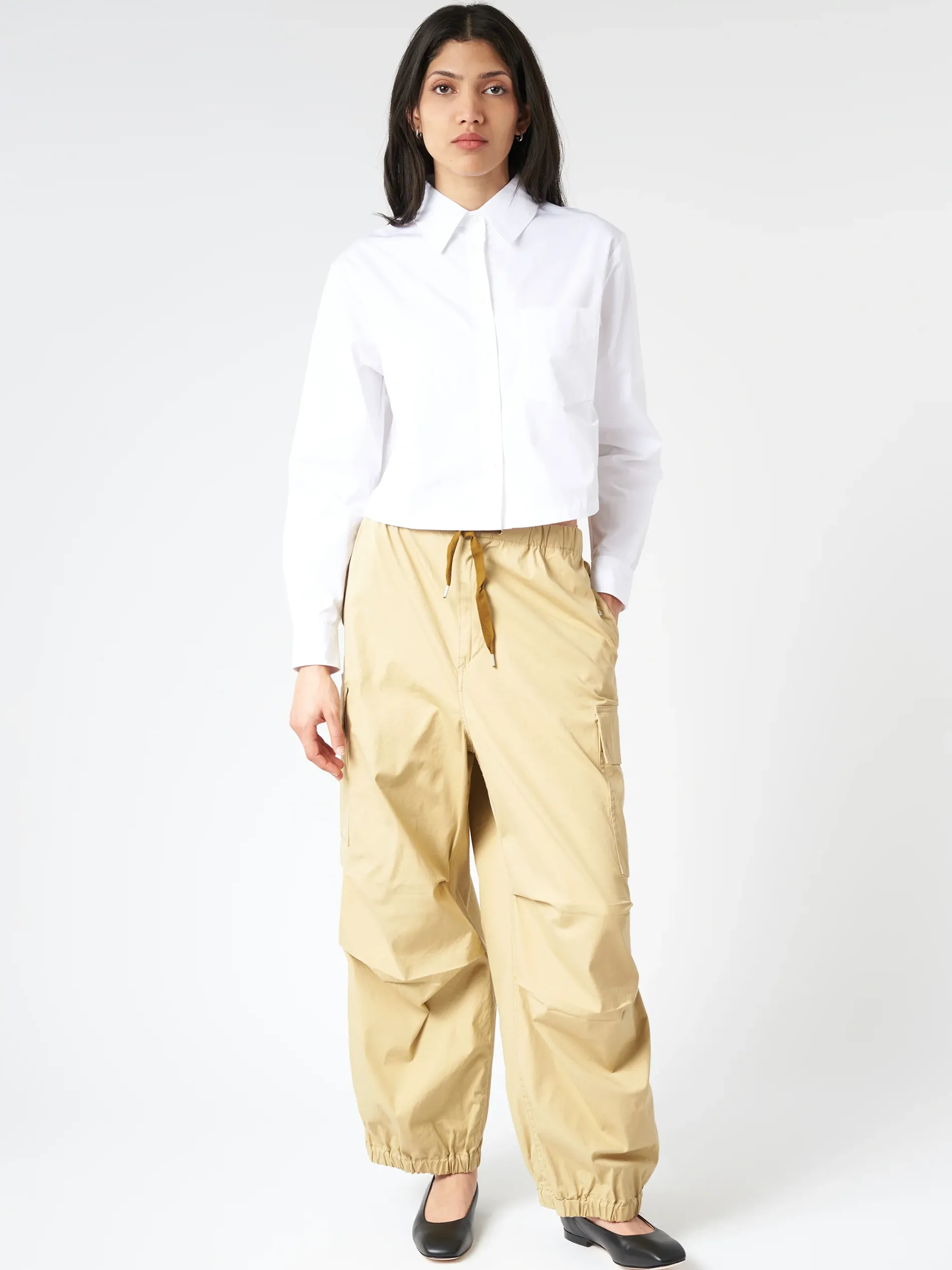 Elevated cargo pants made from a crisp cotton, with large side pockets, button tabs at the cuffs, and pleats at the knees for extra volume.
