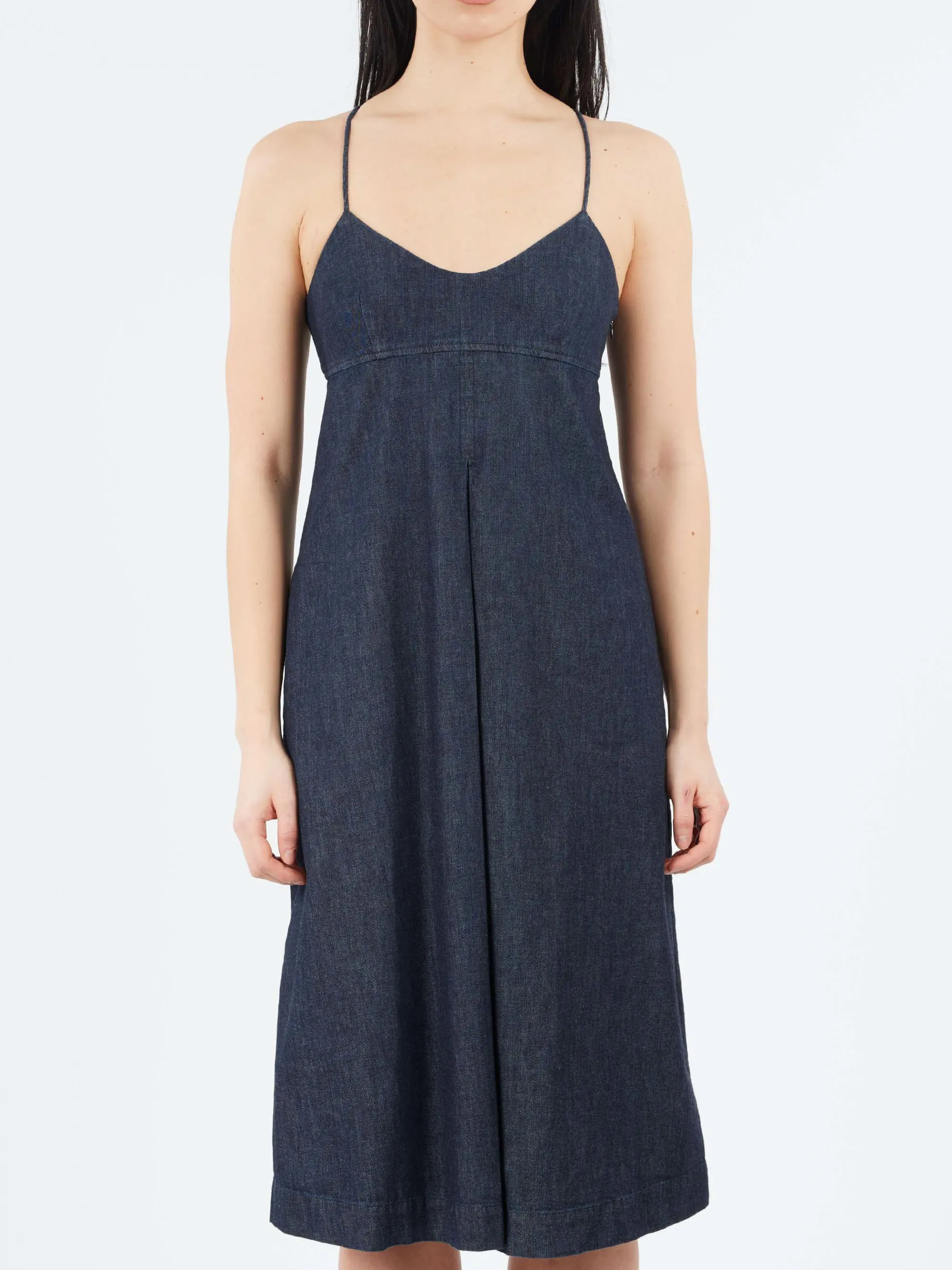 This long cotton denim dress features a V-neckline and spaghetti straps, offering a sleeveless design for a light, breezy feel. The skirt flares at the bottom, with an inverted pleat down the center, adding movement and structure to the silhouette. With its regular fit, this dress combines comfort and style, making it a versatile option for various occasions.