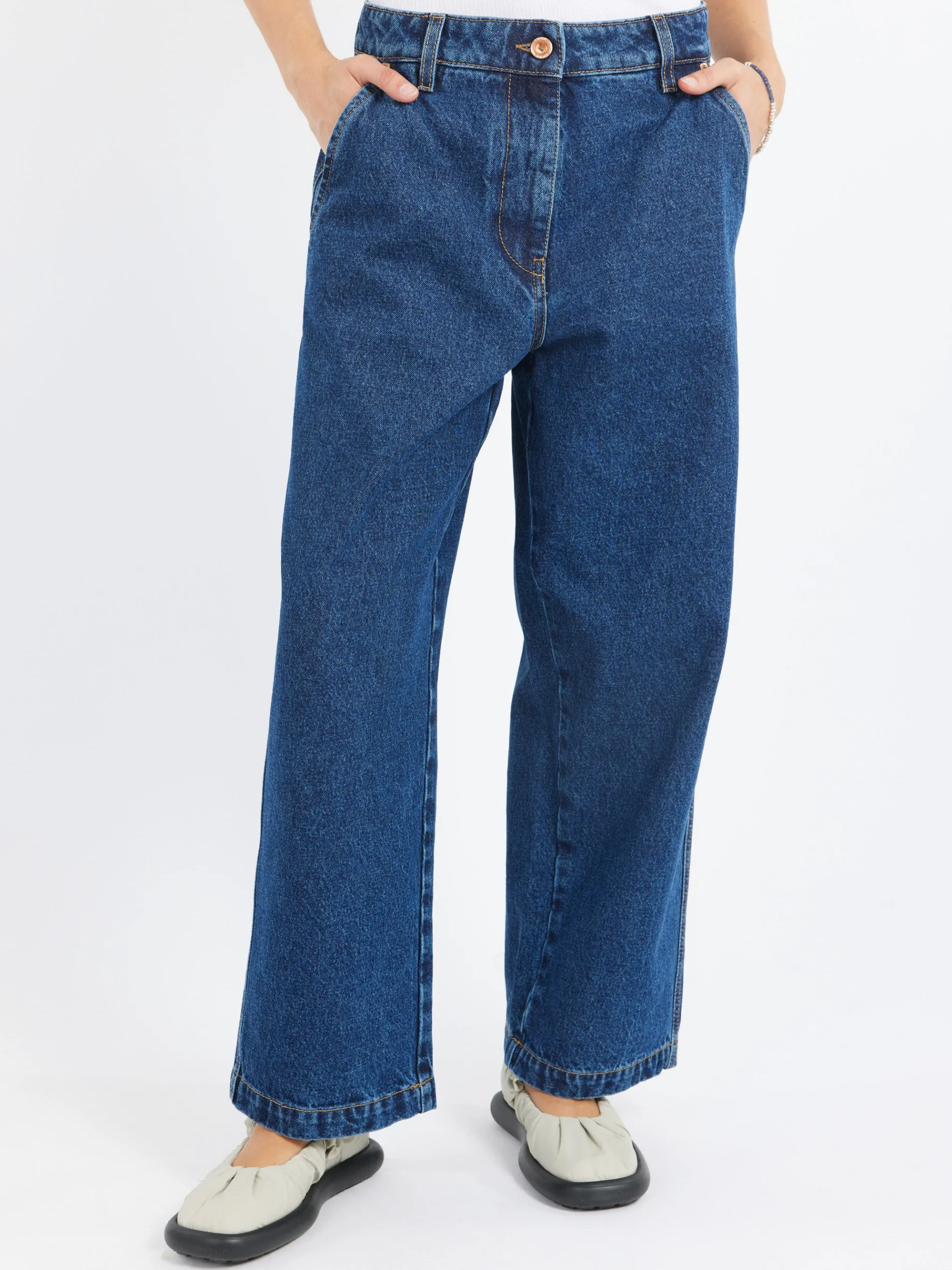 High-waisted wide-leg trousers made of 12-oz pure cotton denim with a thick, compact feel.