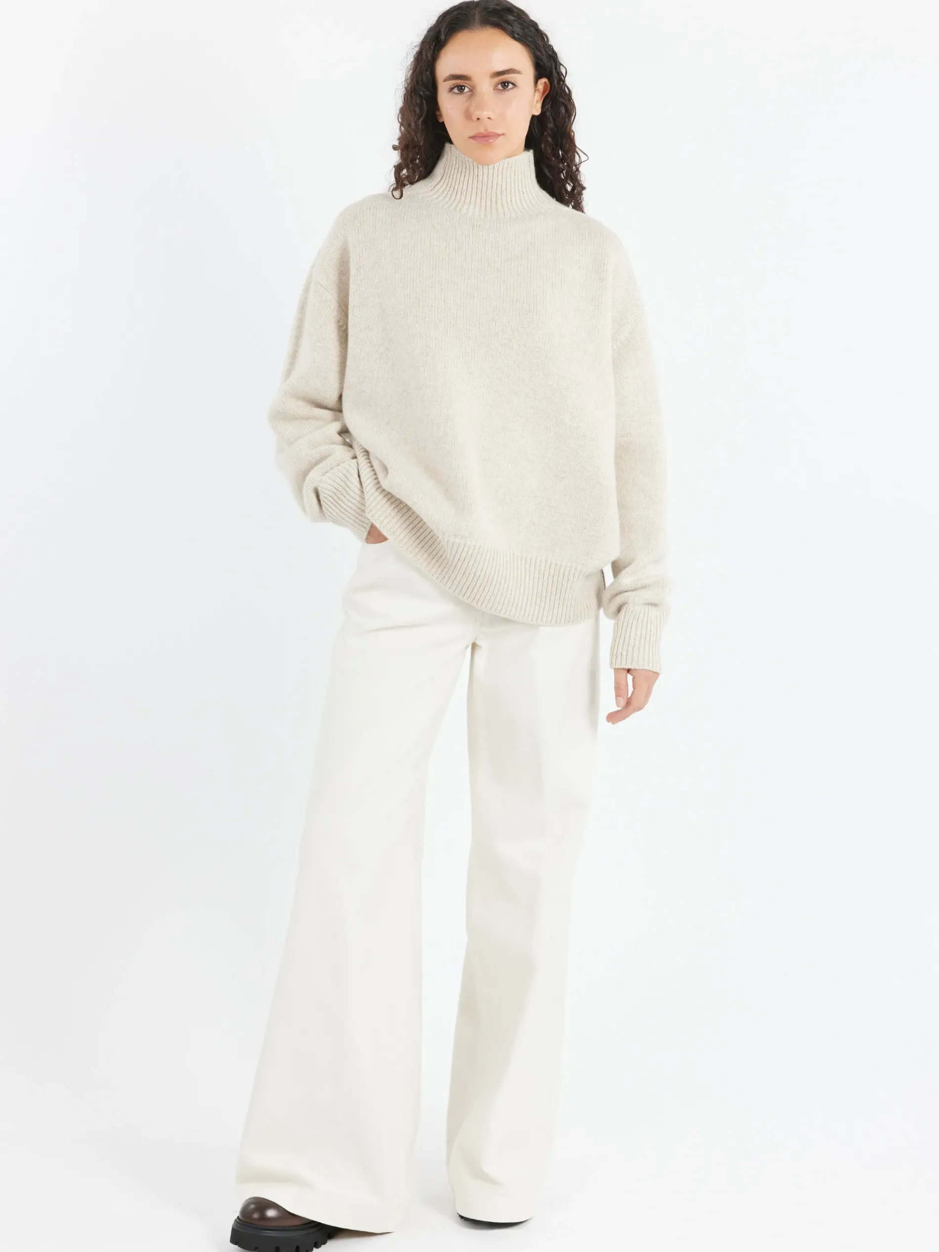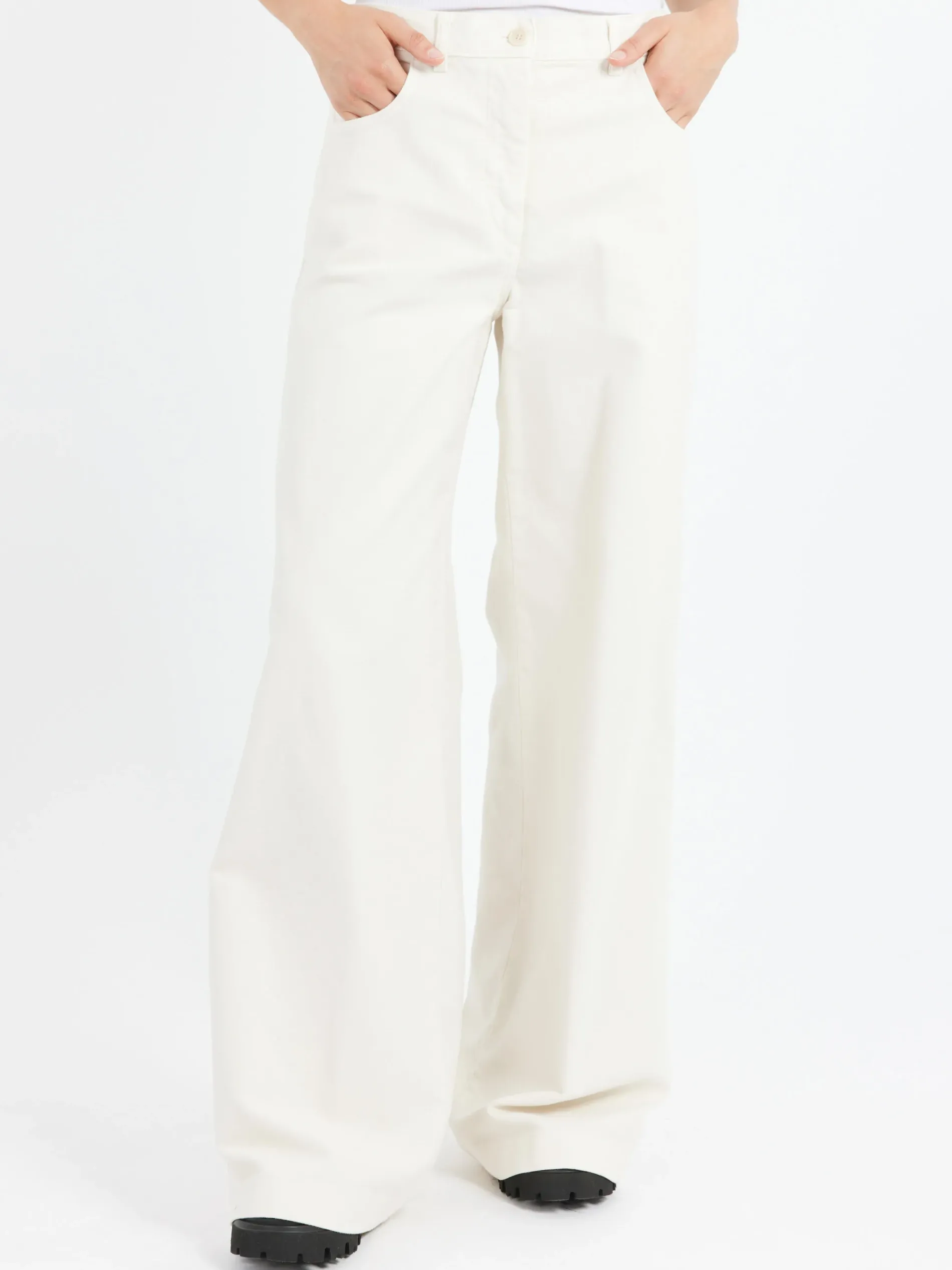 High-waisted trousers with a wide, flared leg made of garment-dyed stretch fustian, a compact fabric with a velvety feel.