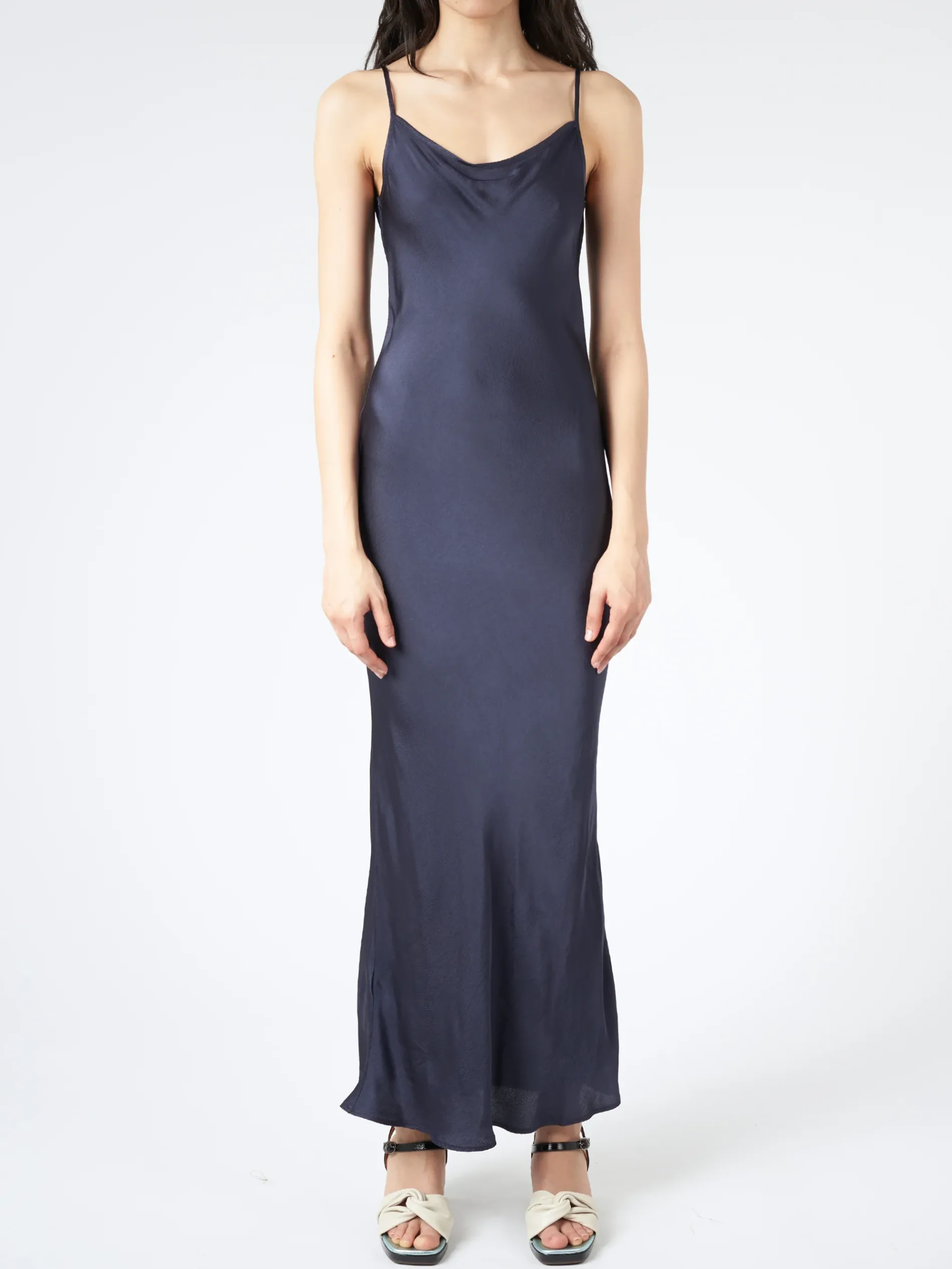 Crafted from a flowing viscose seersucker fabric, this beautiful cami gown is designed to gracefully drape over various body shapes, creating a sophisticated and flattering silhouette.