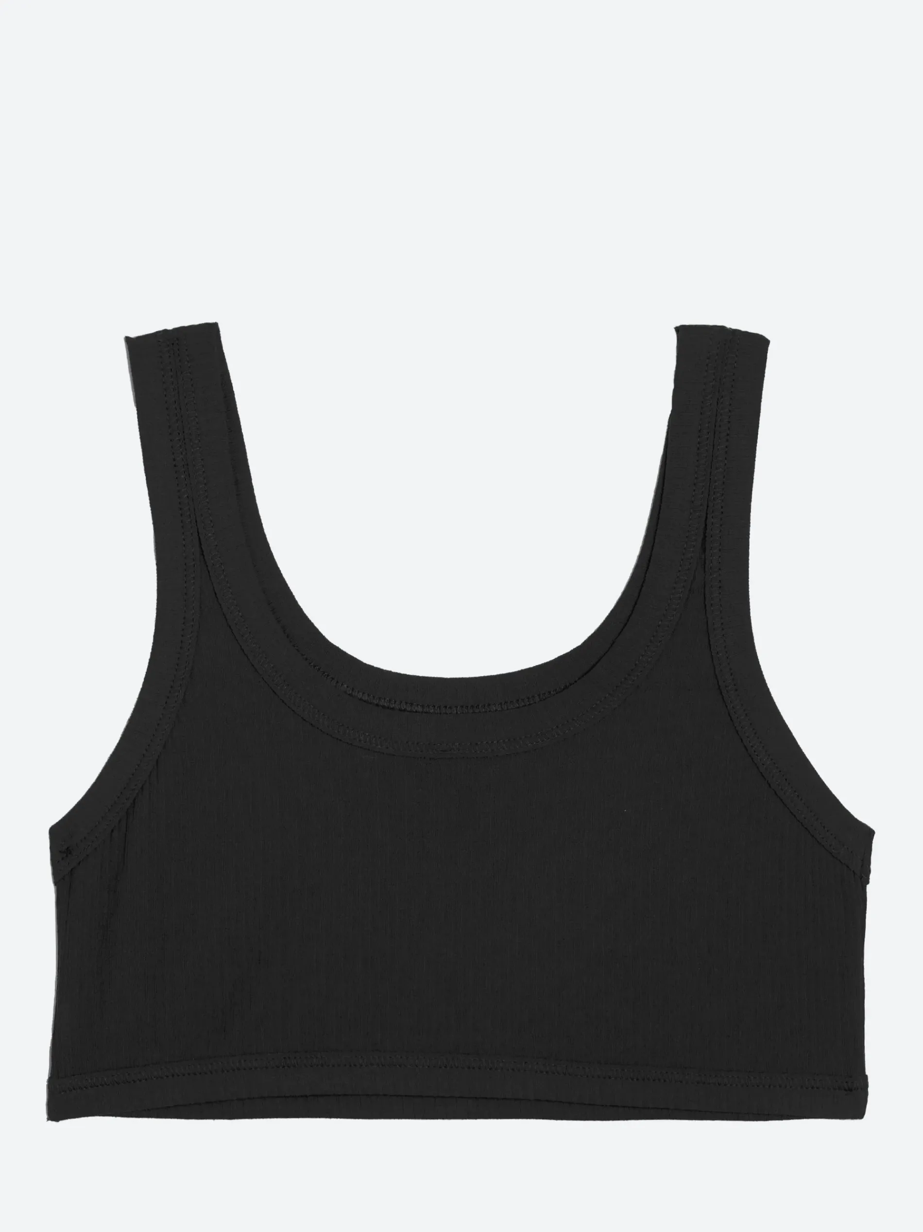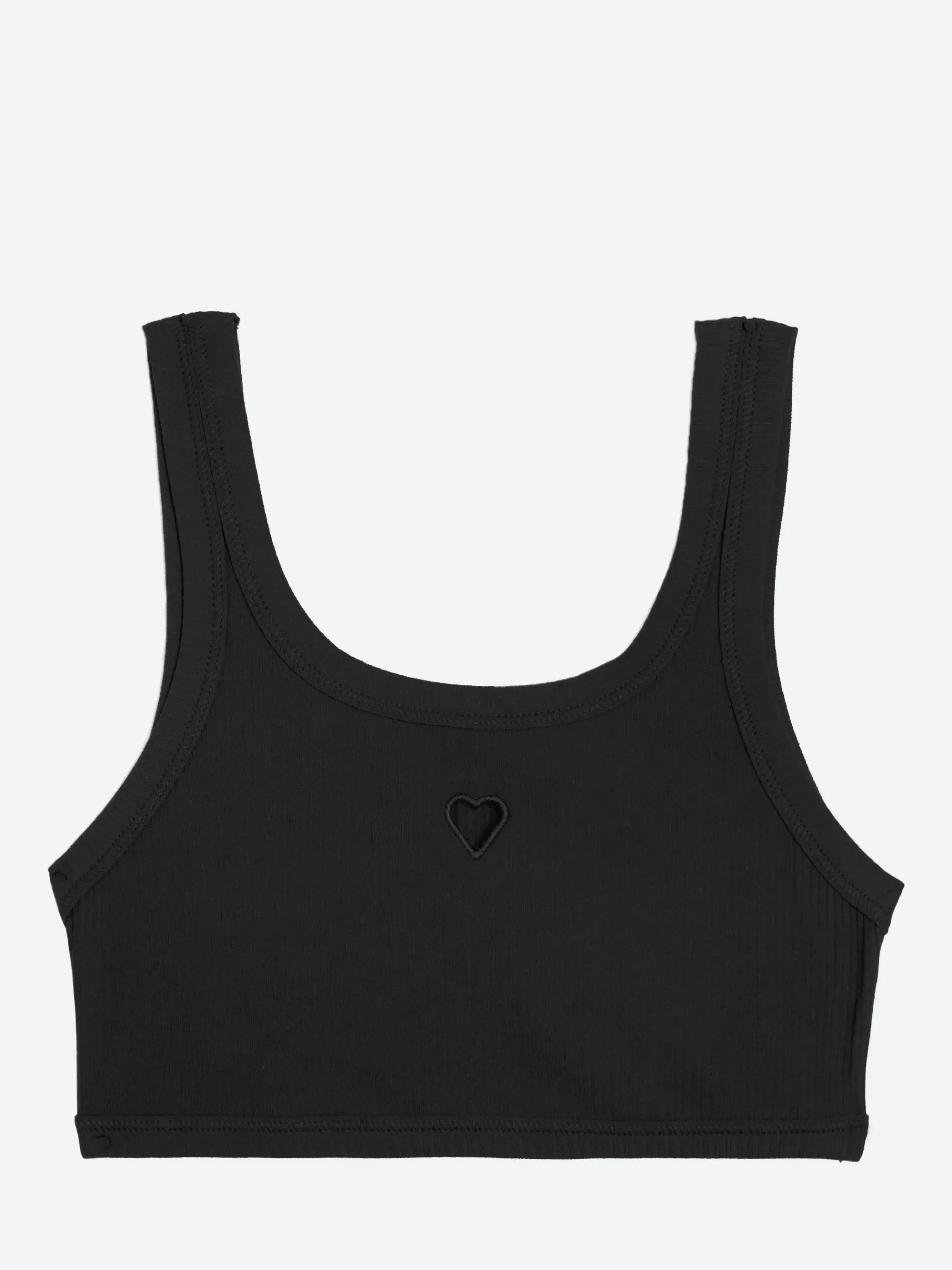 A soft, eco-friendly organic cotton rib bra with heart-shaped embroidery, a front cut-out, and a scoop neckline. Features elastic trim at the neckline and hem, made from cotton for a natural, sustainable touch.