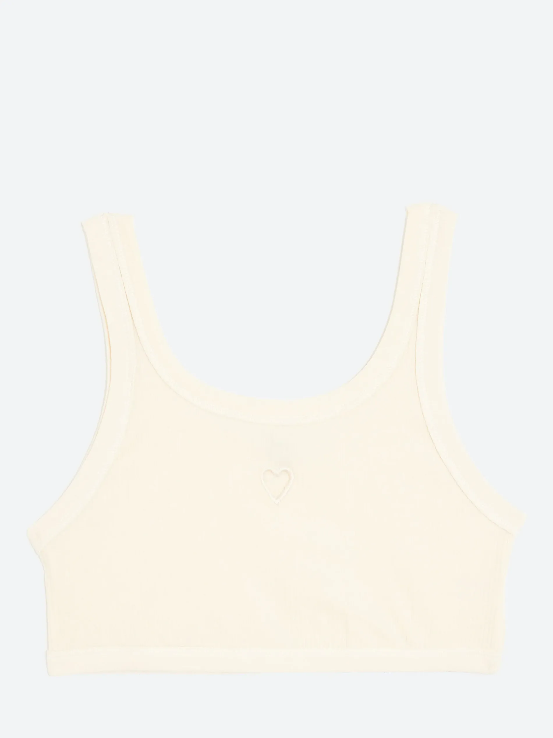 A soft, eco-friendly organic cotton rib bra with heart-shaped embroidery, a front cut-out, and a scoop neckline. Features elastic trim at the neckline and hem, made from cotton for a natural, sustainable touch.