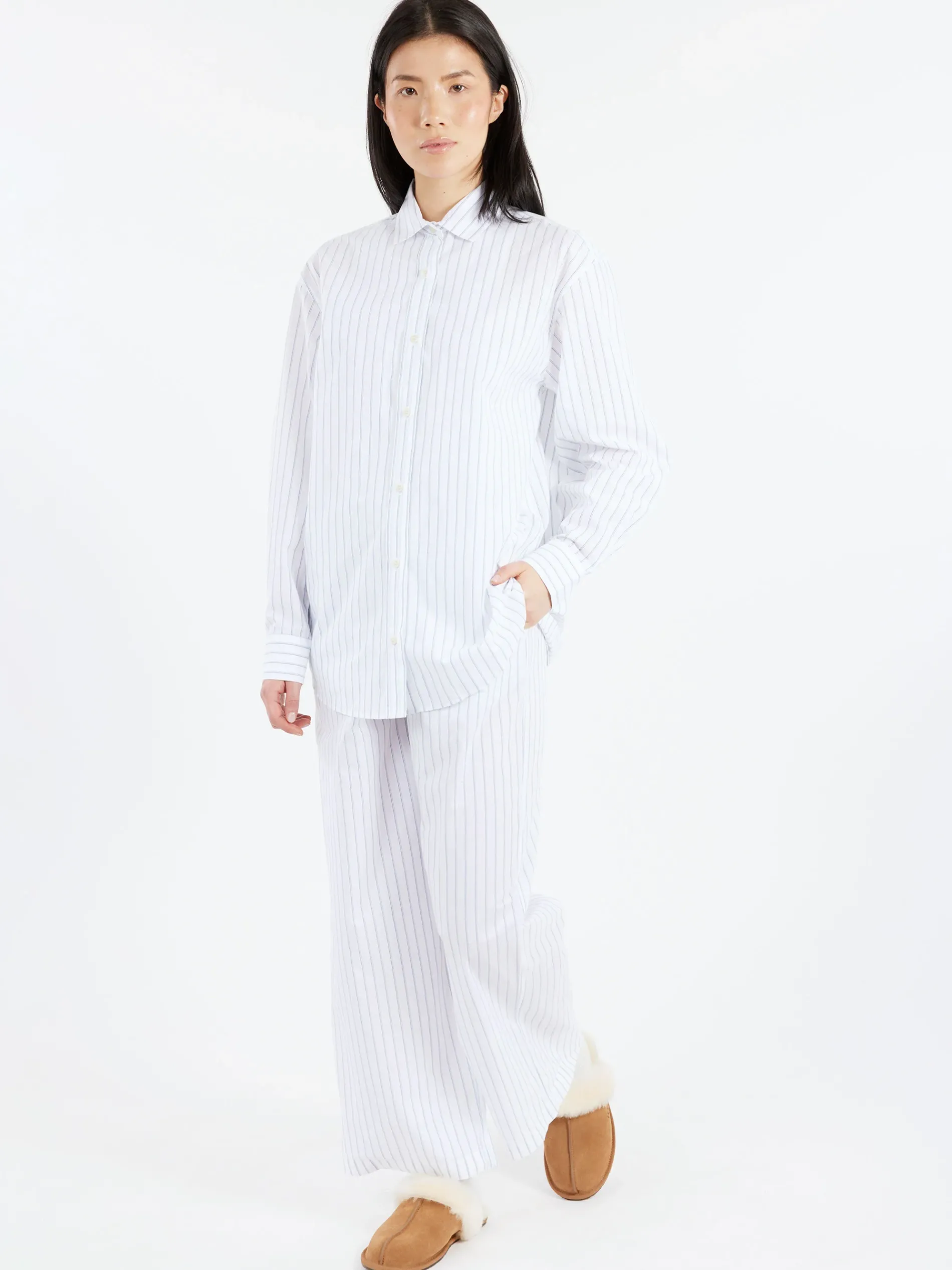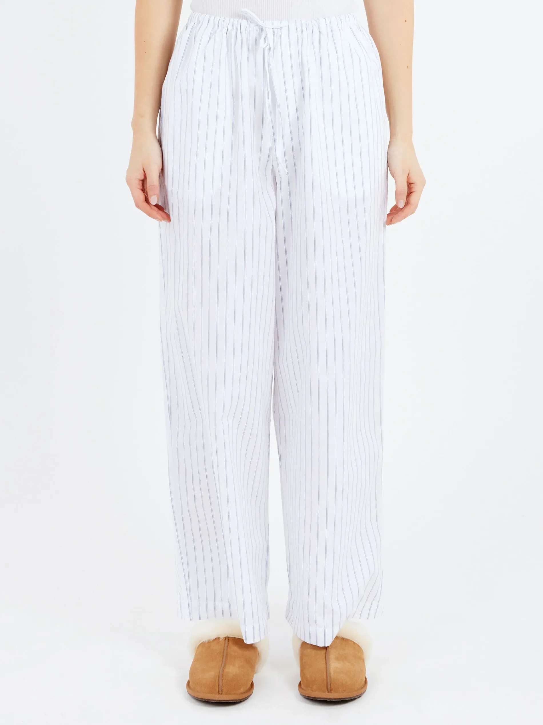 Baserange cotton lounge pants with a subtle blue stripe. Made from OEKO-TEX certified organic cotton.
