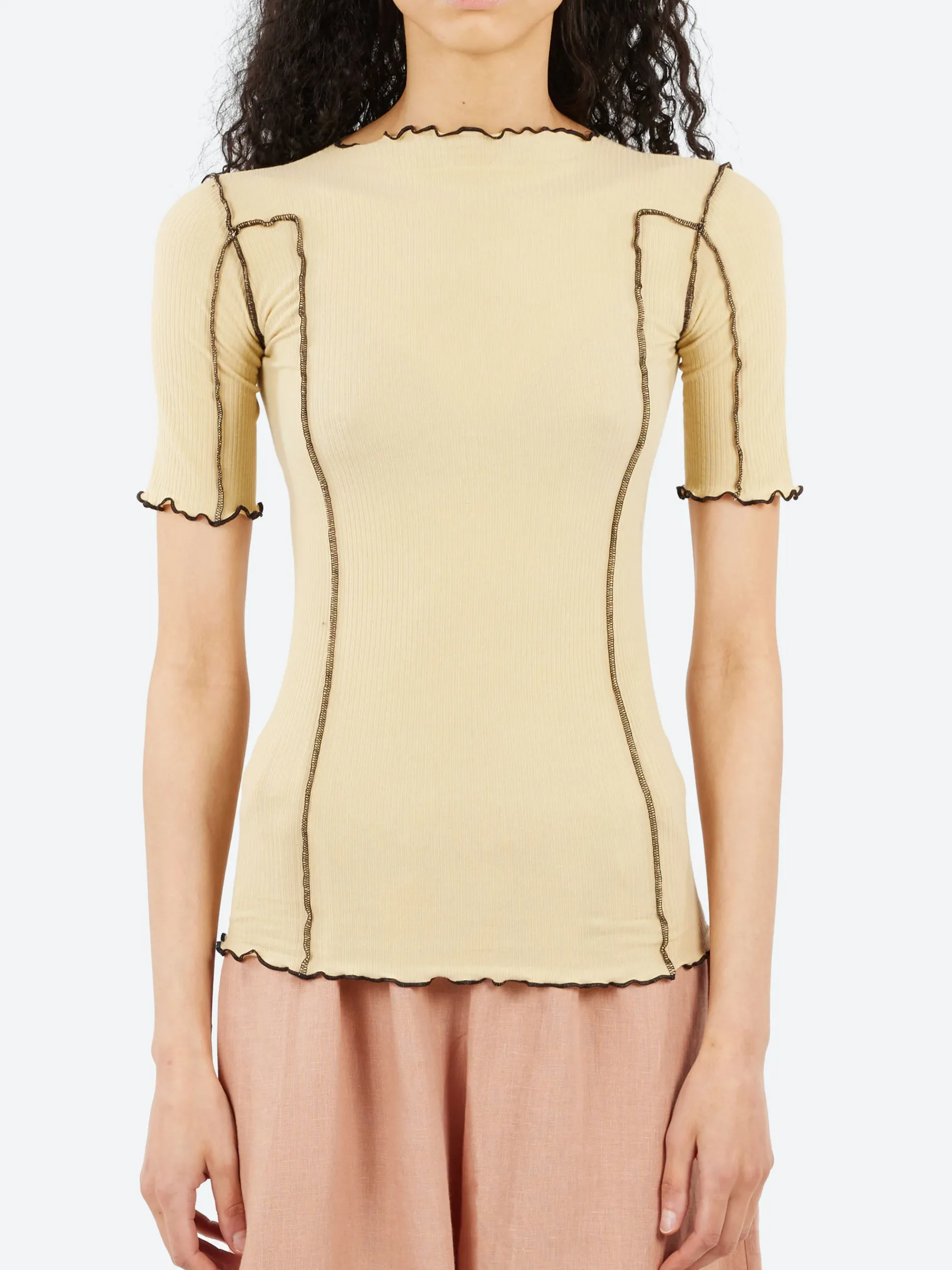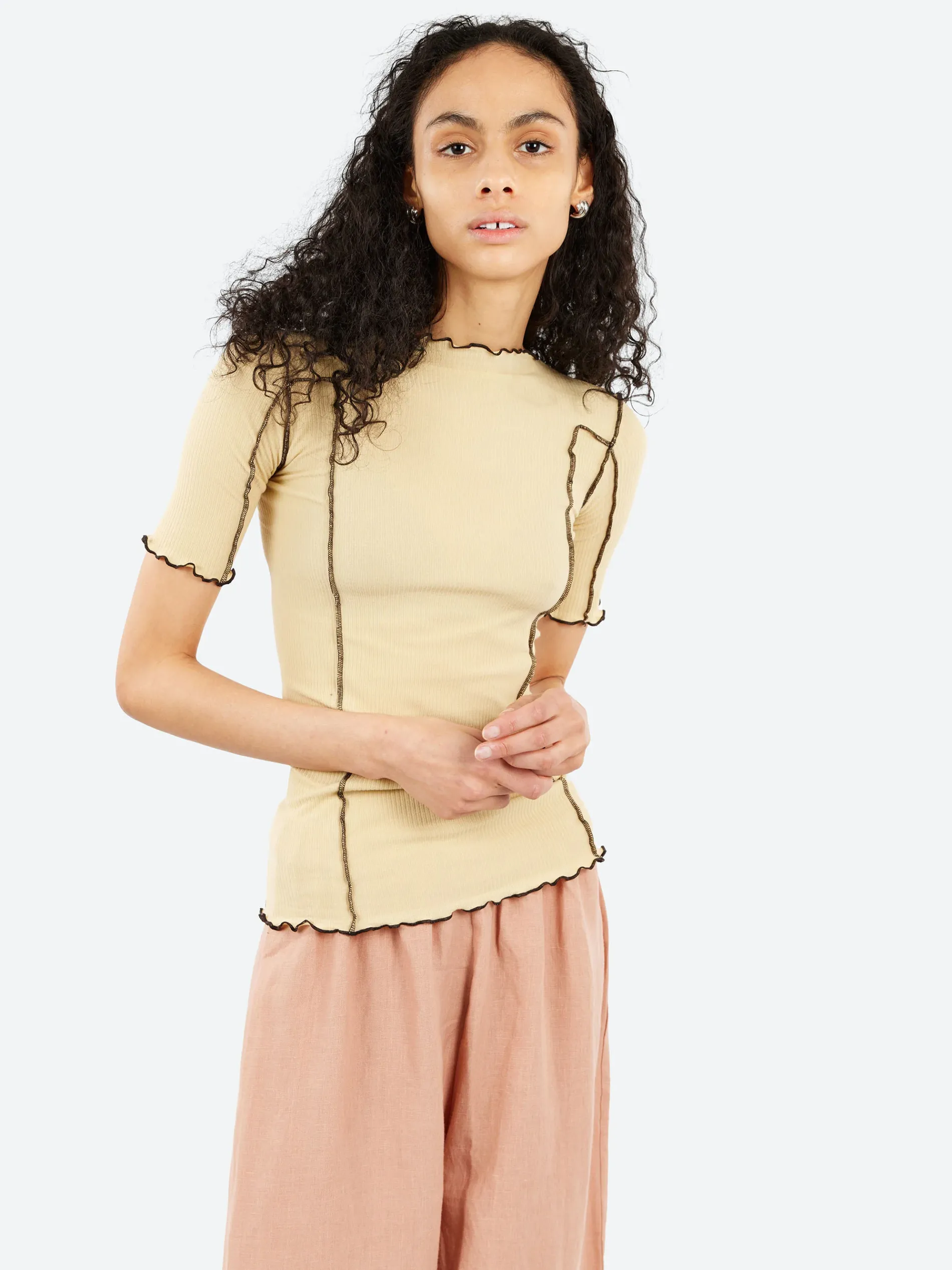 Baserange organic cotton rib tee with lettuce edge at neckline and hems.