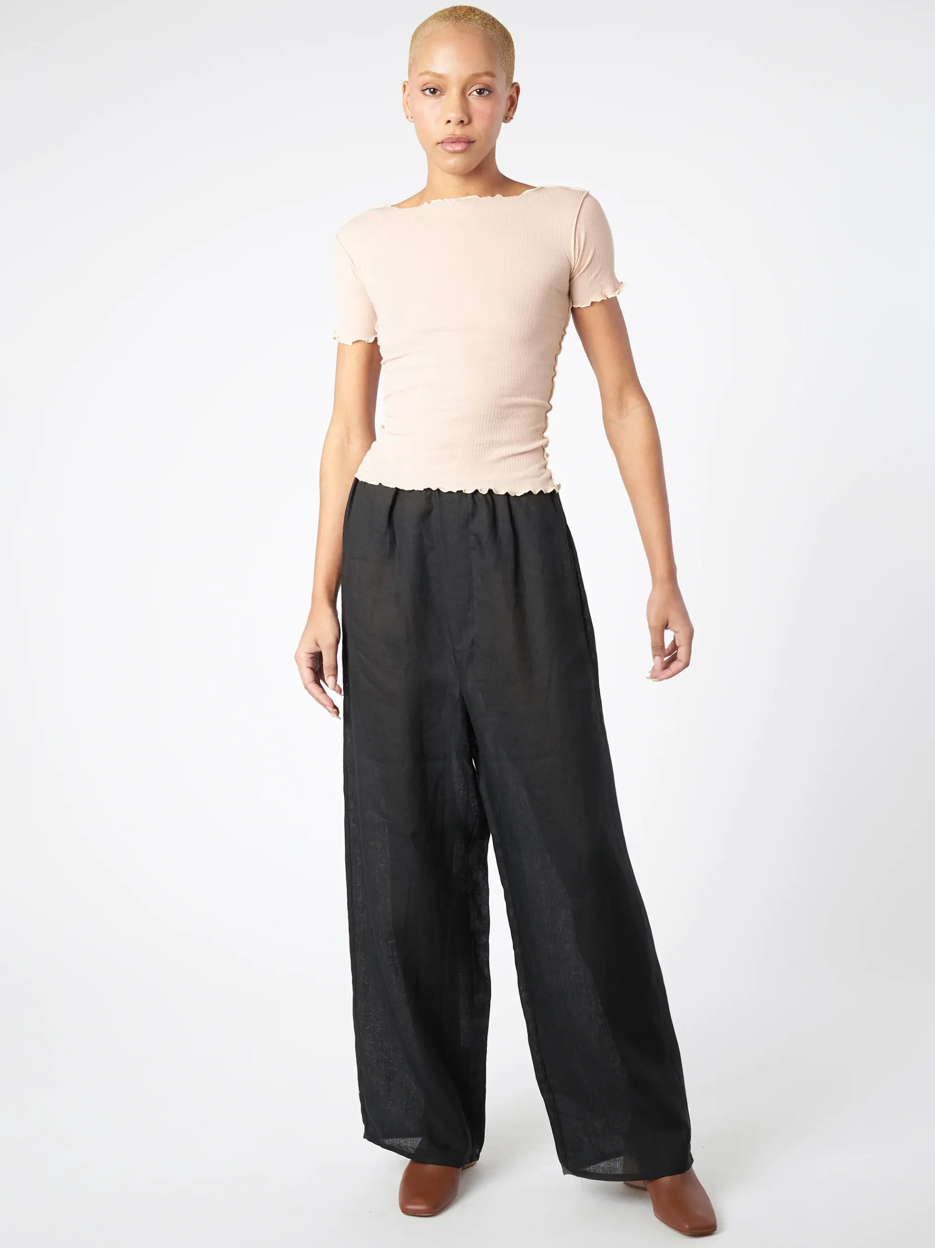 This tee features a formfitting design with a wide neckline, as well as a thin and soft fabric. All seams and edges are finished with a babylock technique for added durability and quality.