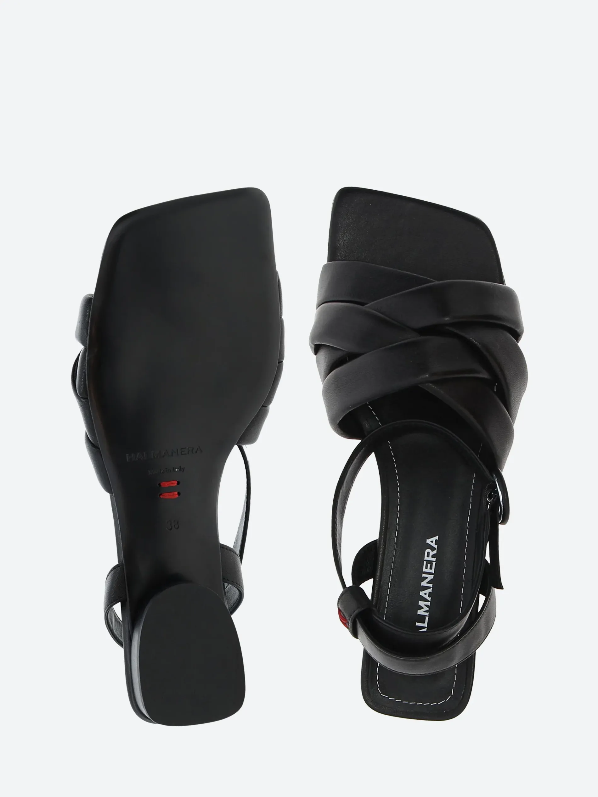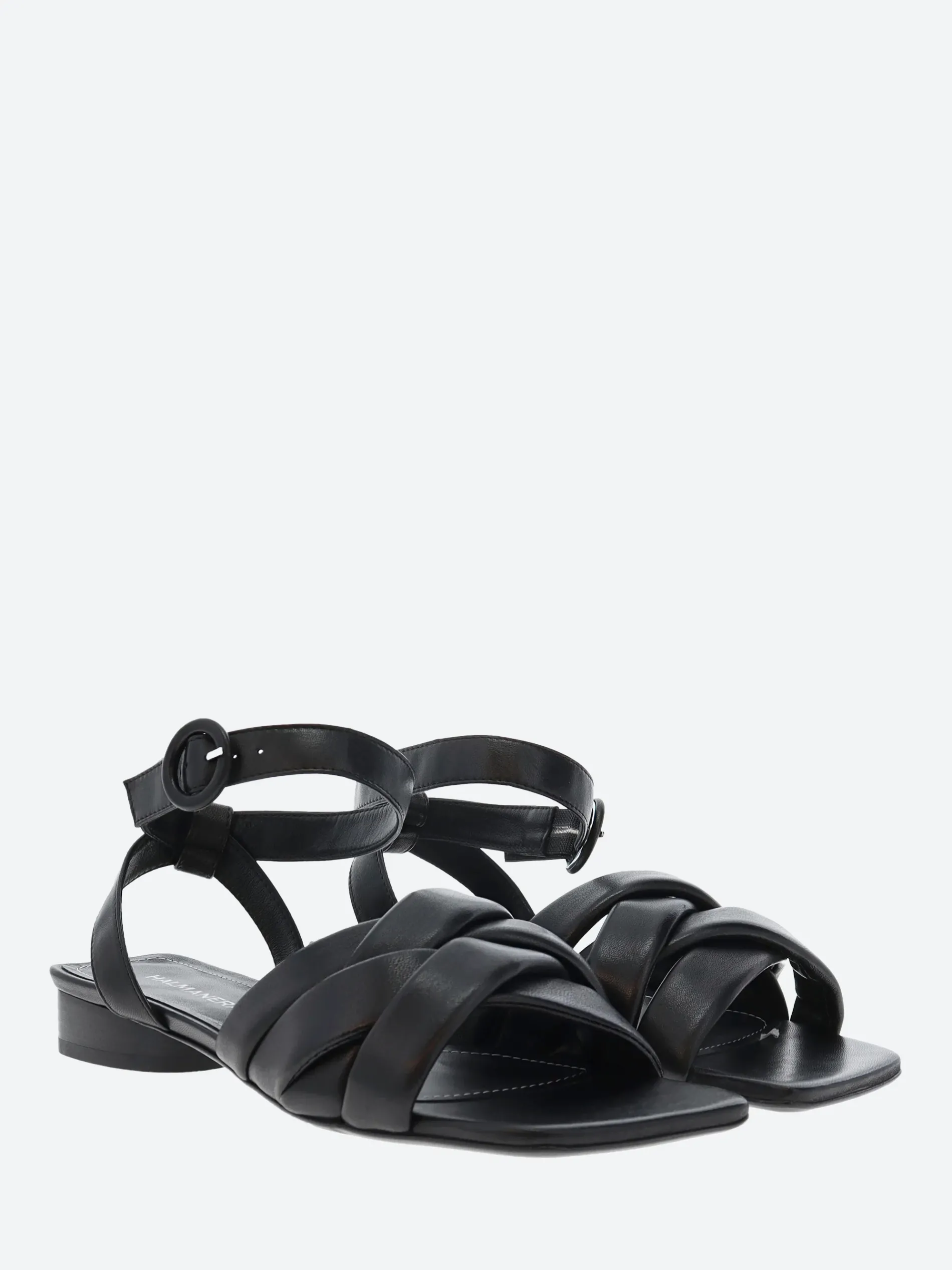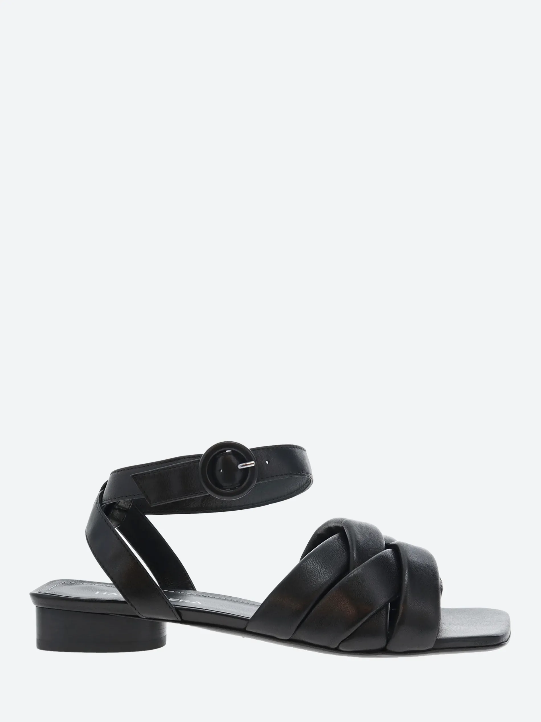 Halmanera woven flat sandal in soft nappa leather. A slip-in style for easy on and off, with an adjustable buckle closure.