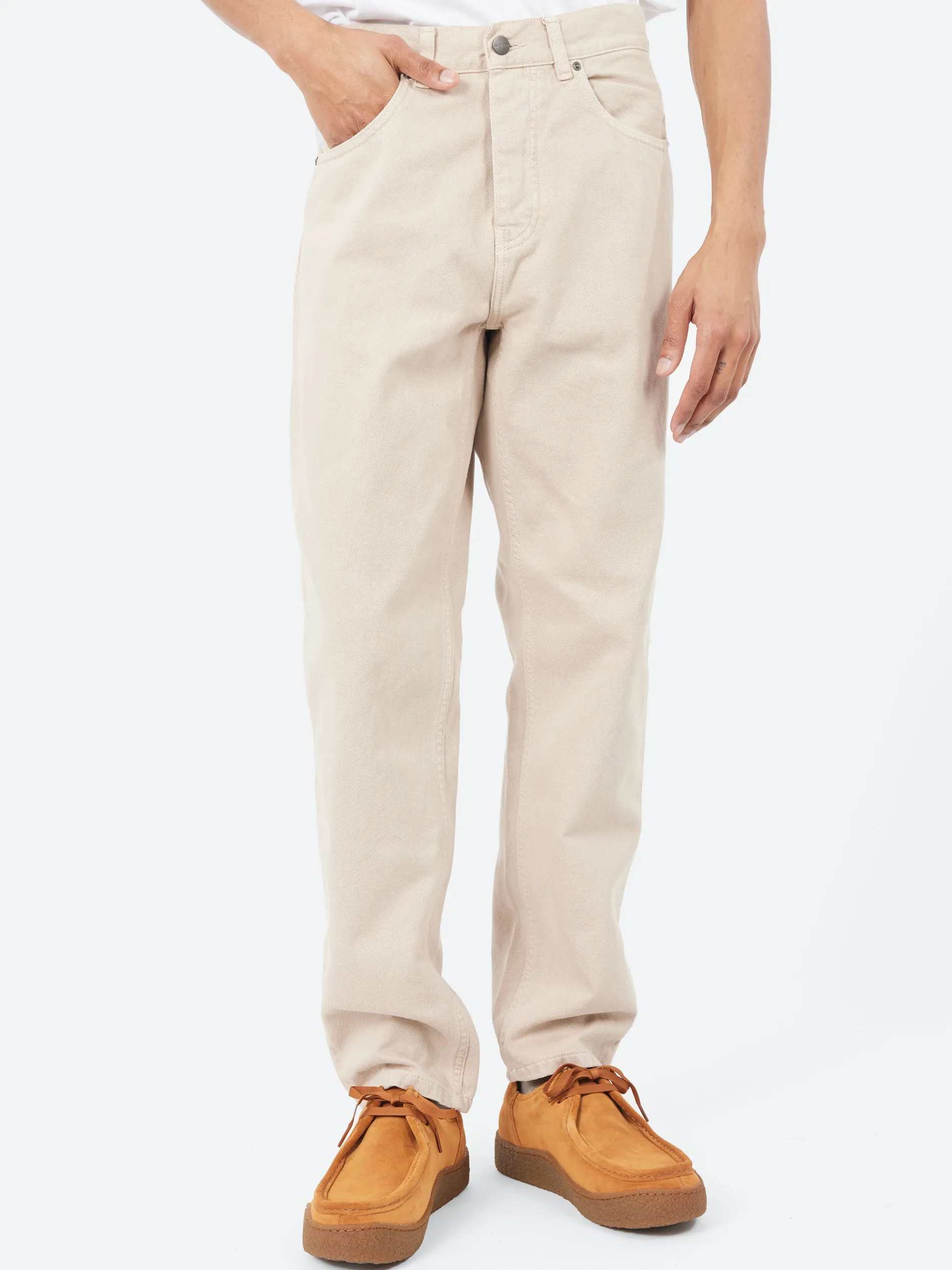 The Newel Pant is a five-pocket style constructed from 10.5 oz denim and is cut in a relaxed tapered fit with a regular waist and is offered with a graduated inseam. A back yoke and woven Square Label on the rear pocket completes the design.