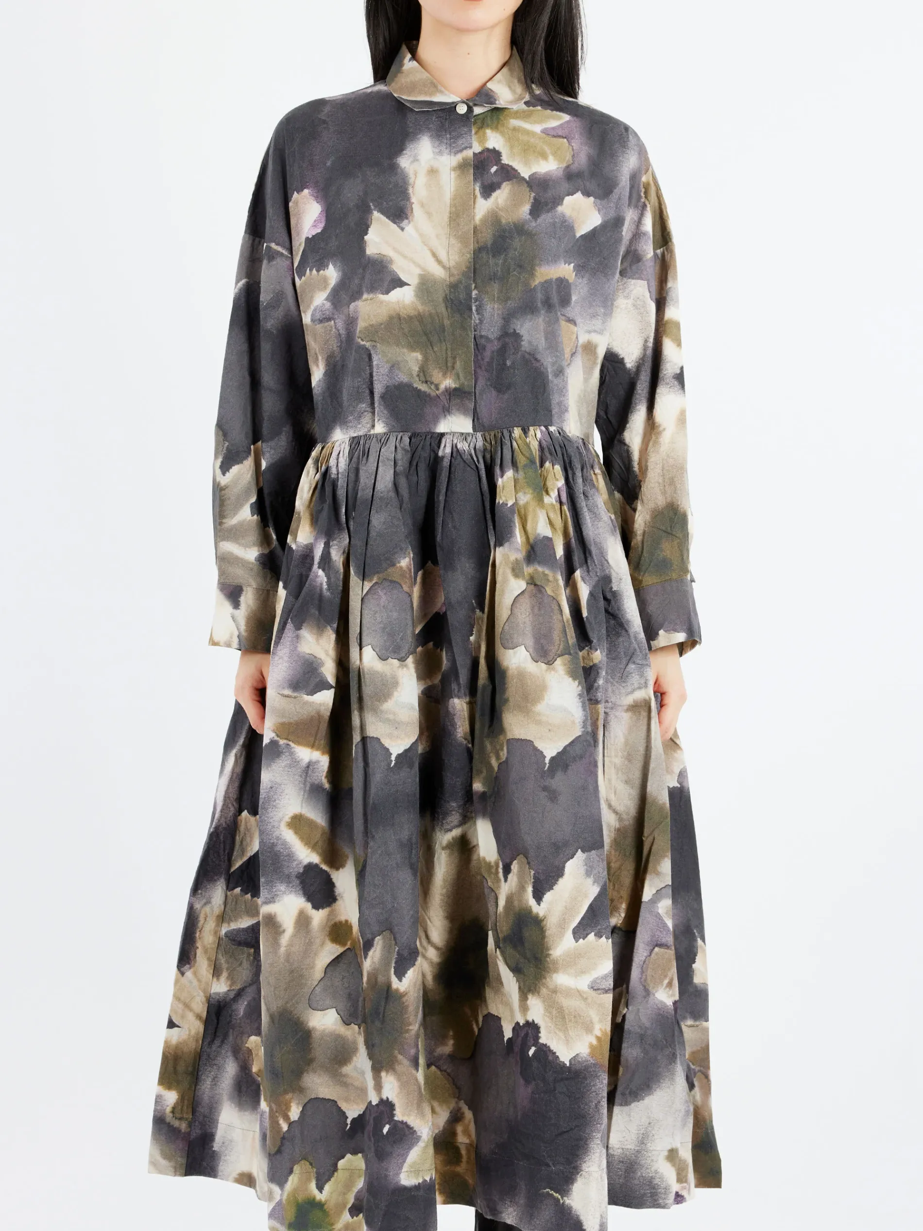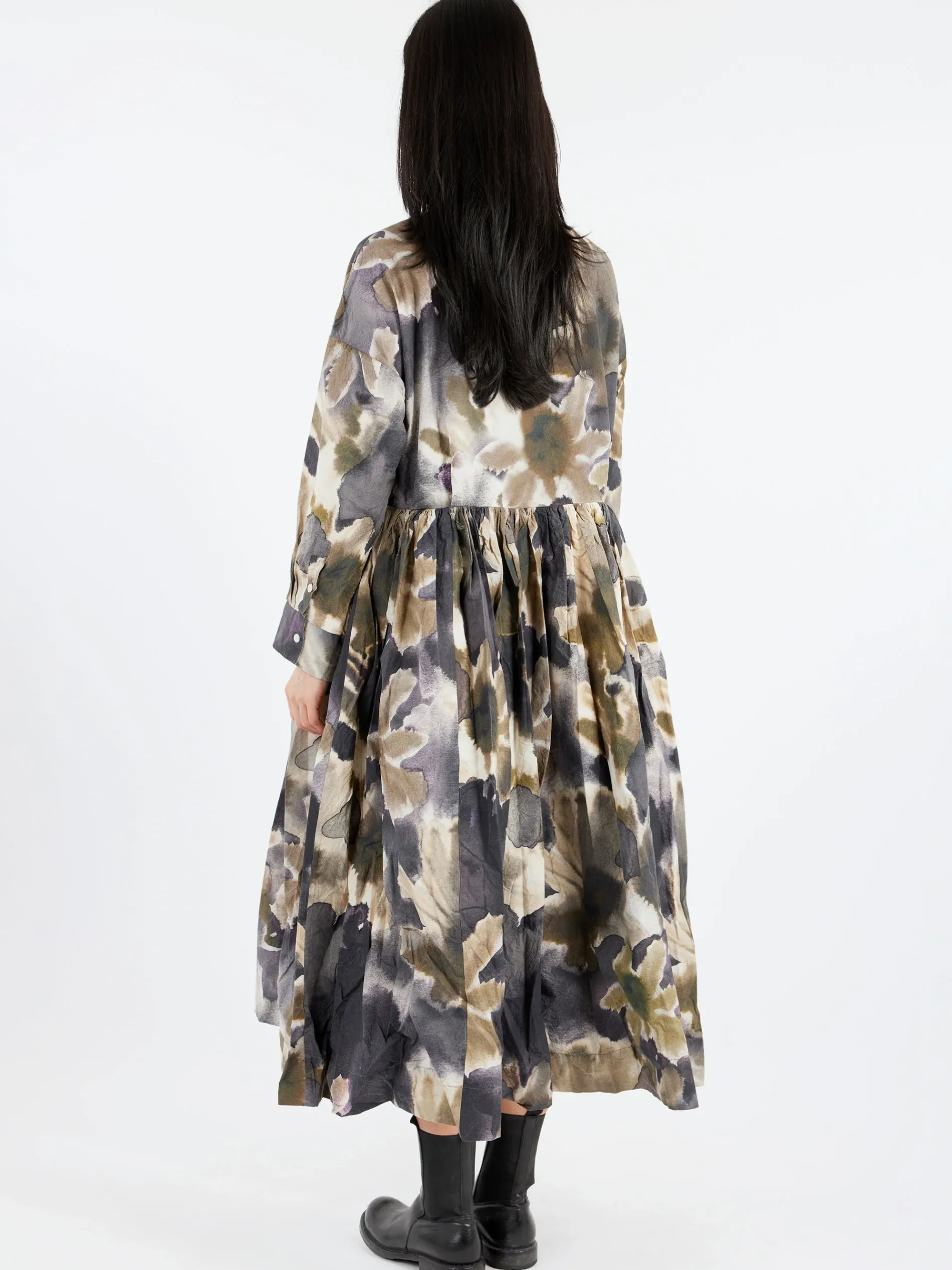 Casey Casey dress in print blotch with gathering from the waist to the bottom.