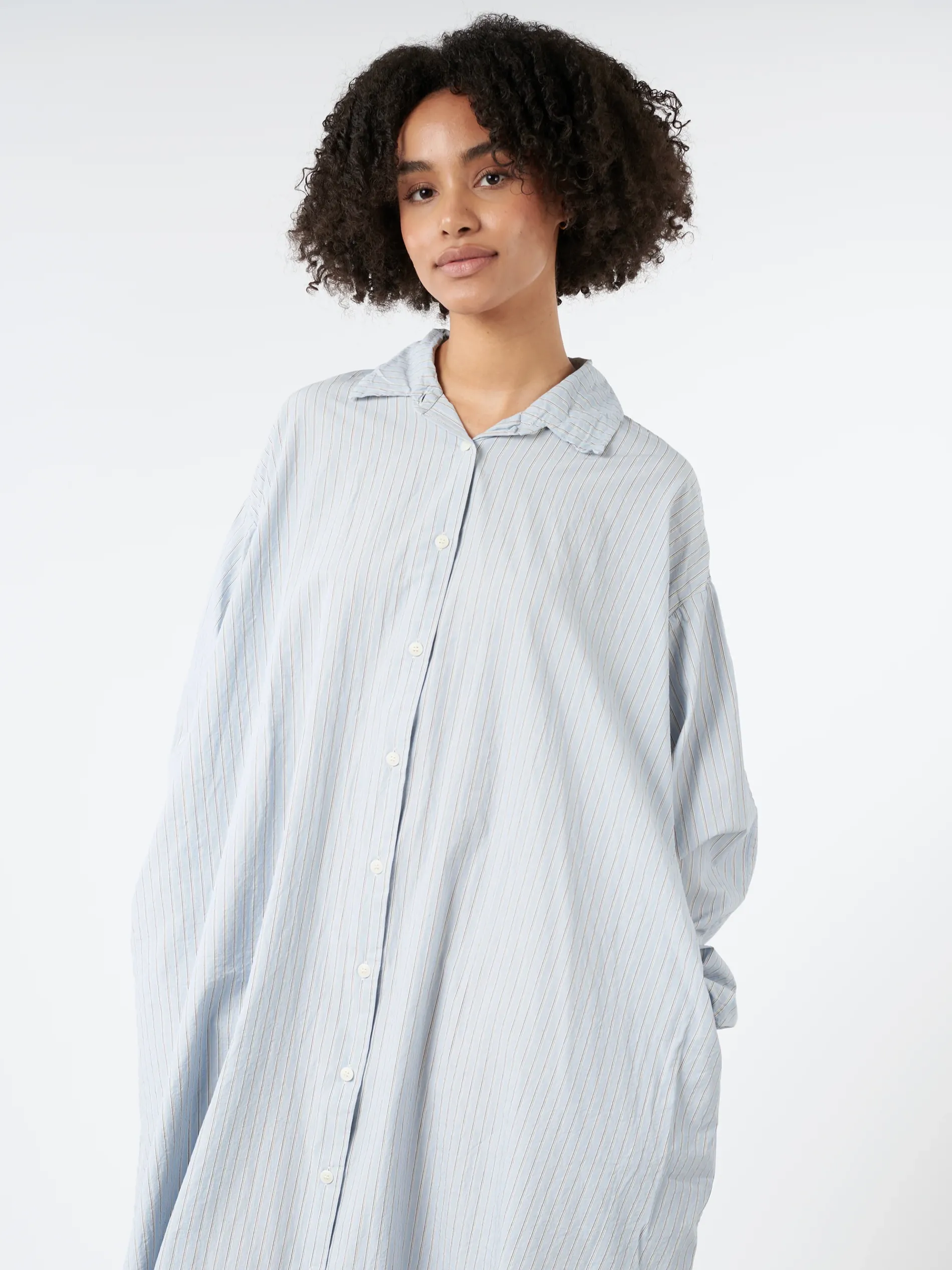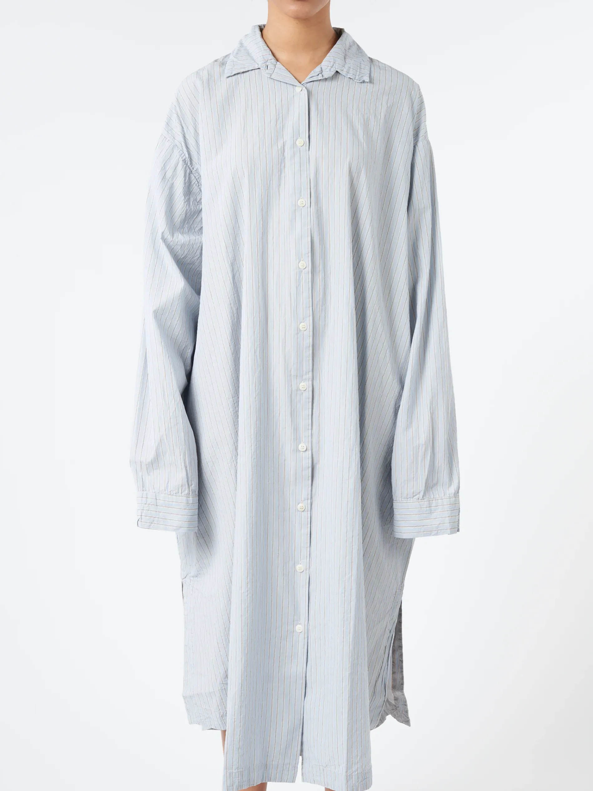 Casey Casey long sleeve shirt dress in a lightweight pinstriped cotton fabric whose beauty increases at each wash.