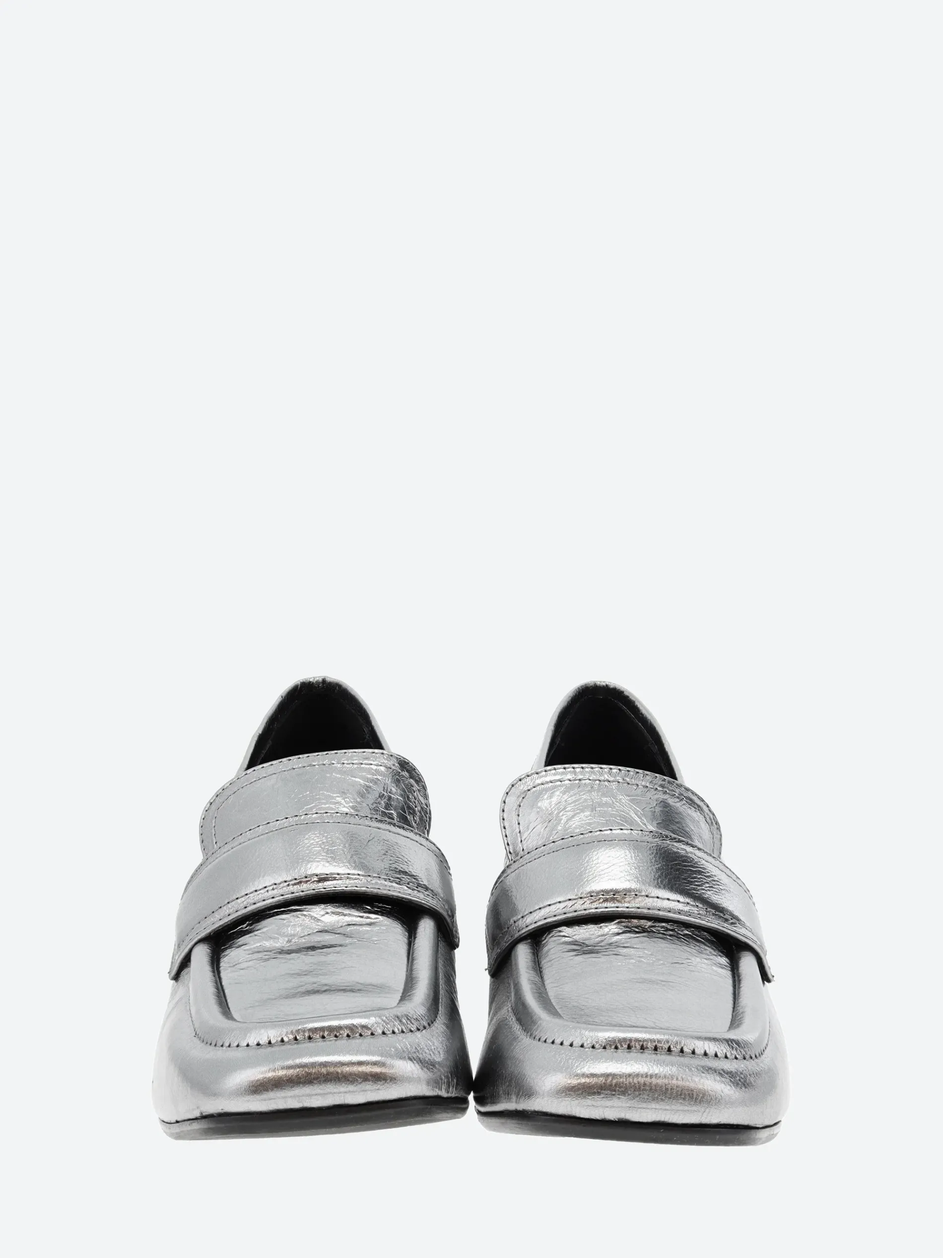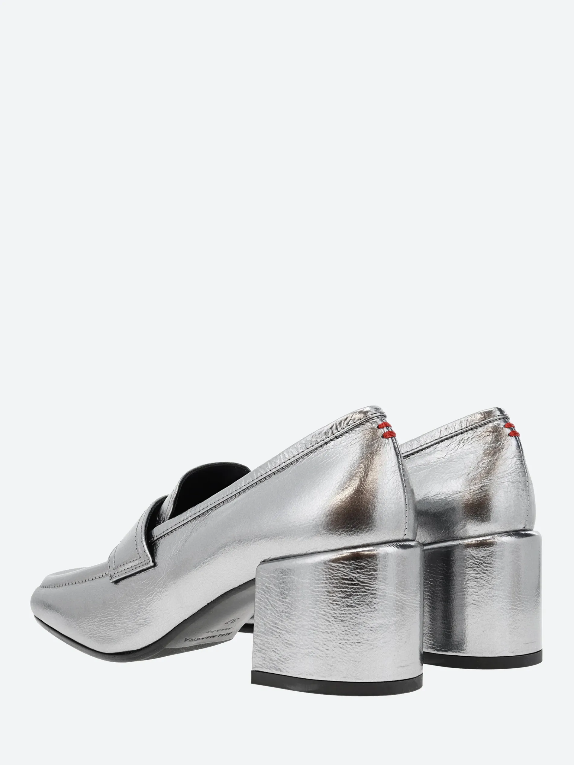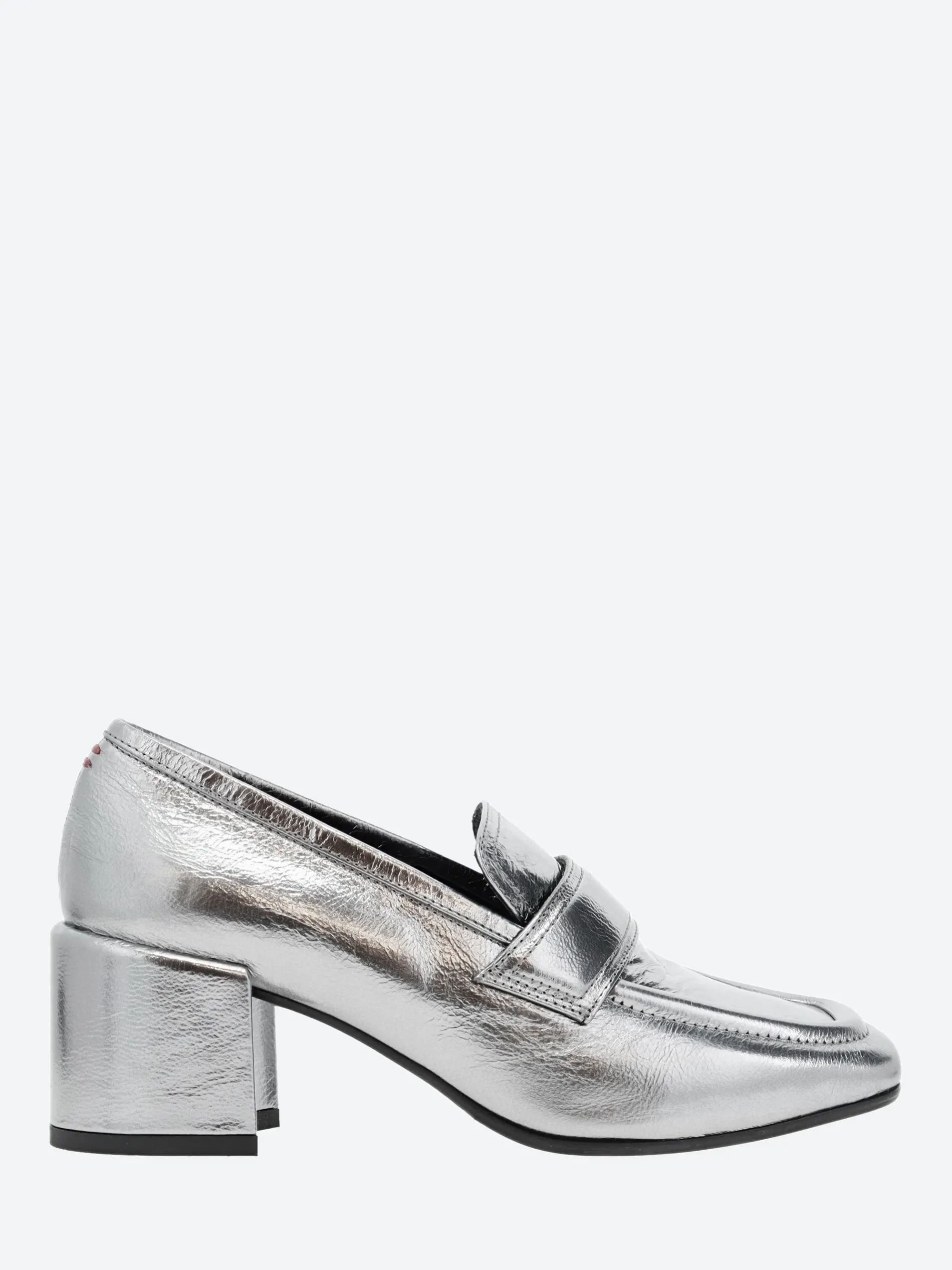 Halmanera heeled loafer in shiny leather. A slip-on style for easy on and off. Finished with a self covered wooden heel.
