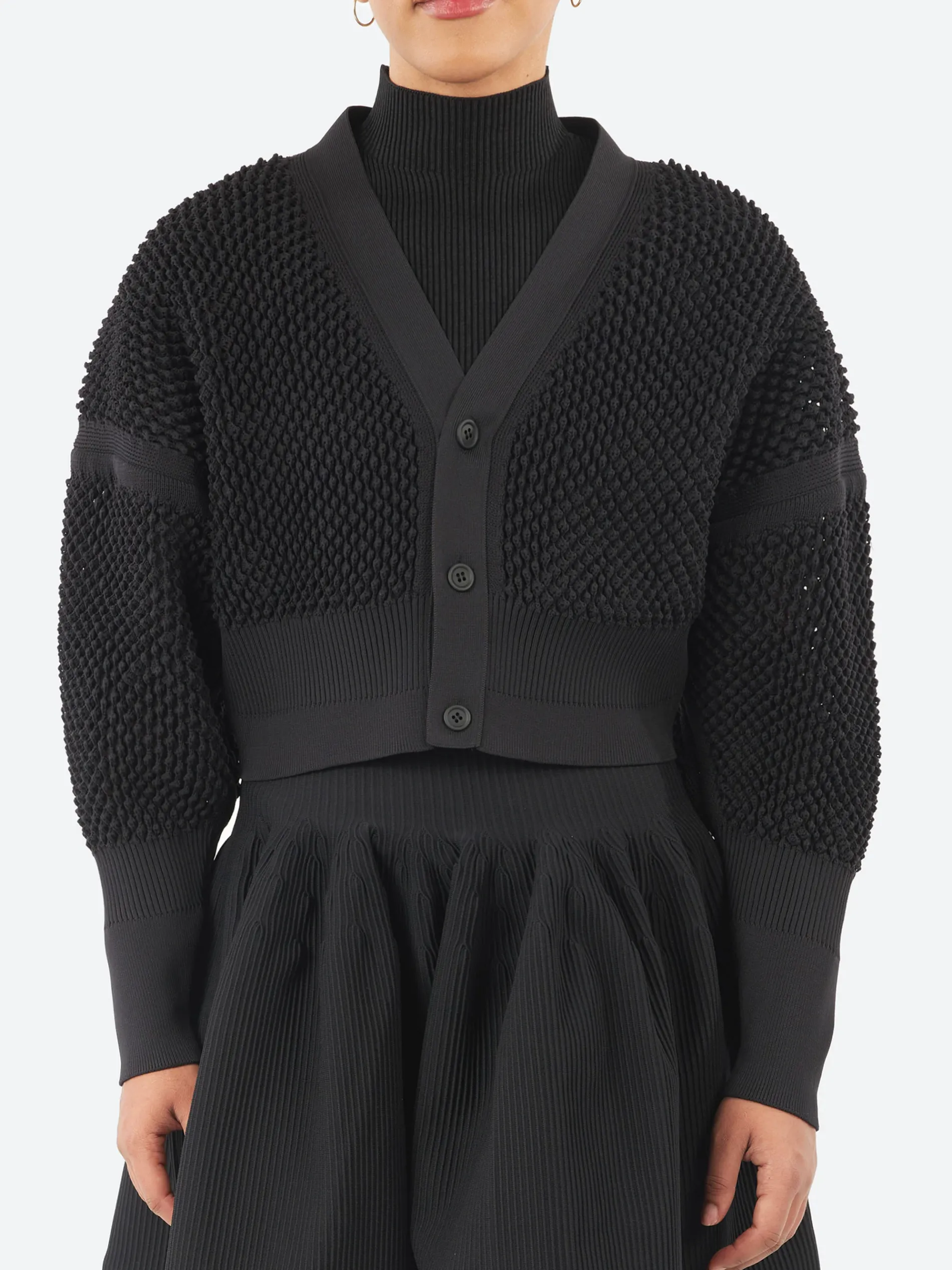 The CFCL Lattice Cropped Cardigan features a unique mesh knit structure with a slim-fitting waist. It combines two different rib knit styles on the cuffs and hem, offering a cropped design for a modern, stylish look.