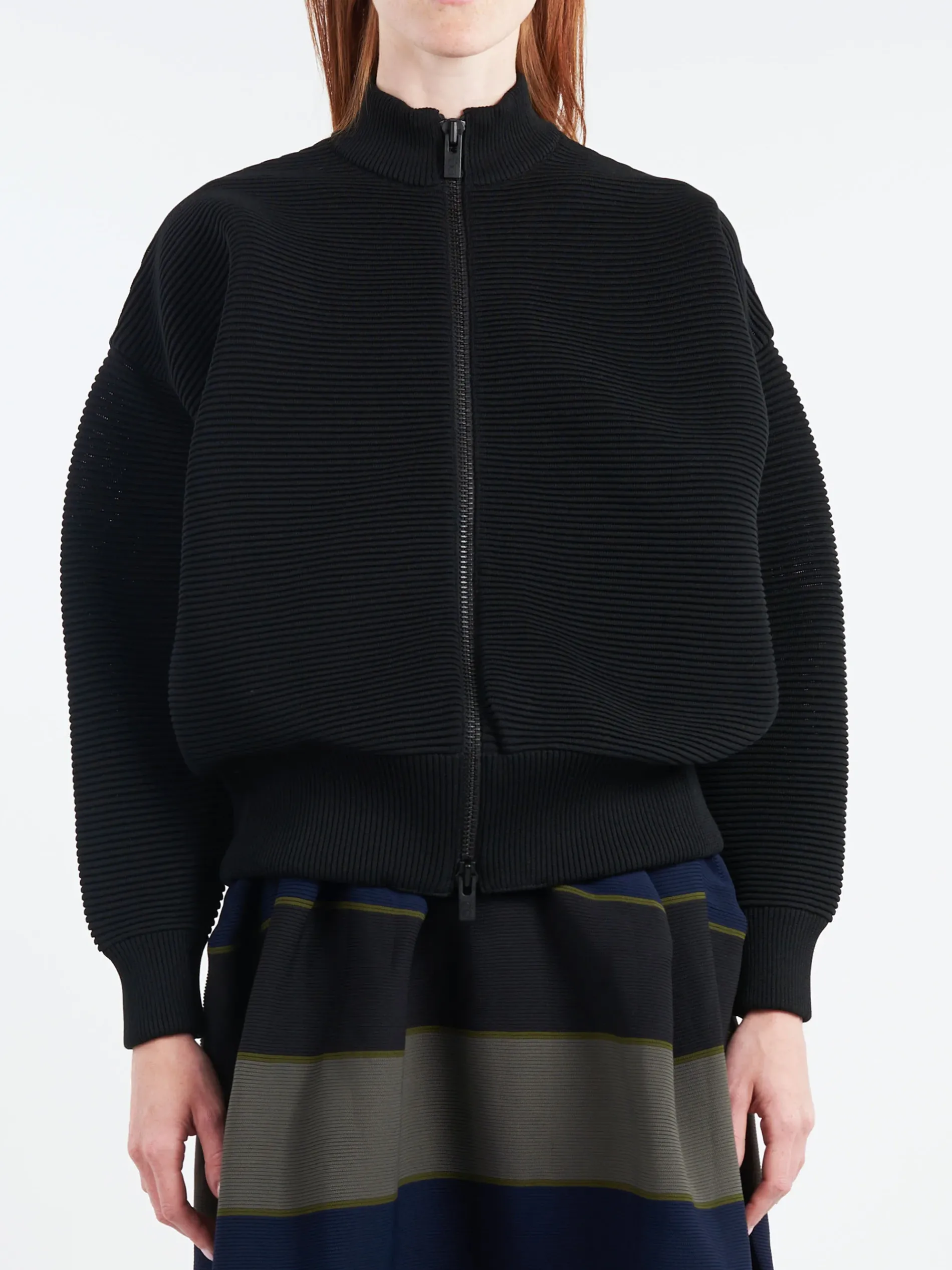 This bomber jacket from CFCL has a textured pintuck knit structure. With its voluminous silhouette and high neck, it provides endless versatility.
