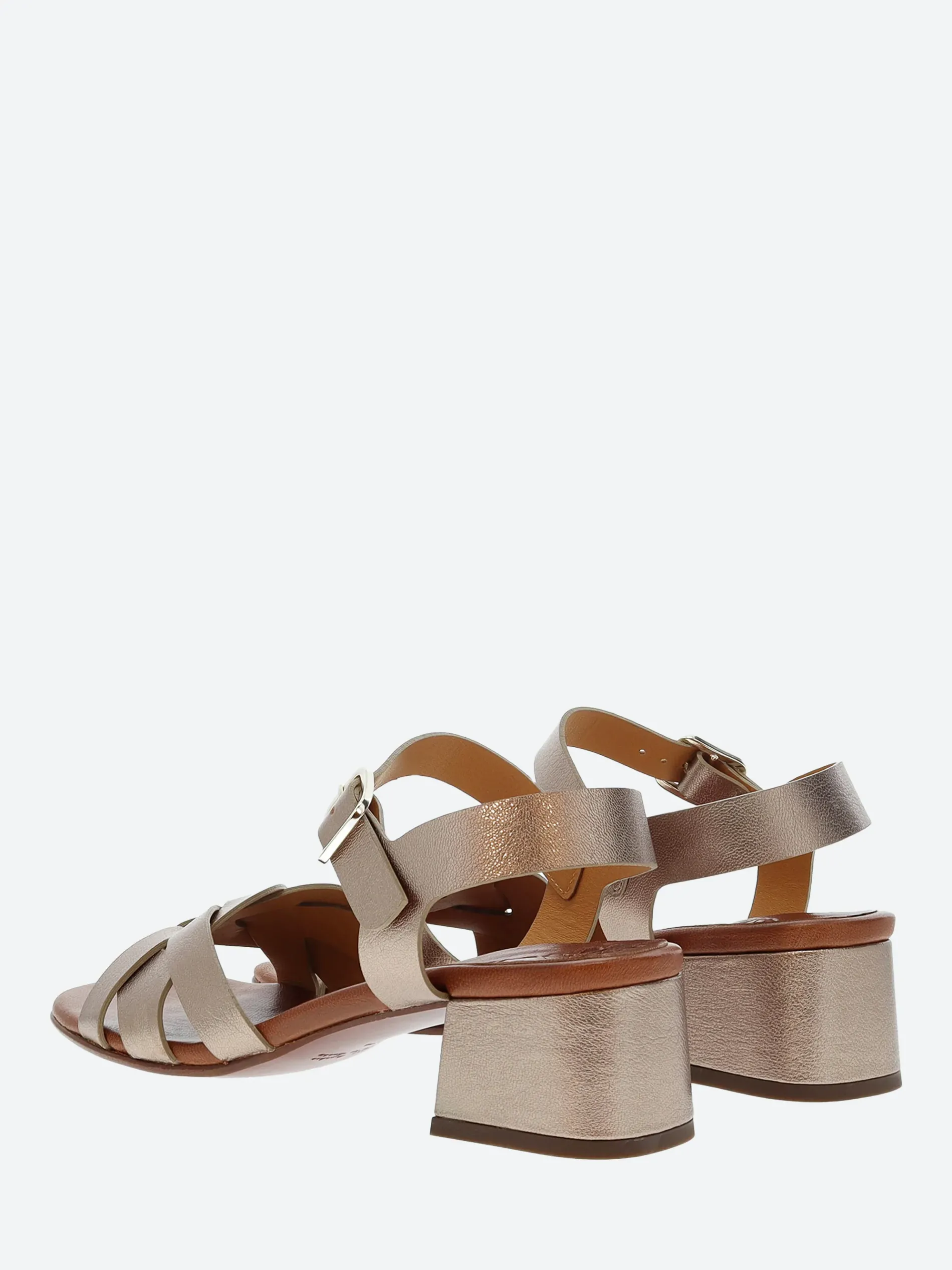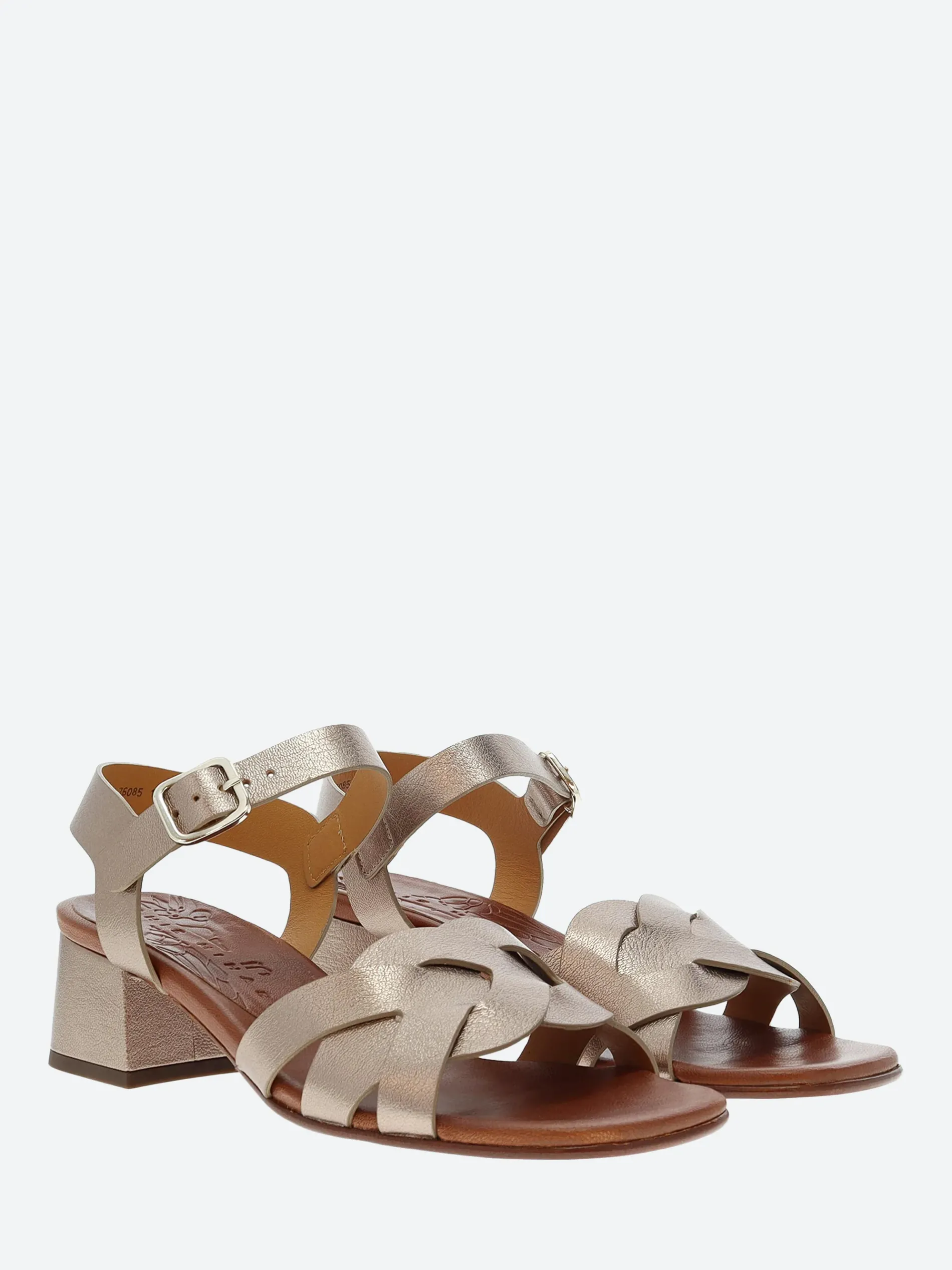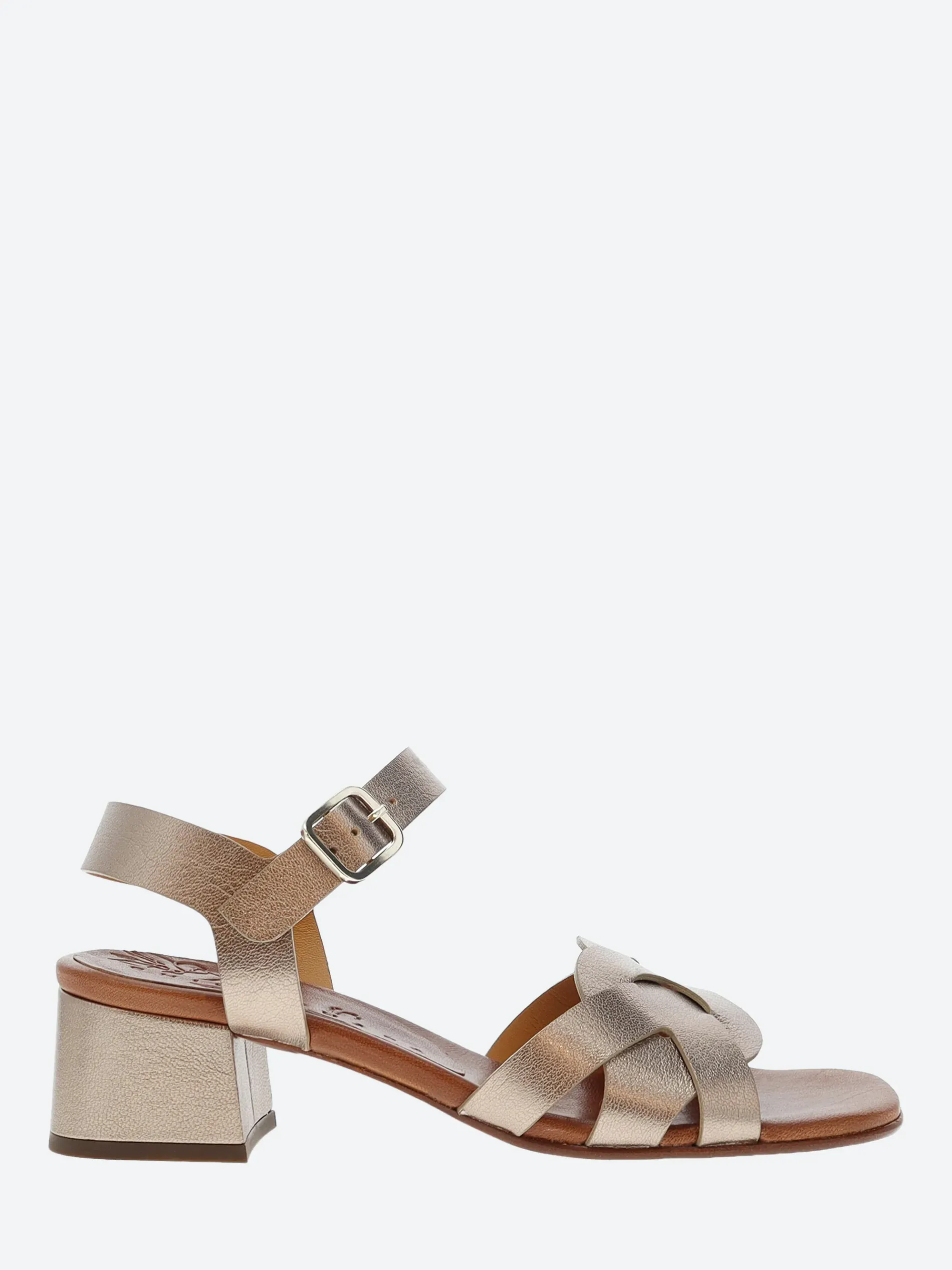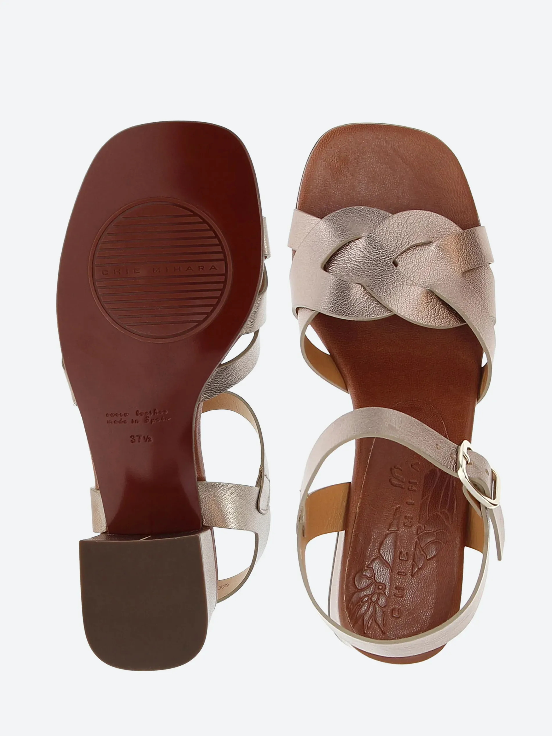 Chie Mihara’s Quara woven sandal made from leather, sitting on a block heel that elongates your profile.