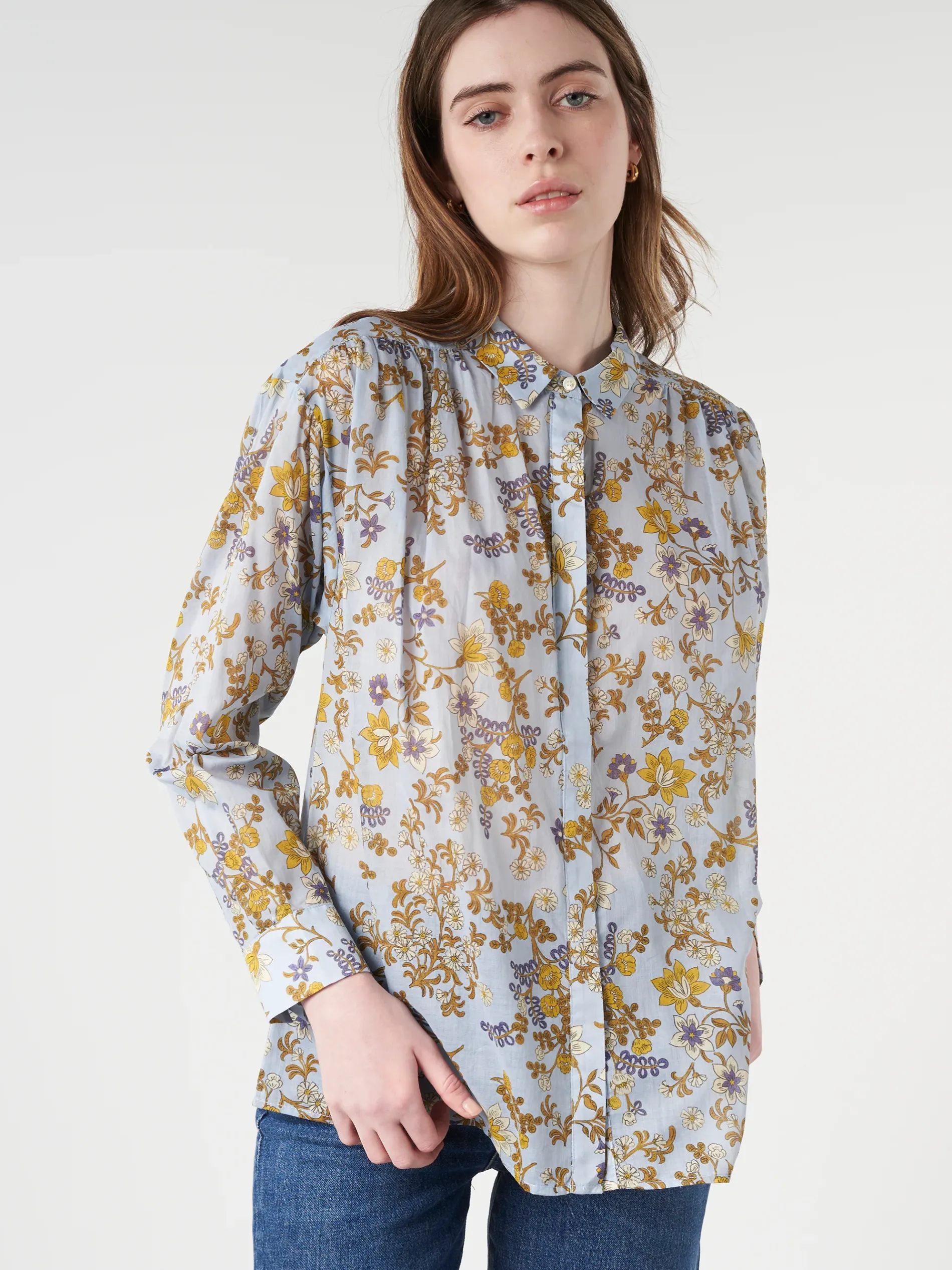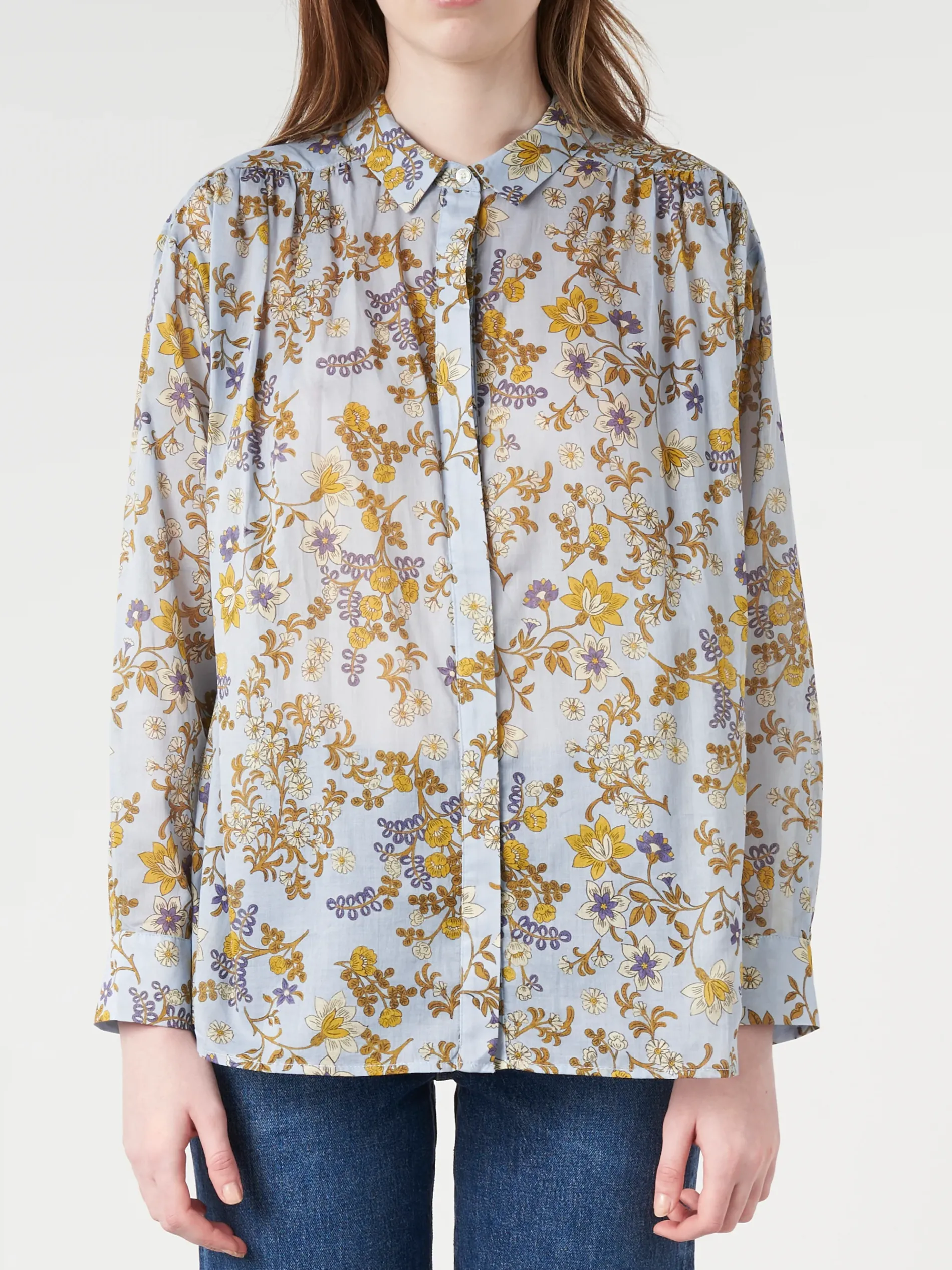 Oversized button up shirt with gathered details at the shoulder, made from a Liberty-inspired seasonal floral print cotton.