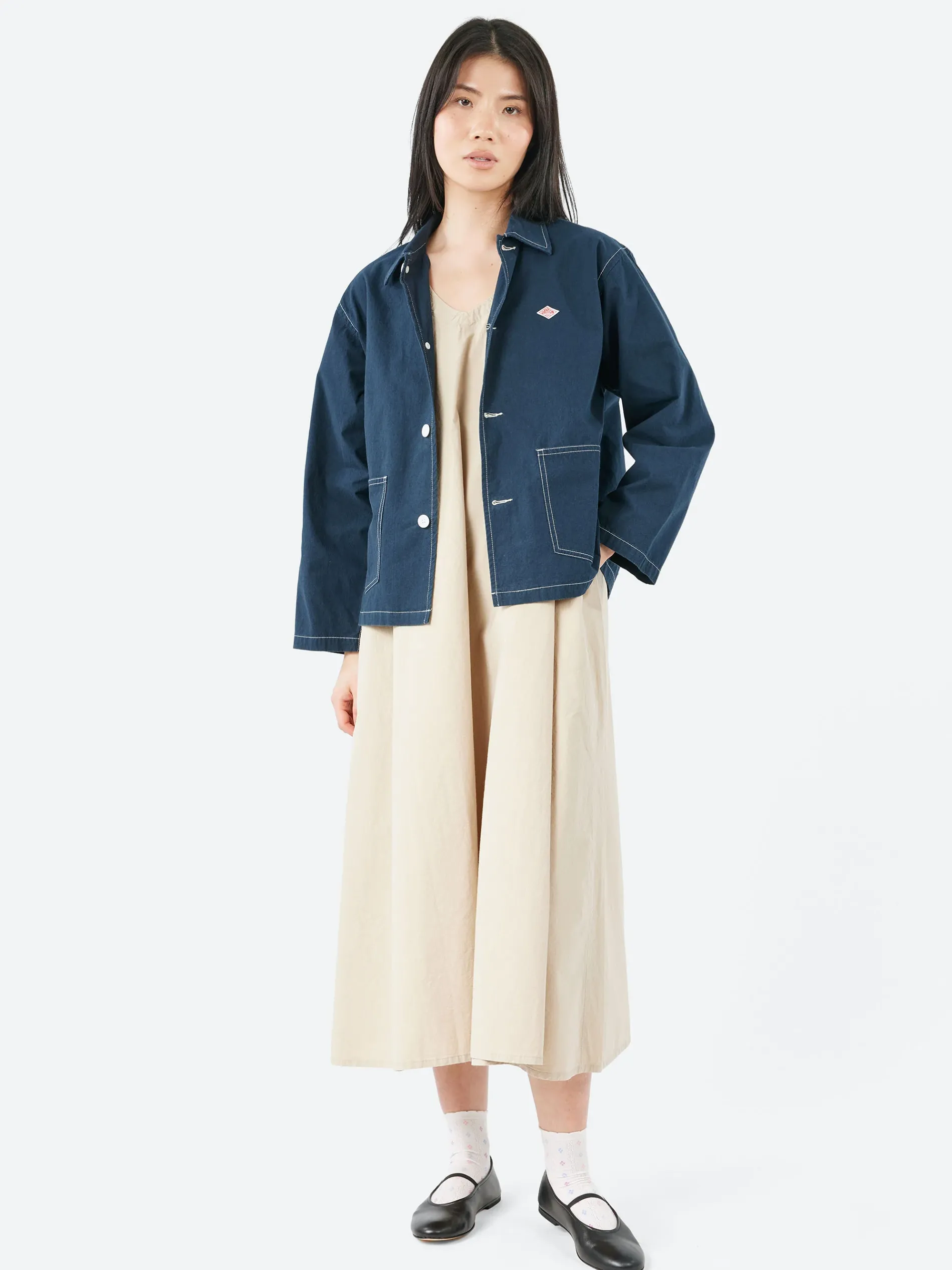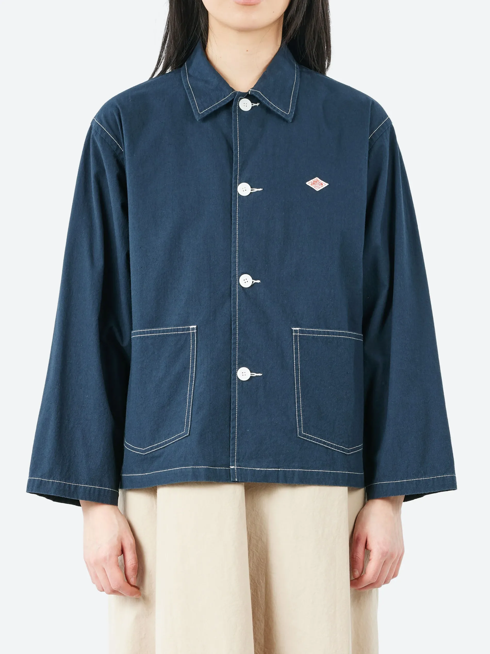 This Danton workwear-inspired shirt coverall is crafted from a lightweight, yet moderately firm fabric. Its loose silhouette offers a casual yet refined look, making it versatile for various occasions. The white buttons and contrast stitching add a subtle accent. Perfect as light outerwear for spring and autumn, it also serves as a stylish option for those cooler summer evenings.