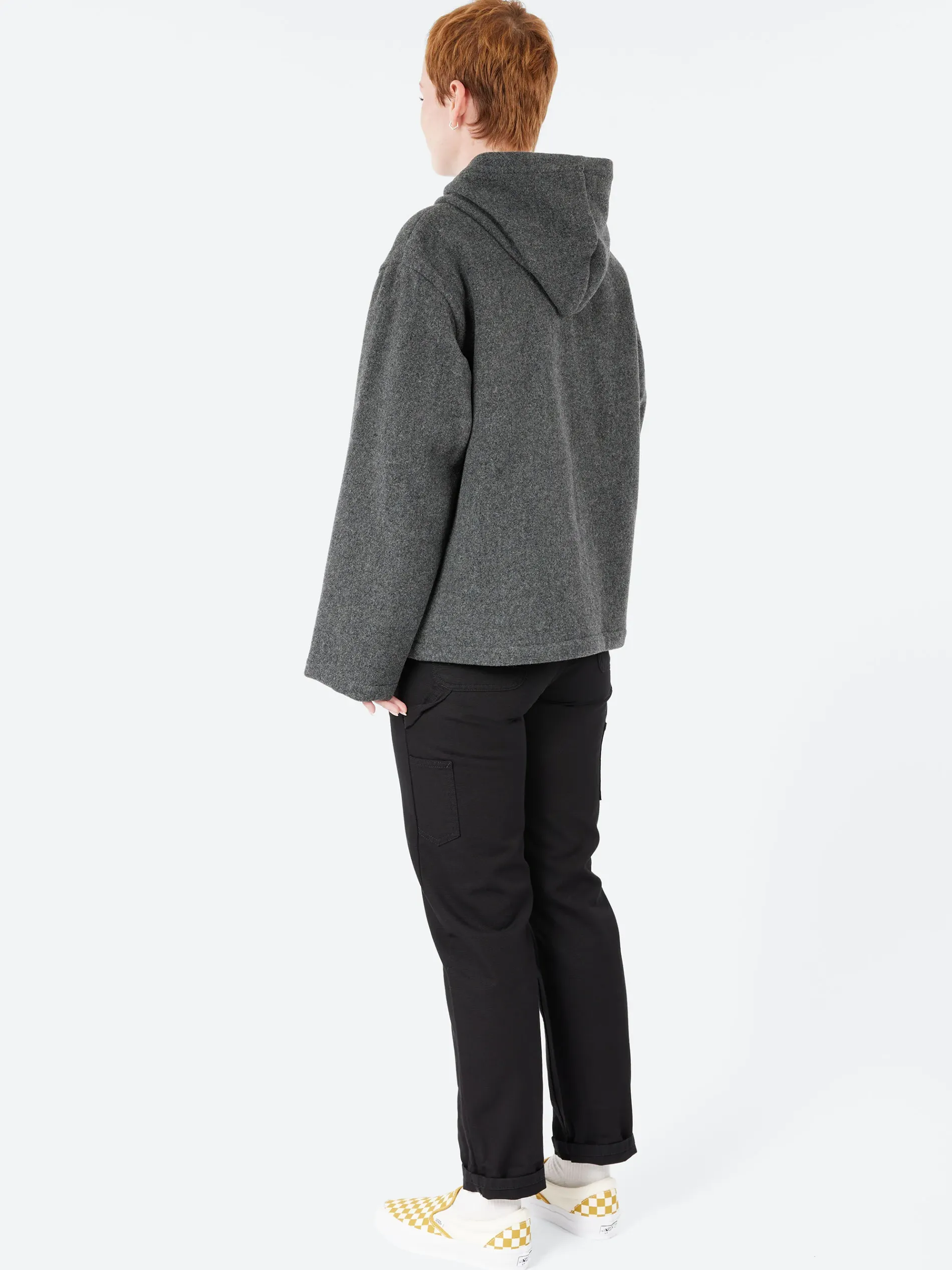 Danton hooded jacket with wide silhouette. Made from a double-faced wool pile with texture.