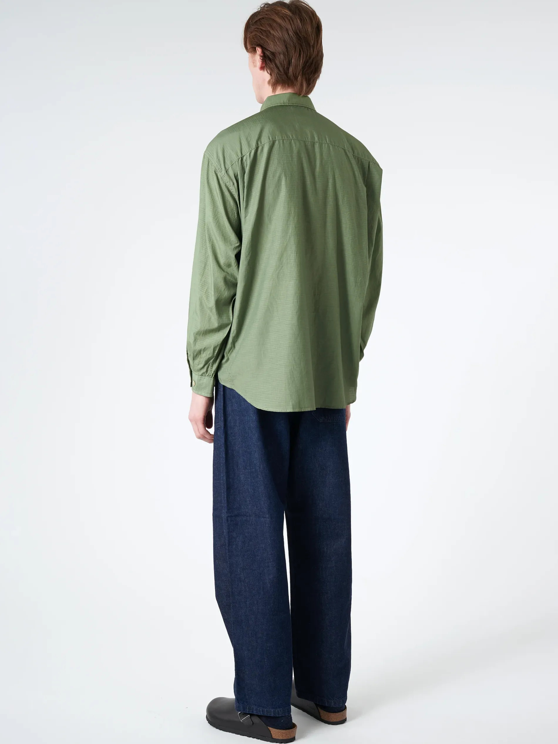 Single-collar shirt with wide silhouette made from ripstop fabric with moderate sheen.