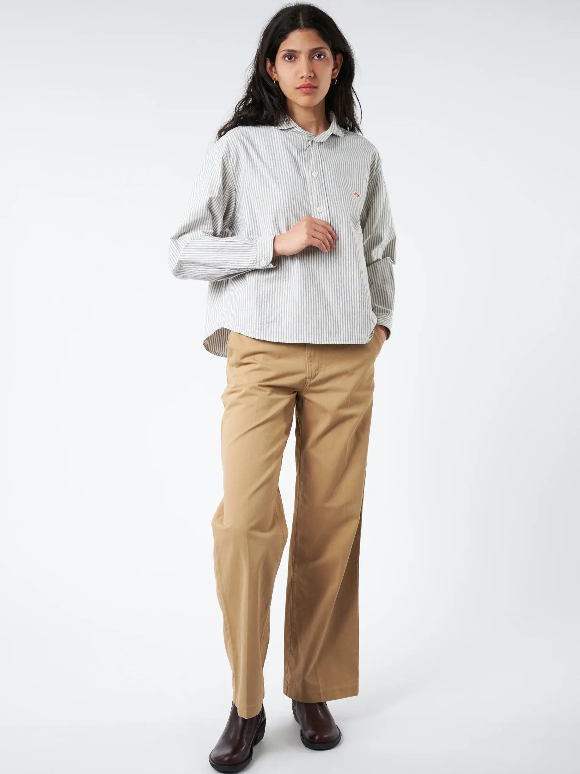 Danton’s signature round collar shirt with newly designed wide silhouette. Made with Japanese oxford fabric woven with high quality supima cotton, which is known for its extra-fine quality and texture.
