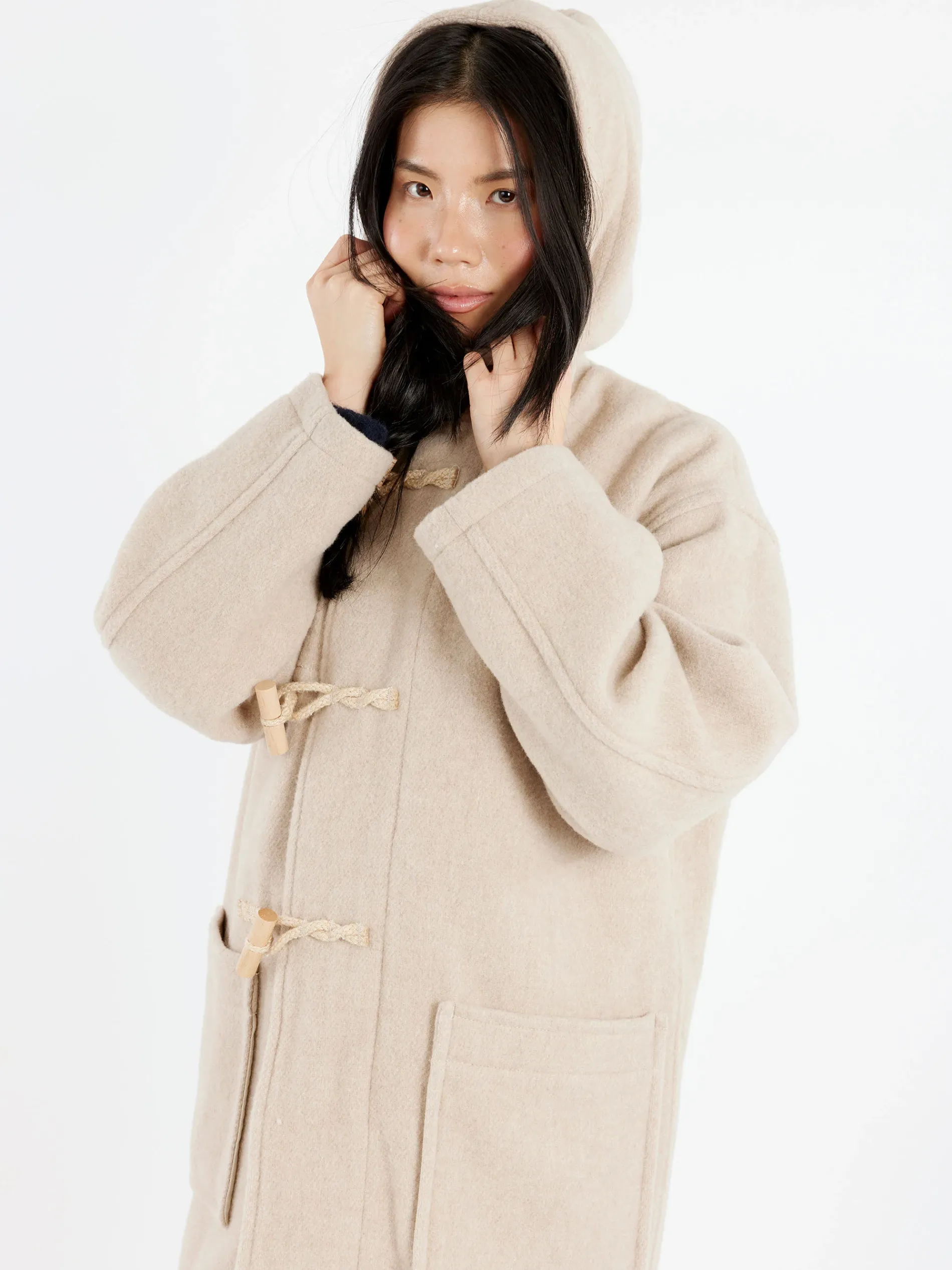 A duffle coat with a classic design and a mid-length cut. Made of lightweight wool pile fabric, this coat boasts a brushed finish on both sides for extra warmth.