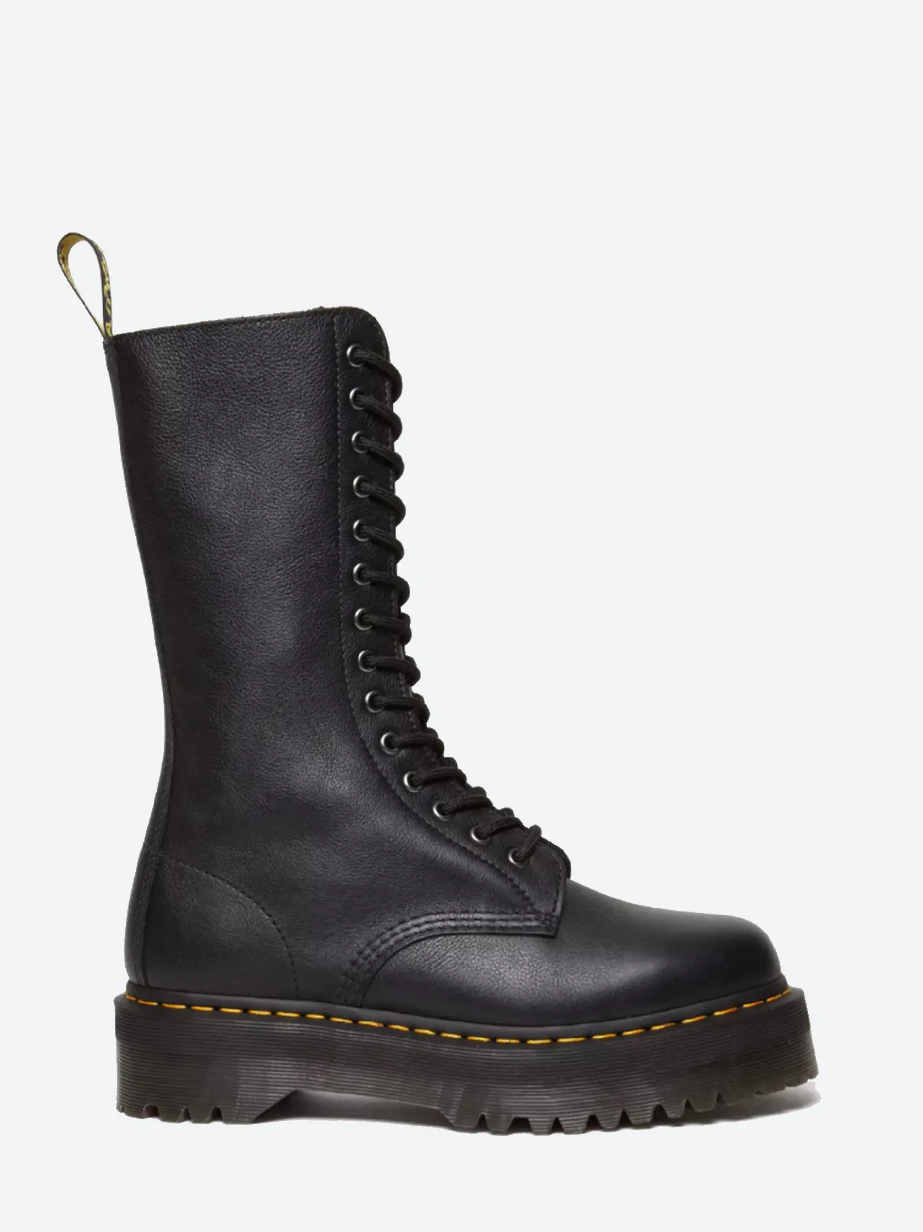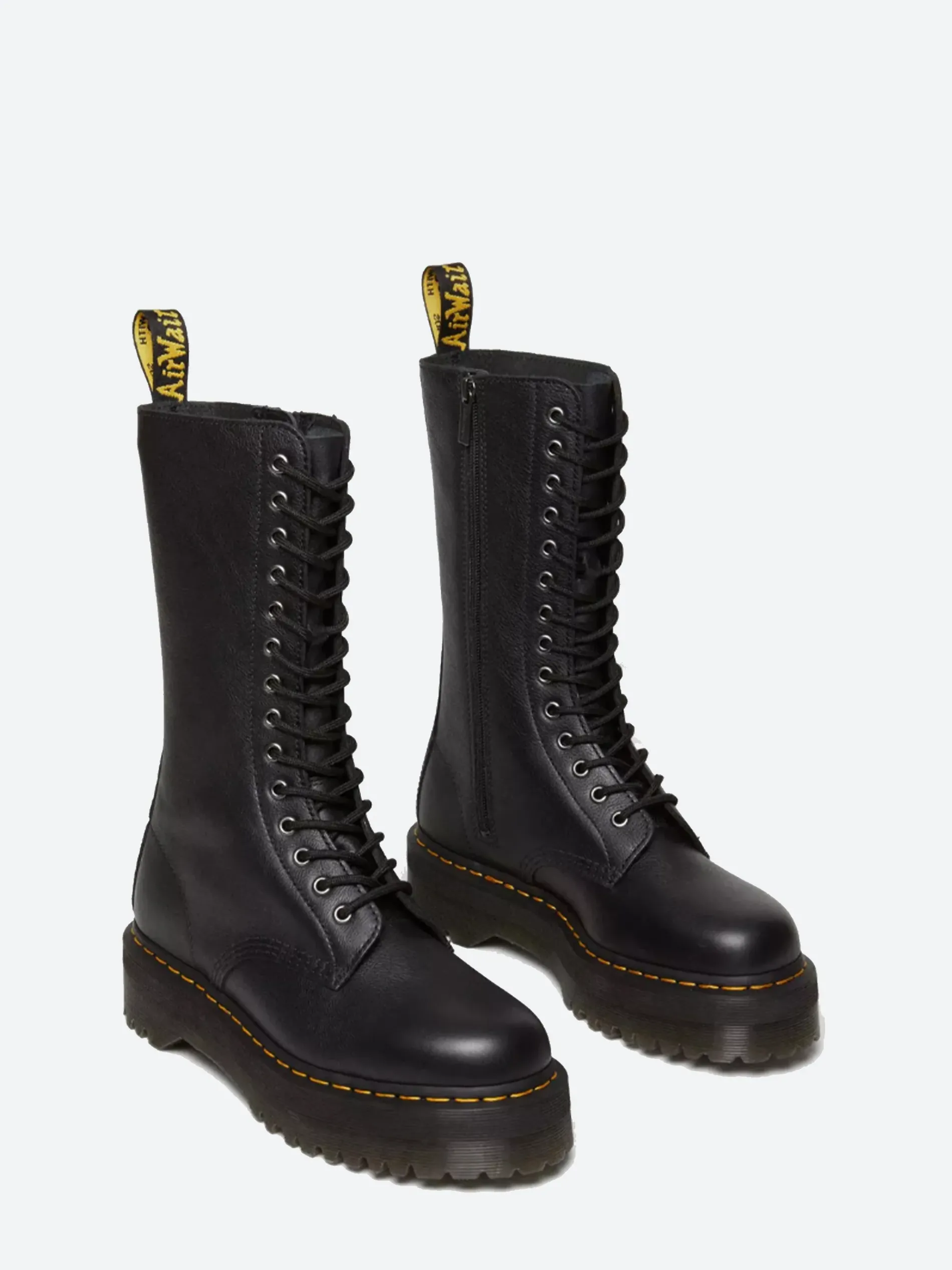A tall boot with a big attitude. The 1B99 Quad boot is an amped-up rework of Docs classic 14-eyelet silhouette — rebuilt in supple Pisa leather and stacked on a formidable Quad sole.