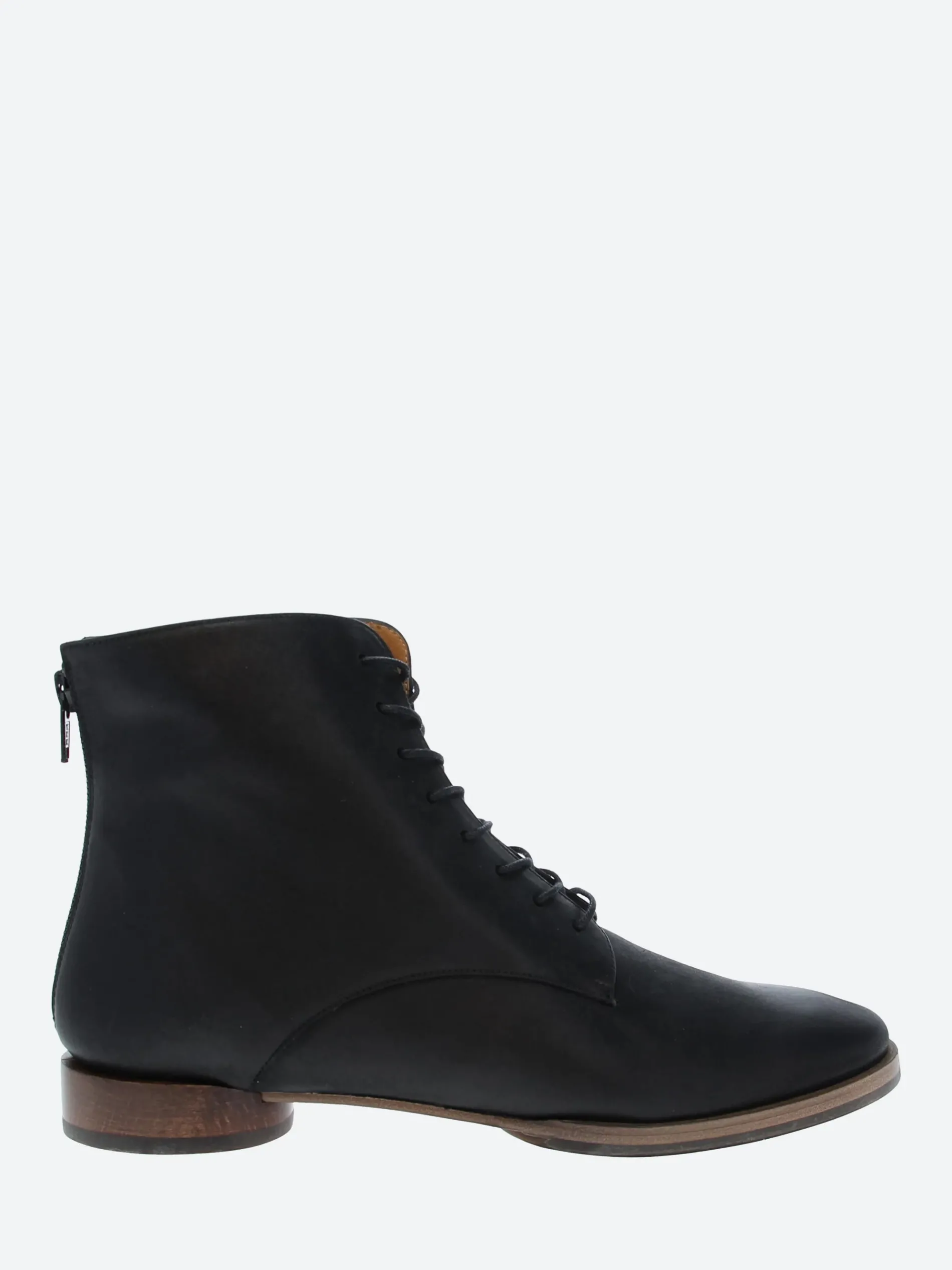Coclico adds modern details to a classic style. The Eclair lace-up boot has a distinctive flat round heel and patch sole.