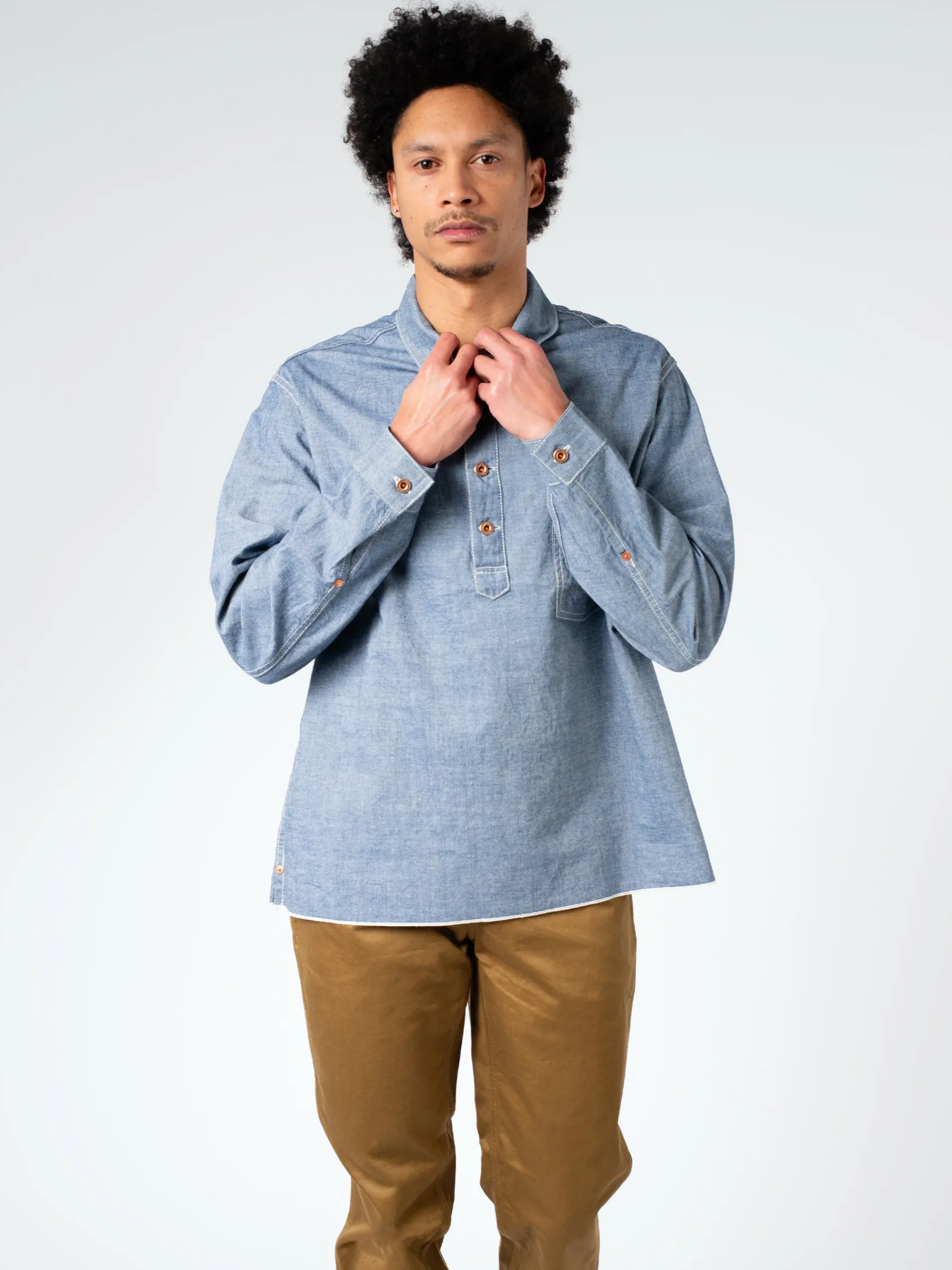 FOB FACTORY 9oz chambray pullover shirt woven on an old fashioned power loom. Rugged and vintage, the width is slightly roomier than the traditional style.