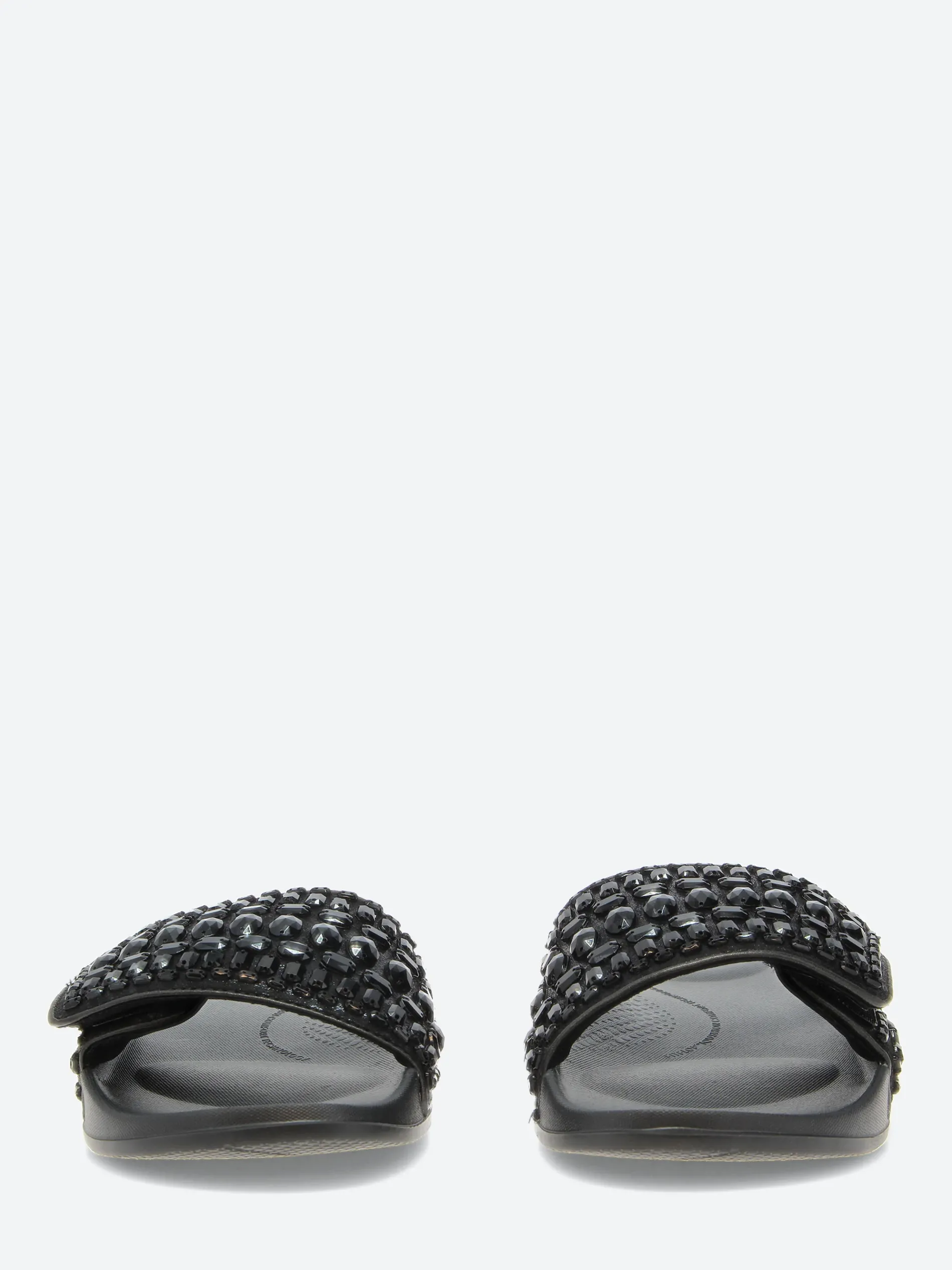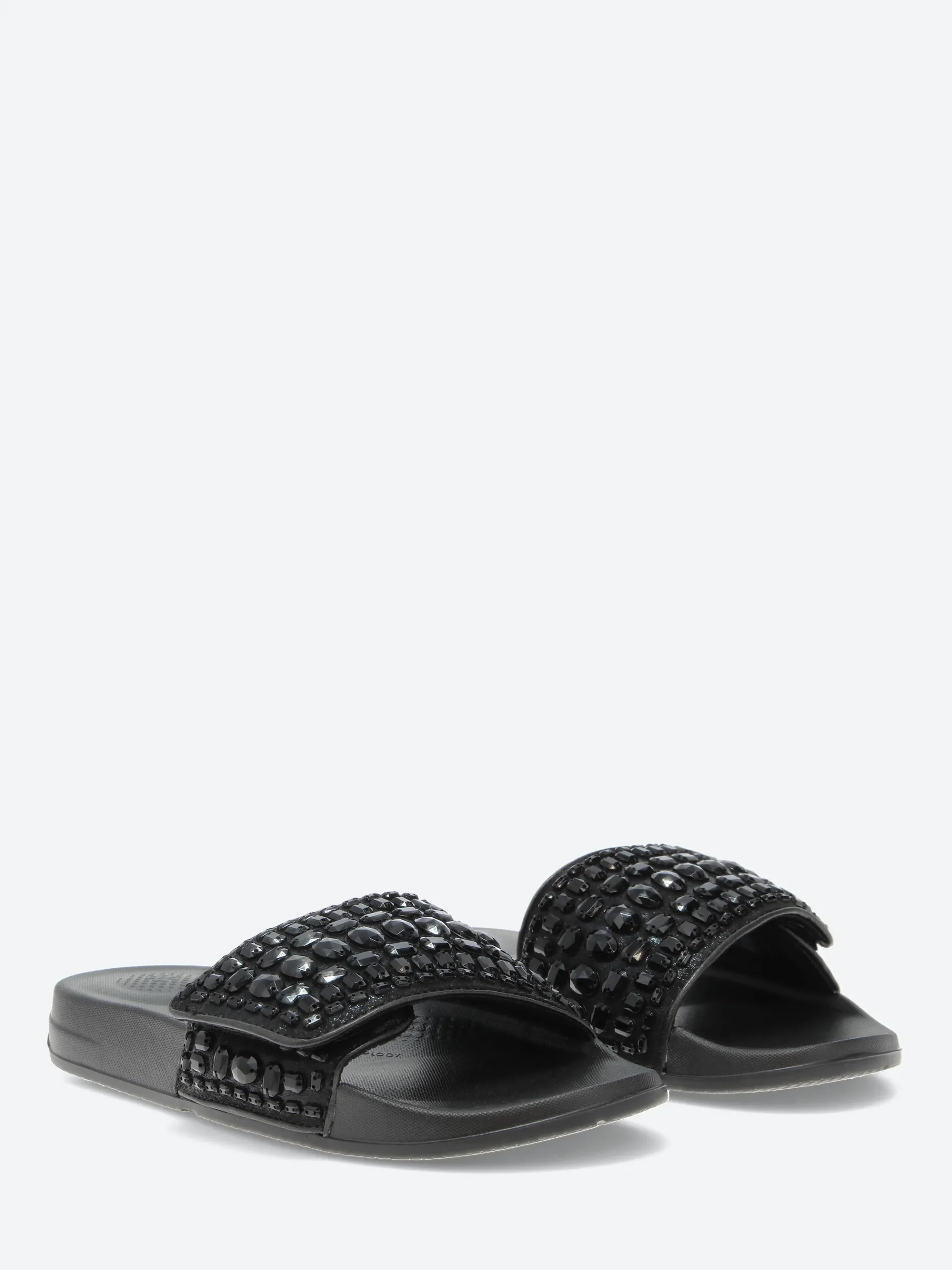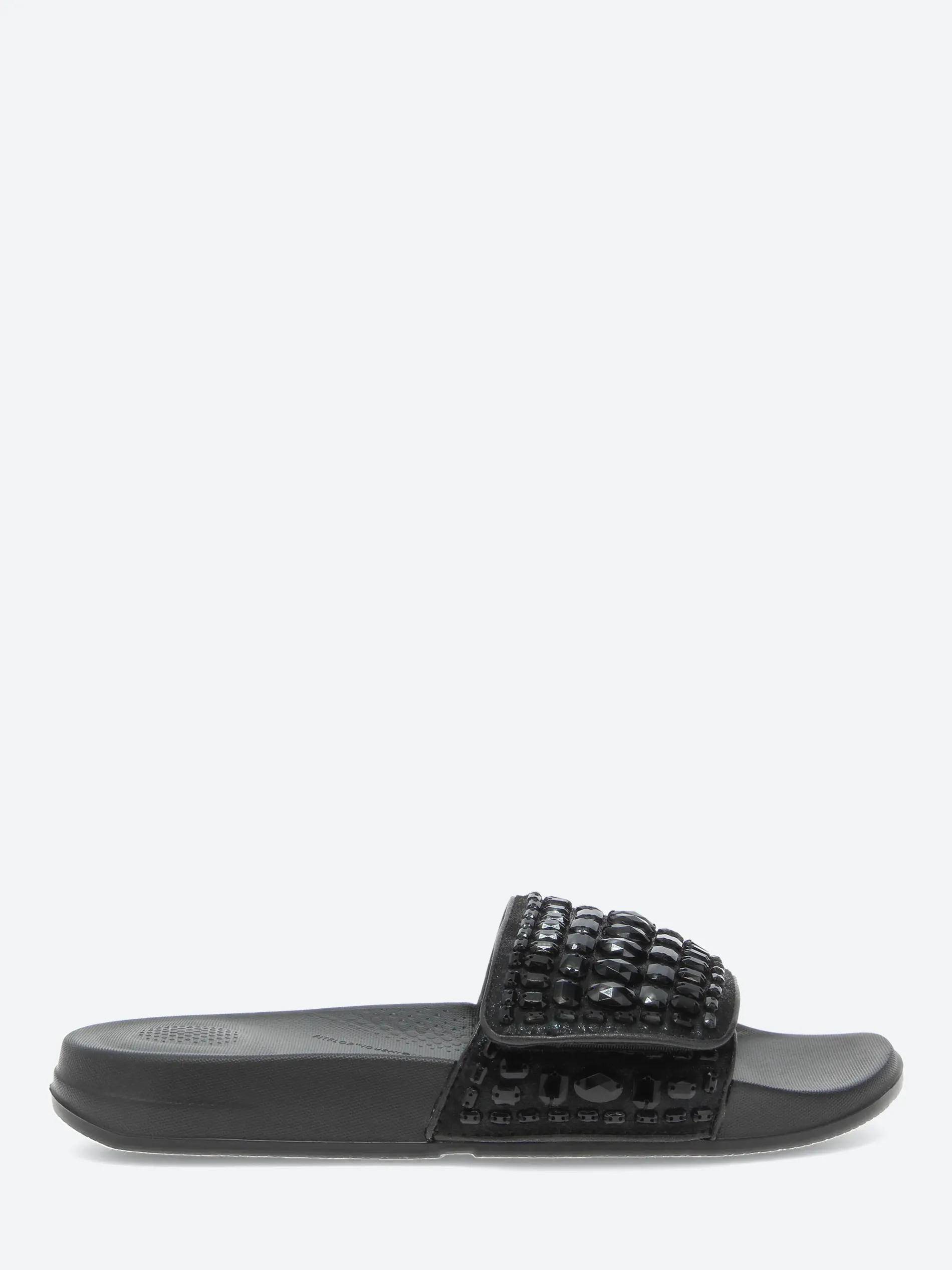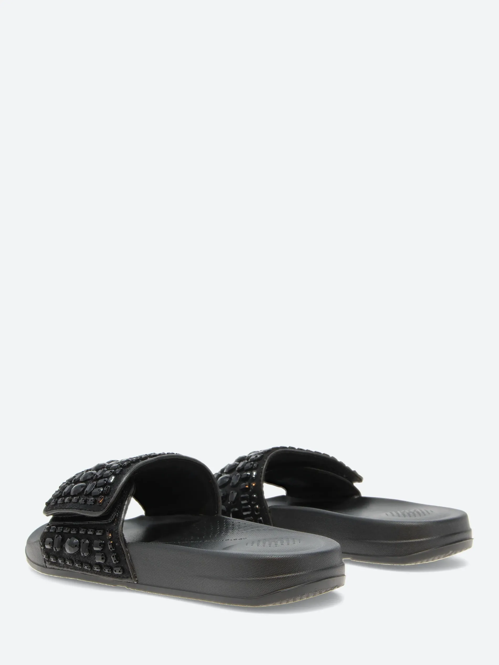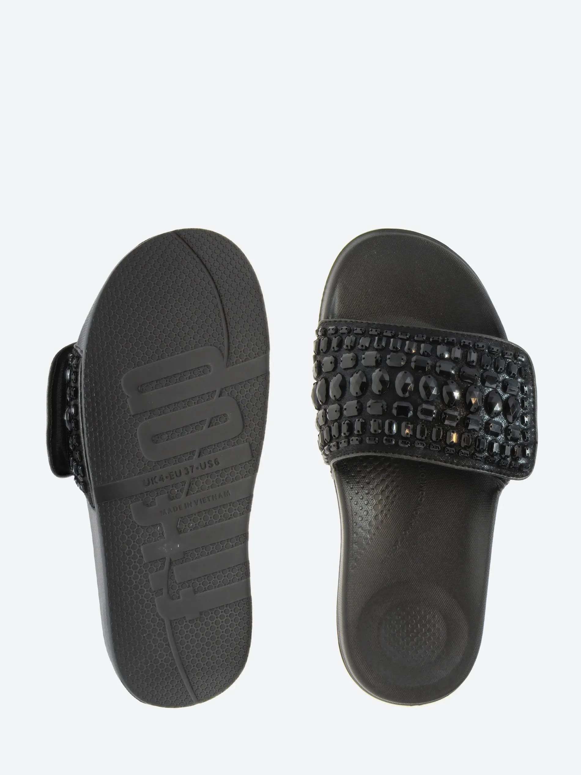 The FitFlop iQushion Adjustable Multi-Crystal Slides are a stylish and comfortable footwear option designed for all-day wear. These slides feature FitFlop’s proprietary iQushion™ technology, which includes ultra-cushioned impact-absorbing pillows, ergonomic arch contouring, and rebound soles to provide superior comfort and support.