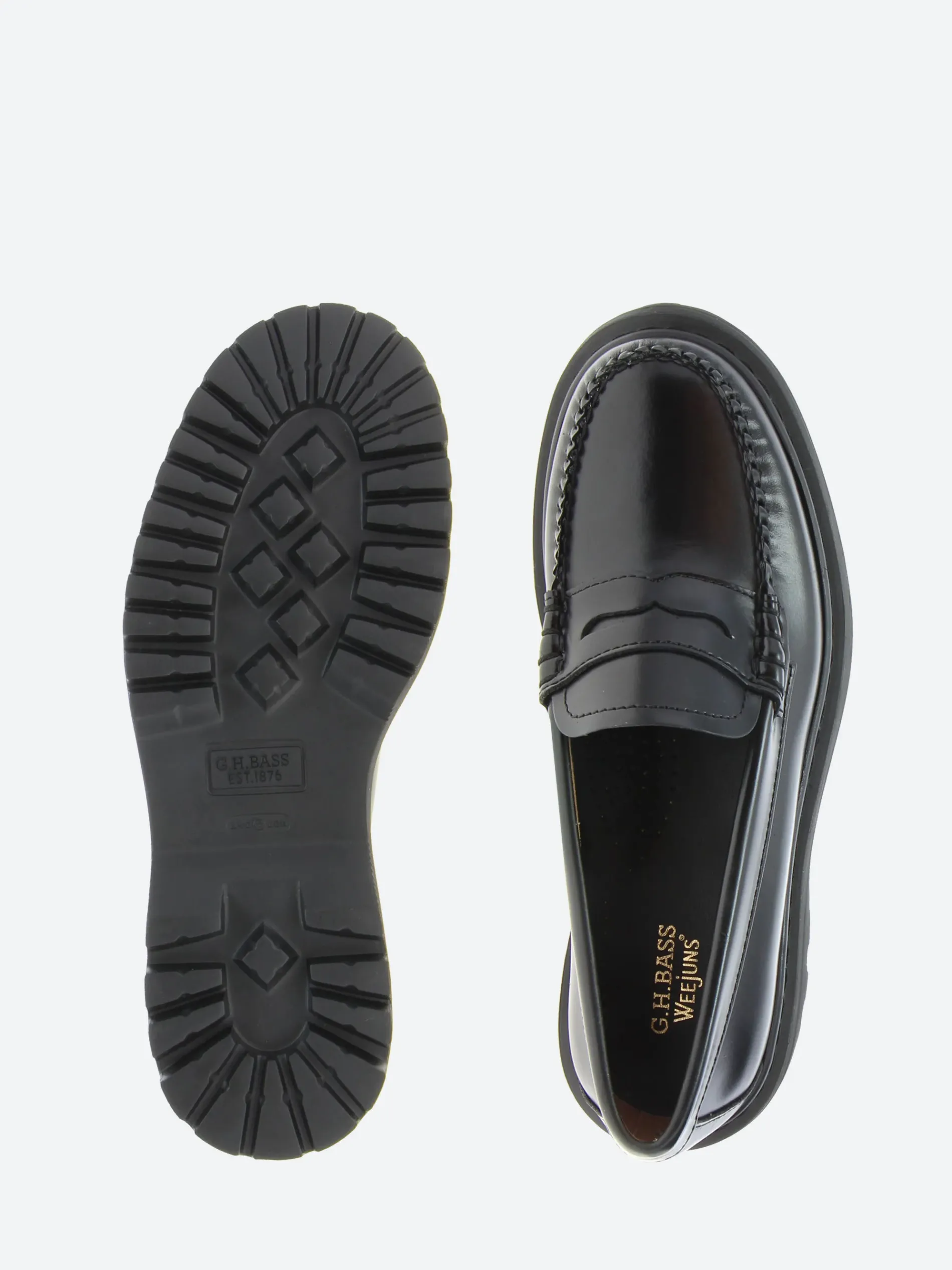 The G.H. Bass Weejun moc toe penny loafer has been given a modern update with a bold, chunky lugged sole. This revamped version blends the classic loafer style with a more rugged, contemporary twist, making it perfect for those who want a mix of traditional and trendy in their footwear.