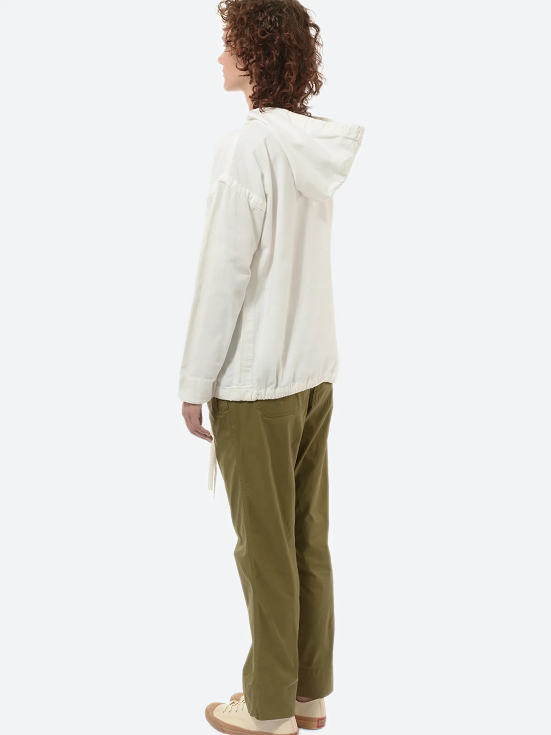 A hooded pull-on smock shirt that fits rather loose and comfy. Made from a premium raw cotton.