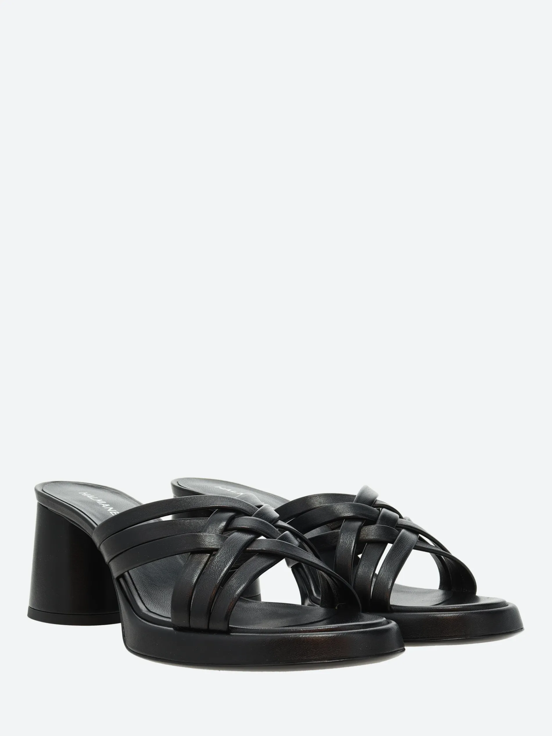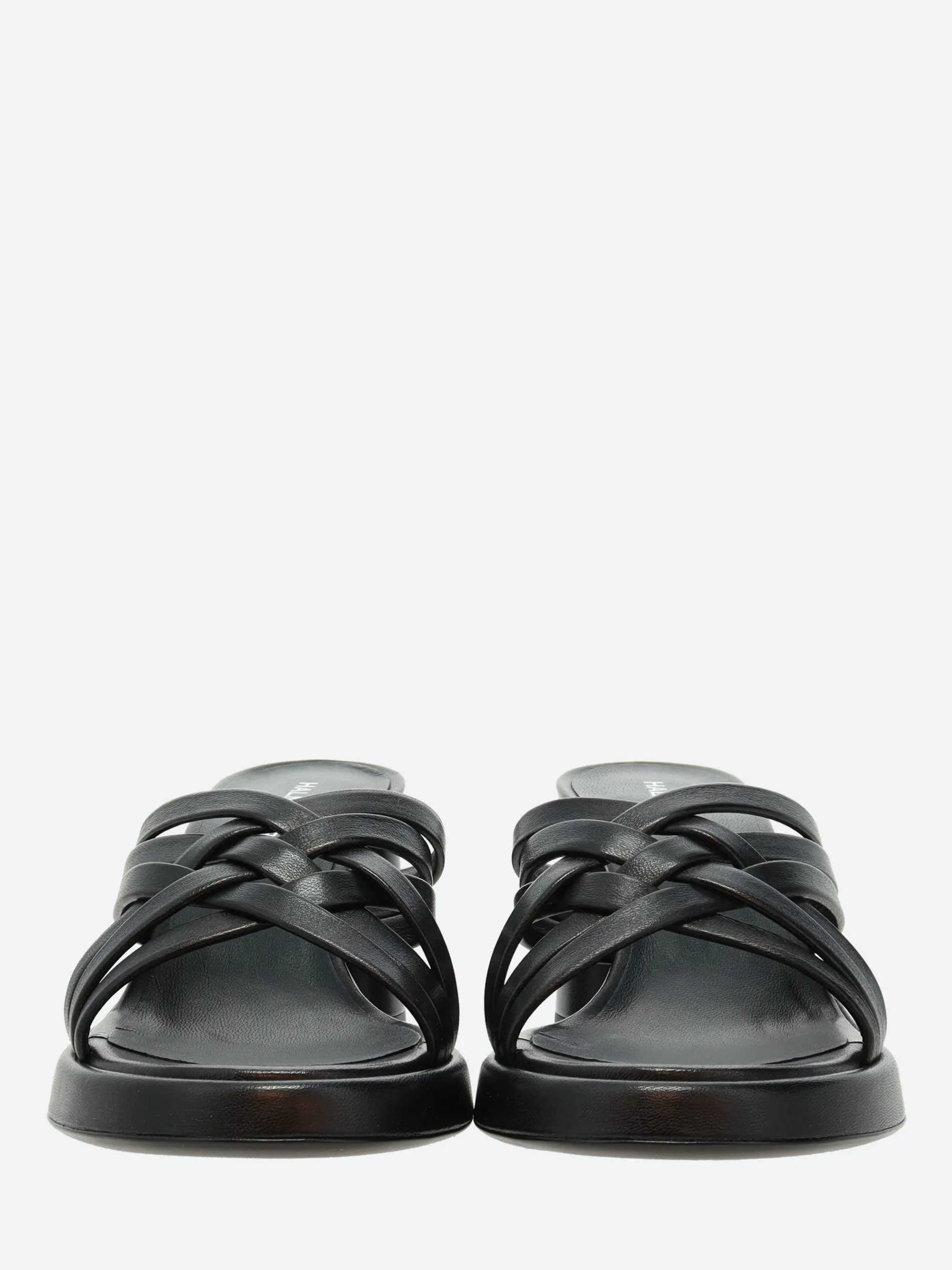 Crafted with woven leather straps, this versatile slide features a tubular wrapped heel for an elevated look.