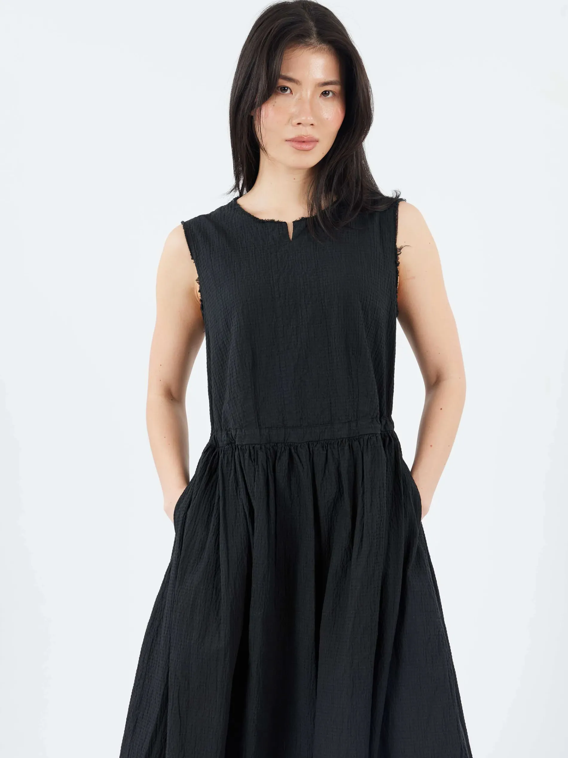 The Hannoh Wessel Dorine dress is a sleeveless design made from a comfortable cotton-linen blend. It features a gathered waist that flatters the figure, along with an optional tonal belt and belt loops for added shape and definition. Side pockets provide a practical and relaxed touch. Ideal for warm weather, the Dorine dress combines effortless style and versatility, making it perfect for both casual wear and more refined looks.