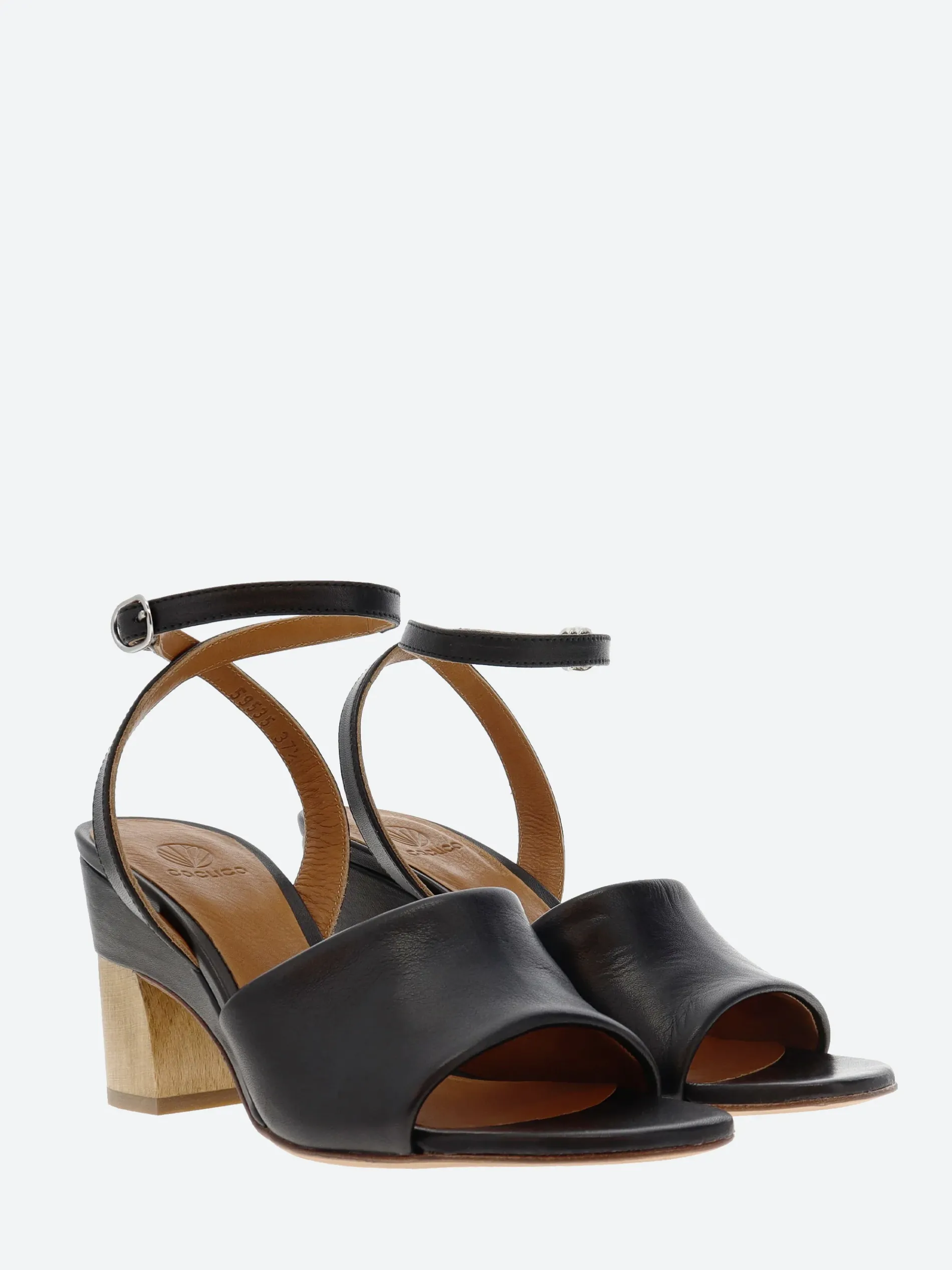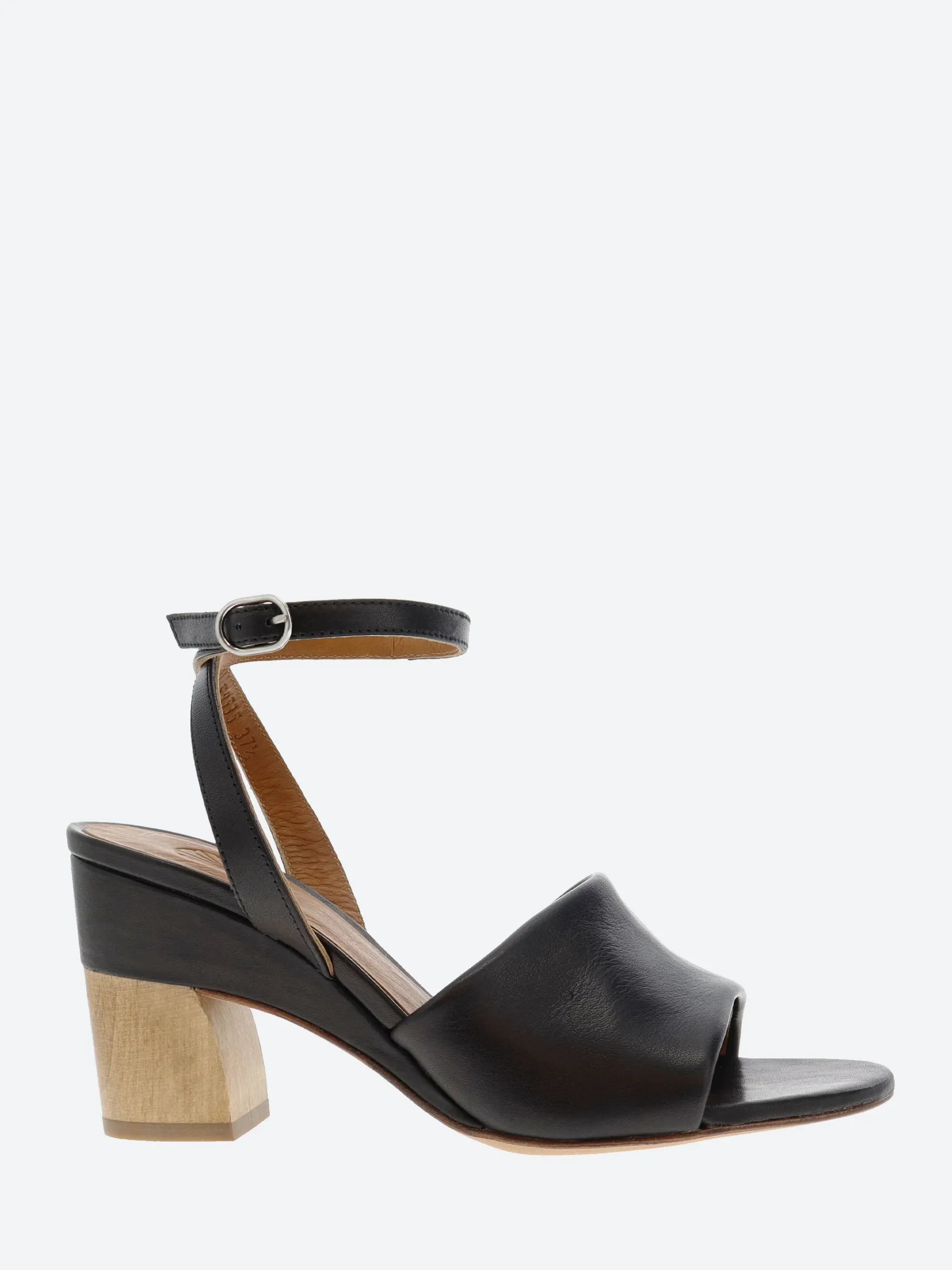 Coclico Iiwi sandal offers generous coverage over the vamp with its wide, supple leather front band. The leather-wrapped demi-wedge insert is capped off by a gently curved walnut wood heel.