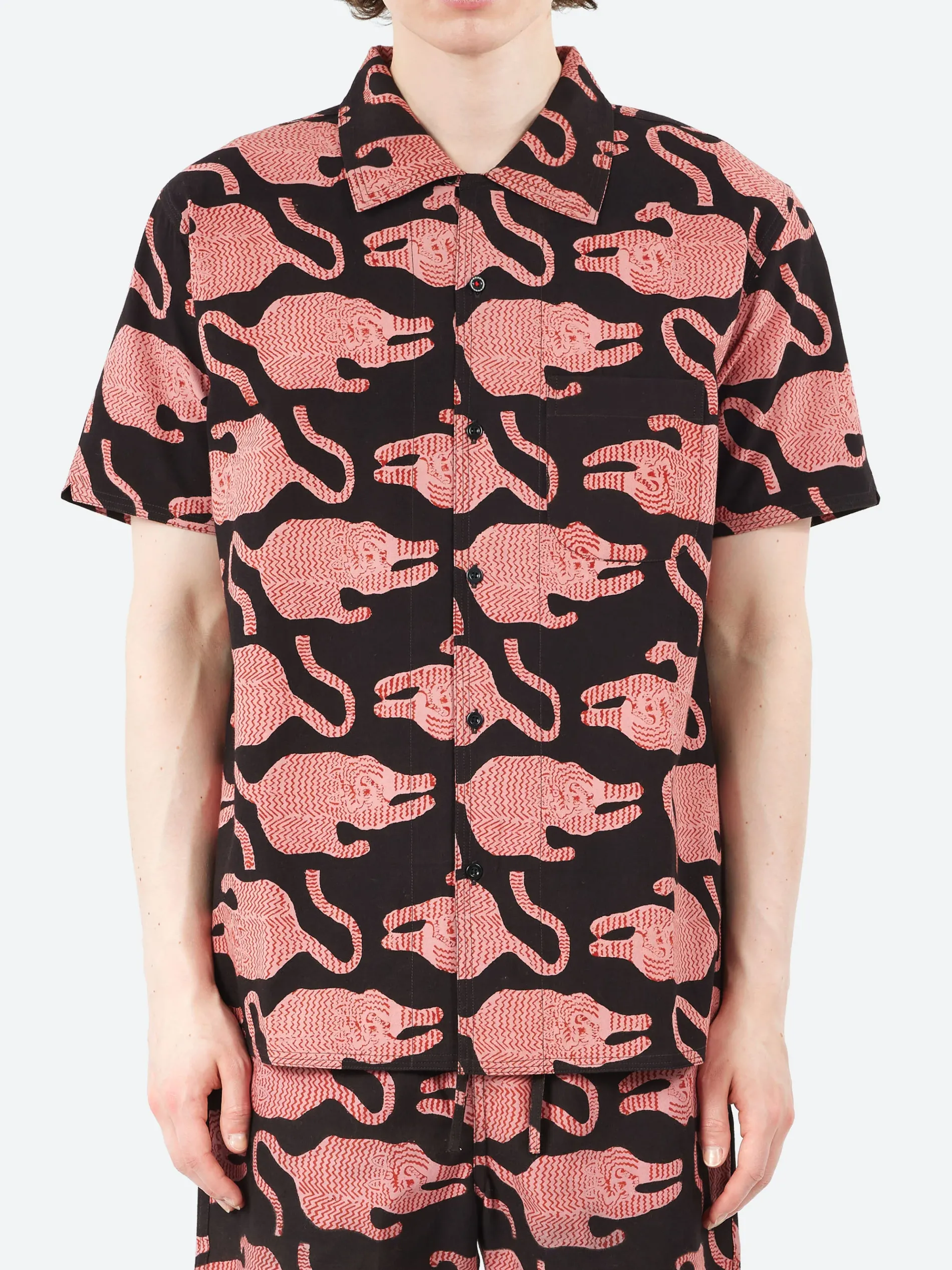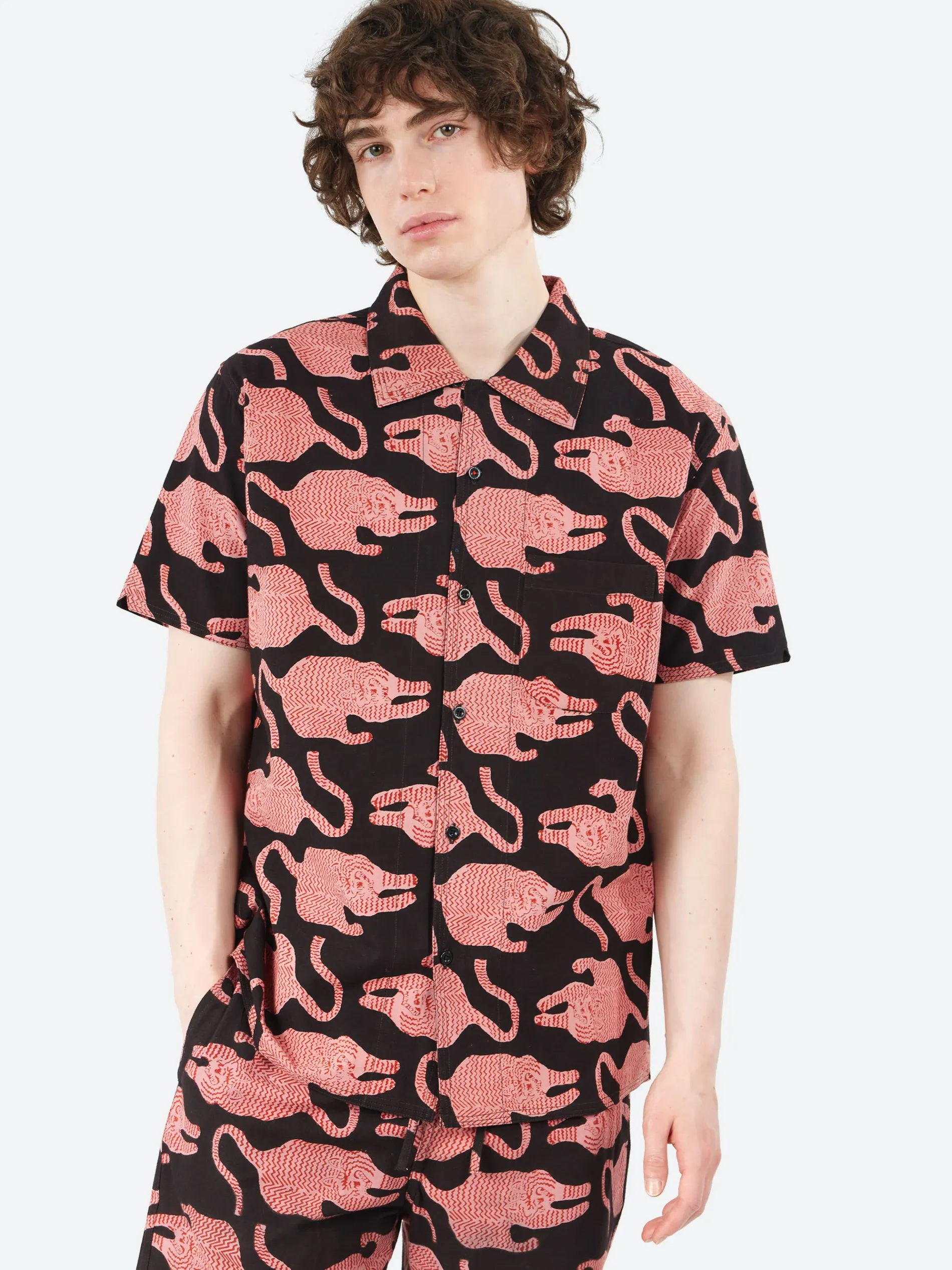 This boxy fit, short-sleeve open collar shirt features fabric printed using traditional hand block printing. Skilled artisans carve wooden blocks to create intricate patterns, which are then carefully hand-stamped onto the fabric using natural dyes. Often requiring multiple layers and blocks, this technique demands both time and precision.