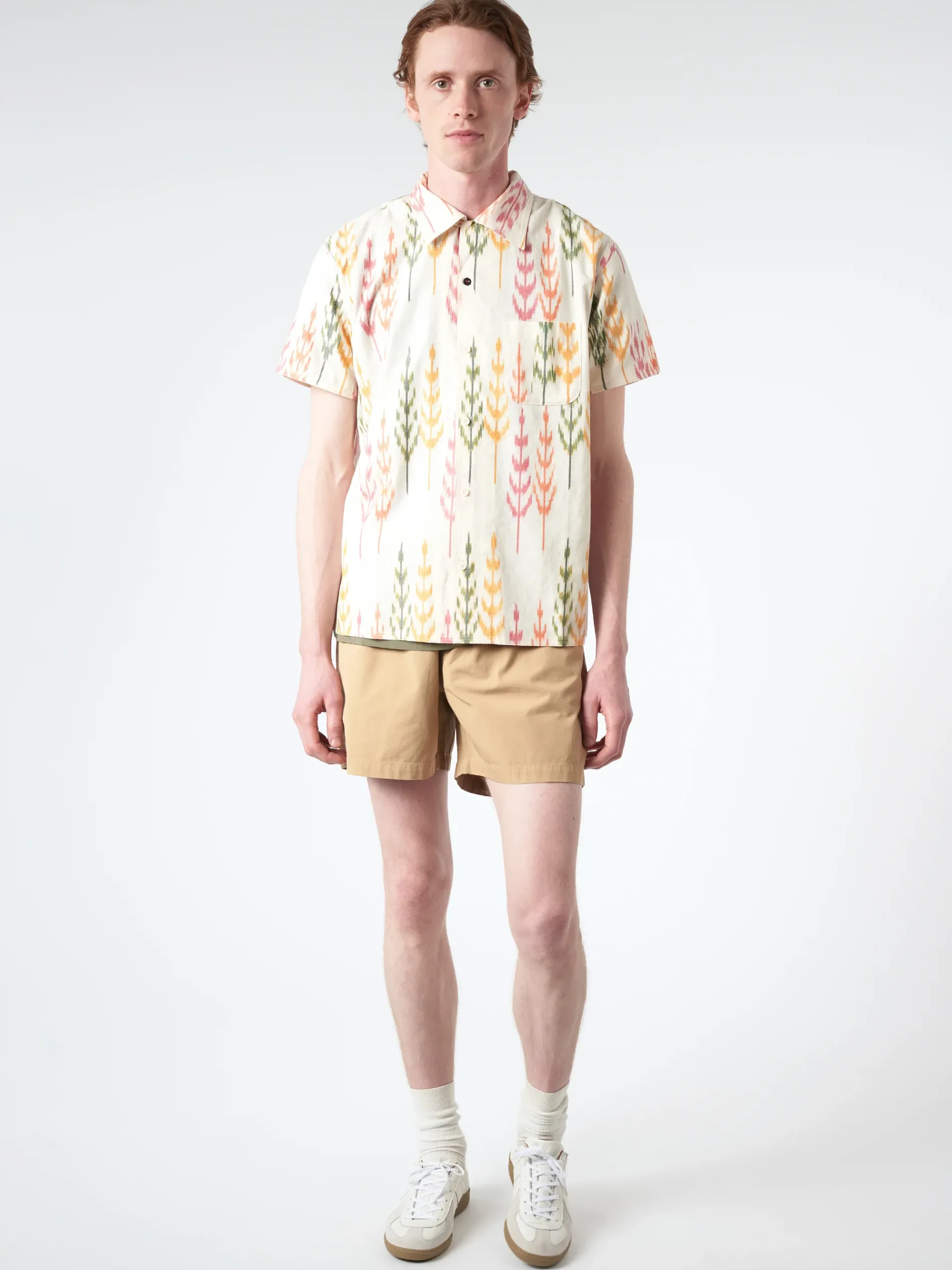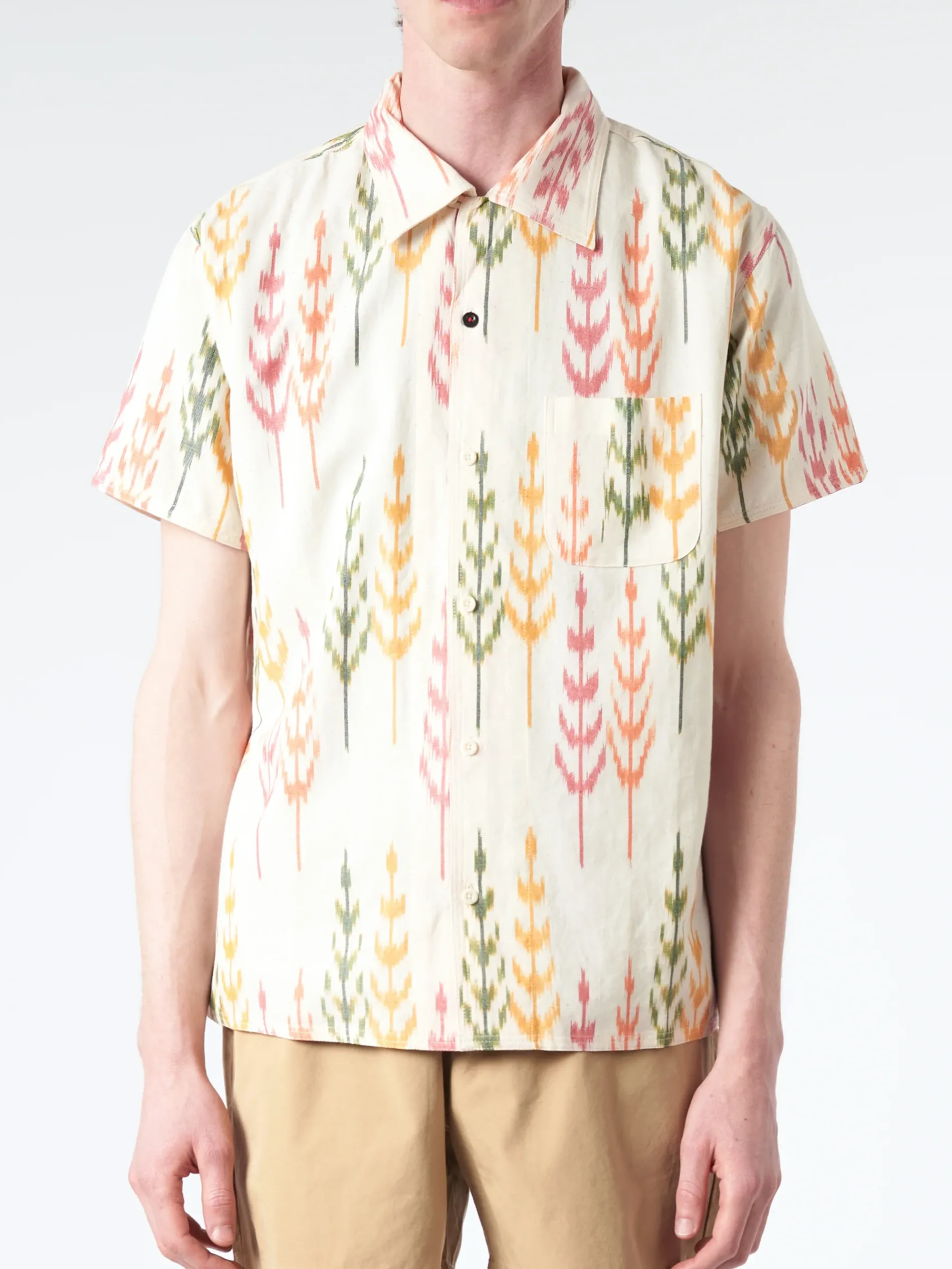 Boxy fit open collar shirt. Ikat is an ancient technique or resist and tie dying yarns in the warp and sometimes in the weft to create geometrical patterns in the fabric after the weaving process. Made by one tailor from beginning to end.